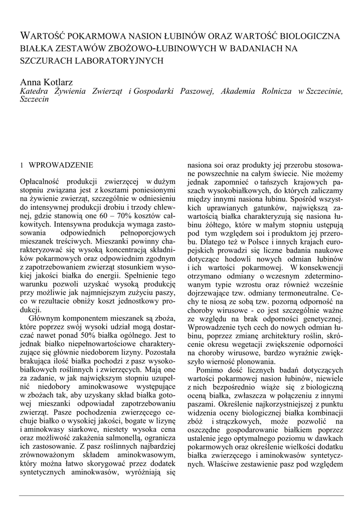 WARTOŚĆ POKARMOWA NASION ŁUBINÓW ORAZ WARTOŚĆ BIOLOGICZNA BIAŁKA ZESTAWÓW ZBOŻOWO-ŁUBINOWYCH W BADANIACH NA SZCZURACH LABORATORYJNYCH Anna Kotlarz Katedra Żywienia Zwierząt i Gospodarki Paszowej, Akademia Rolnicza w Szczecinie, Szczecin 1 WPROWADZENIE Opłacalność produkcji zwierzęcej w dużym stopniu związana jest z kosztami poniesionymi na żywienie zwierząt, szczególnie w odniesieniu do intensywnej produkcji drobiu i trzody chlewnej, gdzie stanowią one 60 – 70% kosztów całkowitych. Intensywna produkcja wymaga zastosowania odpowiednich pełnoporcjowych mieszanek treściwych. Mieszanki powinny charakteryzować się wysoką koncentracją składników pokarmowych oraz odpowiednim zgodnym z zapotrzebowaniem zwierząt stosunkiem wysokiej jakości białka do energii. Spełnienie tego warunku pozwoli uzyskać wysoką produkcję przy możliwie jak najmniejszym zużyciu paszy, co w rezultacie obniży koszt jednostkowy produkcji. Głównym komponentem mieszanek są zboża, które poprzez swój wysoki udział mogą dostarczać nawet ponad 50% białka ogólnego. Jest to jednak białko niepełnowartościowe charakteryzujące się głównie niedoborem lizyny. Pozostała brakująca ilość białka pochodzi z pasz wysokobiałkowych roślinnych i zwierzęcych. Mają one za zadanie, w jak największym stopniu uzupełnić niedobory aminokwasowe występujące w zbożach tak, aby uzyskany skład białka gotowej mieszanki odpowiadał zapotrzebowaniu zwierząt. Pasze pochodzenia zwierzęcego cechuje białko o wysokiej jakości, bogate w lizynę i aminokwasy siarkowe, niestety wysoka cena oraz możliwość zakażenia salmonellą, ogranicza ich zastosowanie. Z pasz roślinnych najbardziej zrównoważonym składem aminokwasowym, który można łatwo skorygować przez dodatek syntetycznych aminokwasów, wyróżniają się nasiona soi oraz produkty jej przerobu stosowane powszechnie na całym świecie. Nie możemy jednak zapomnieć o tańszych krajowych paszach wysokobiałkowych, do których zaliczamy między innymi nasiona łubinu. Spośród wszystkich uprawianych gatunków, największą zawartością białka charakteryzują się nasiona łubinu żółtego, które w małym stopniu ustępują pod tym względem soi i produktom jej przerobu. Dlatego też w Polsce i innych krajach europejskich prowadzi się liczne badania naukowe dotyczące hodowli nowych odmian łubinów i ich wartości pokarmowej. W konsekwencji otrzymano odmiany o wczesnym zdeterminowanym typie wzrostu oraz również wcześnie dojrzewające tzw. odmiany termoneutralne. Cechy te niosą ze sobą tzw. pozorną odporność na choroby wirusowe - co jest szczególnie ważne ze względu na brak odporności genetycznej. Wprowadzenie tych cech do nowych odmian łubinu, poprzez zmianę architektury roślin, skrócenie okresu wegetacji zwiększenie odporności na choroby wirusowe, bardzo wyraźnie zwiększyło wierność plonowania. Pomimo dość licznych badań dotyczących wartości pokarmowej nasion łubinów, niewiele z nich bezpośrednio wiąże się z biologiczną oceną białka, zwłaszcza w połączeniu z innymi paszami. Określenie najkorzystniejszej z punktu widzenia oceny biologicznej białka kombinacji zbóż i strączkowych, może pozwolić na oszczędne gospodarowanie białkiem poprzez ustalenie jego optymalnego poziomu w dawkach pokarmowych oraz określenie wielkości dodatku białka zwierzęcego i aminokwasów syntetycznych. Właściwe zestawienie pasz pod względem Wartość pokarmowa nasion łubinów oraz wartość biologiczna białka zestawów zbożowo-łubinowych w badaniach na szczurach... jakości białka powinno przyczynić się do obniżenia kosztów produkcji mieszanek treściwych. 2 CEL BADAŃ Celem podjętych badań było poznanie: − wartości pokarmowej nasion najbardziej wartościowych zdaniem hodowców odmian łubinów, różniących się architekturą i tempem wzrostu roślin wchodzących do uprawy w momencie rozpoczęcia badań − biologicznej wartości białka nasion wybranych odmian spośród trzech gatunków łubinu oraz czterech gatunków zbóż (jęczmienia, pszenicy, pszenżyta i żyta) − z którymi z czterech zbóż wybrane odmiany łubinów, będą się najlepiej uzupełniały pod względem jakości białka w zestawach paszowych zbożowo-łubinowych ocenianych na szczurach laboratoryjnych. 3 MATERIAŁ I METODY Podstawowy materiał doświadczalny stanowiły nasiona 9 odmian łubinów pastewnych, reprezentujące wszystkie trzy uprawiane w Polsce gatunki tych roślin. Spośród łubinów żółtych do oceny wytypowano odmiany Amulet, Juno, Manru, Parys, Popiel, Radames i Teo. Łubin biały reprezentowała odmiana Bardo, a wąskolistny Sur. Wymienione odmiany żółtego łubinu zaliczane są do dwóch typów morfologicznych: tradycyjnego (konwencjonalnego), w obrębie którego wyróżnia się rośliny o tradycyjnej strukturze i tempie wzrostu (Amulet, Parys) oraz rośliny termoneutralne o tradycyjnej strukturze i szybkim tempie wzrostu, wcześnie dojrzewające (Juno, Popiel, Teo) i epigonalnego typu roślin samokończących wegetację, o zredukowanych rozgałęzieniach łodyg i równomiernie dojrzewających nasionach (Manru, Radames). Nasiona pochodziły z trzech kolejnych lat zbiorów 1992–1994, z Poznańskiej Hodowli Roślin – SHR Wiatrowo oraz z Instytutu Hodowli i Aklimatyzacji Roślin – ZDHR Przebędowo. Oprócz nasion łubinów materiał doświadczalny stanowiło również ziarno 4 gatunków zbóż: jęczmienia (Kroton), pszenicy (Olcha), pszenżyta (Presto), żyta (Dańkowskie Złote) zakupione w Centrali Nasiennej w Gryfinie. 3.1 Oznaczenia chemiczne Podstawowy skład chemiczny ocenianych nasion łubinów oraz zbóż oznaczono metodami konwencjonalnymi. Celulozę izolowano z paszy mieszaniną kwasów octowego i azotowego, a ligninę – stężonymi kwasami siarkowym i solnym (Jacyno i wsp. 1983). Pentozany oznaczono metodą orcynowa opisaną przez Majbaum–Katzenellenbogen (1969)
