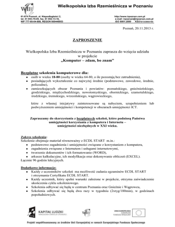 Wielkopolska Izba Rzemieślnicza w Poznaniu 61-874 Poznań, al. Niepodległości 2, tel. 61 853-78-05, fax. 61 852-13-16, NIP 777-00-04-888, REGON 000448953 http://www.irpoznan.com.pl e-mail: [email protected] ISO 9001:2000 KSU15/13/2005/165 Poznań, 20.11.2013 r. ZAPROSZENIE Wielkopolska Izba Rzemieślnicza w Poznaniu zaprasza do wzięcia udziału w projekcie „Komputer – zdam, bo znam” Bezpłatne szkolenia komputerowe dla: osób w wieku 18-80 (osoby w wieku 64-80, o ile pozostają bez zatrudnienia), posiadających wykształcenie co najwyżej średnie (podstawowe, zawodowe, średnie, policealne), zamieszkujących obszar Poznania i powiatów: poznańskiego, gnieźnieńskiego, grodziskiego, międzychodzkiego, nowotomyskiego, obornickiego, szamotulskiego, średzkiego, śremskiego, wrzesińskiego, wągrowieckiego, które z własnej inicjatywy zainteresowane są nabyciem, uzupełnieniem lub podwyższeniem umiejętności i kompetencji w obszarach umiejętności ICT. Zapraszamy do skorzystania z bezpłatnych szkoleń, które podniosą Państwa umiejętności korzystania z komputera i Internetu – umiejętności niezbędnych w XXI wieku. Zakres szkolenia: Szkolenie obejmuje materiał równoważny z ECDL START m.in.: podstawowe zagadnienia i umiejętności związane z korzystaniem z komputera, zagadnienia związane z Internetem i usługami internetowymi, tworzenie dokumentów i ich formatowanie (WORD), arkusze kalkulacyjne, ich modyfikacja oraz dokonywanie obliczeń (EXCEL). Łącznie 96 godzin lekcyjnych. Dodatkowe informacje: Każdy z uczestników szkoleń ma możliwość zadania egzaminów ECDL START i otrzymania Certyfikatu ECDL START. Każdy uczestnik, który spełni warunki założone w projekcie, otrzyma zaświadczenie ukończenia cyklu szkoleniowego. Szkolenia odbywać się będą w centrum Poznania oraz Gnieźnie i Wągrowcu, Szkolenia odbywać się będą dwa razy w tygodniu (2xtyg/180min), w godzinach popołudniowych. Wielkopolska Izba Rzemieślnicza w Poznaniu 61-874 Poznań, al. Niepodległości 2, tel. 61 853-78-05, fax. 61 852-13-16, NIP 777-00-04-888, REGON 000448953 http://www.irpoznan.com.pl e-mail: [email protected] ISO 9001:2000 KSU15/13/2005/165 Wszystkie informacje o projekcie oraz regulamin rekrutacji i uczestnictwa znajdują się na stronie www.irpoznan.com.pl/komputer Pytania prosimy kierować do biura projektu pod adresem: Wielkopolska Izba Rzemieślnicza w Poznaniu/ pokój nr 3 Al. Niepodległości 2, 61-874 Poznań Tel. (61) 859 35 37 E-mail: [email protected] Aby wziąć udział w projekcie należy: 1. Wypełnić załączony formularz zgłoszeniowy i ankietę samooceny. 2. Dostarczyć ww. dokumenty do biura projektu: osobiście, pocztą, faksem, e-mailem do dnia 6.12.2013 r. 3. O zakwalifikowaniu się do projektu poinformujemy Państwa do dnia 10.12.2013 r. 4. Uzupełnić w terminie do 17.12.2013 r. wymagane dokumenty uczestnika oraz podpisać umowę szkoleniową. Pierwsza edycja już w styczniu! Nie zwlekaj! Zgłoś się już teraz! Ilość miejsc ograniczona! Serdecznie zapraszamy! Z poważaniem, Natalia Krzyżan Koordynator Projektu „Komputer - zdam, bo znam” -------------------------------------------------------------------------------Wielkopolska Izba Rzemieślnicza w Poznaniu al. Niepodległości 2 61-874 Poznań Tel: 61 853 78 05 wew.237 Tel: 61 859 35 37 e-mail: [email protected] www.irpoznan.com.pl