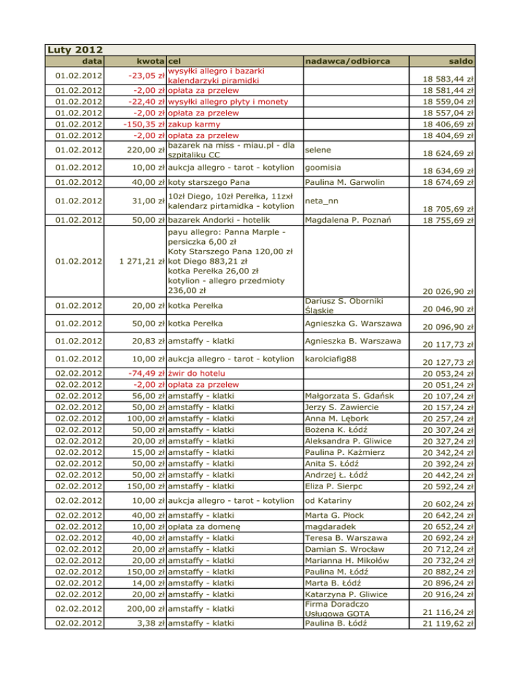 Luty 2012 data 01.02.2012 kwota cel wysyłki allegro i bazarki -23,05 zł kalendarzyki piramidki -2,00 zł opłata za przelew 01.02.2012 -22,40 zł wysyłki allegro płyty i monety 01.02.2012 01.02.2012 01.02.2012 01.02.2012 01.02.2012 nadawca/odbiorca 18 583,44 zł 18 581,44 zł 18 559,04 zł -2,00 zł opłata za przelew 18 557,04 zł -150,35 zł zakup karmy -2,00 zł opłata za przelew bazarek na miss - miau.pl - dla 220,00 zł szpitaliku CC saldo 18 406,69 zł 18 404,69 zł selene 18 624,69 zł 01.02.2012 10,00 zł aukcja allegro - tarot - kotylion goomisia 18 634,69 zł 01.02.2012 40,00 zł koty starszego Pana Paulina M. Garwolin 18 674,69 zł 01.02.2012 31,00 zł 01.02.2012 50,00 zł bazarek Andorki - hotelik 01.02.2012 10zł Diego, 10zł Perełka, 11zxł kalendarz pirtamidka - kotylion neta_nn 18 705,69 zł Magdalena P. Poznań payu allegro: Panna Marple persiczka 6,00 zł Koty Starszego Pana 120,00 zł 1 271,21 zł kot Diego 883,21 zł kotka Perełka 26,00 zł kotylion - allegro przedmioty 236,00 zł 18 755,69 zł 20 026,90 zł 01.02.2012 20,00 zł kotka Perełka Dariusz S. Oborniki Śląskie 01.02.2012 50,00 zł kotka Perełka Agnieszka G. Warszawa 20 096,90 zł 01.02.2012 20,83 zł amstaffy - klatki Agnieszka B. Warszawa 20 117,73 zł 01.02.2012 10,00 zł aukcja allegro - tarot - kotylion karolciafig88 20 127,73 zł 02.02.2012 -74,49 zł żwir do hotelu 20 046,90 zł 20 053,24 zł 02.02.2012 -2,00 zł opłata za przelew 02.02.2012 56,00 zł amstaffy - klatki Małgorzata S. Gdańsk 20 107,24 zł 02.02.2012 50,00 zł amstaffy - klatki Jerzy S. Zawiercie 20 157,24 zł 02.02.2012 100,00 zł amstaffy - klatki Anna M. Lębork 20 257,24 zł 02.02.2012 50,00 zł amstaffy - klatki Bożena K. Łódź 20 307,24 zł 02.02.2012 20,00 zł amstaffy - klatki Aleksandra P. Gliwice 20 327,24 zł 02.02.2012 15,00 zł amstaffy - klatki Paulina P. Każmierz 20 342,24 zł 02.02.2012 50,00 zł amstaffy - klatki Anita S. Łódź 20 392,24 zł 02.02.2012 50,00 zł amstaffy - klatki Andrzej Ł. Łódź 20 442,24 zł 02.02.2012 150,00 zł amstaffy - klatki Eliza P. Sierpc 20 592,24 zł 20 051,24 zł 02.02.2012 10,00 zł aukcja allegro - tarot - kotylion od Katariny 20 602,24 zł 02.02.2012 40,00 zł amstaffy - klatki Marta G. Płock 20 642,24 zł 02.02.2012 10,00 zł opłata za domenę magdaradek 20 652,24 zł 02.02.2012 40,00 zł amstaffy - klatki Teresa B. Warszawa 20 692,24 zł 02.02.2012 20,00 zł amstaffy - klatki Damian S. Wrocław 20 712,24 zł 02.02.2012 20,00 zł amstaffy - klatki Marianna H. Mikołów 20 732,24 zł 02.02.2012 150,00 zł amstaffy - klatki Paulina M. Łódź 20 882,24 zł 02.02.2012 14,00 zł amstaffy - klatki Marta B. Łódź 20 896,24 zł 02.02.2012 20,00 zł amstaffy - klatki 20 916,24 zł 02.02.2012 200,00 zł amstaffy - klatki 02.02.2012 3,38 zł amstaffy - klatki Katarzyna P. Gliwice Firma Doradczo Usługowa GOTA Paulina B. Łódź 21 116,24 zł 21 119,62 zł 02.02.2012 20,00 zł amstaffy - klatki Joanna P. Bydgoszcz 21 139,62 zł 02.02.2012 50,00 zł amstaffy - klatki 21 189,62 zł 02.02.2012 36,00 zł amstaffy - klatki Ewa F. Zgorzelec Jacek M. i Karolina R. Świnoujście 02.02.2012 100,00 zł amstaffy - klatki Katarzyna G. Warszawa 21 325,62 zł 02.02.2012 50,00 zł kotka Pererłka Aleksandra M. Namysłów 21 375,62 zł 02.02.2012 50,00 zł amstaffy - klatki Katarzyna G. Warszawa 21 425,62 zł 02.02.2012 20,00 zł amstaffy - klatki Magdalena B. Pabianice 21 445,62 zł 02.02.2012 10,00 zł allegro aukcja charytatywna zaba1410 21 455,62 zł 02.02.2012 sylwiazuchowska 21 459,62 zł 02.02.2012 70,00 zł amstaffy - klatki Mirosława S. Łódź 21 529,62 zł 02.02.2012 10,00 zł allegro aukcja charytatywna ada296 21 539,62 zł 02.02.2012 40,00 zł amstaffy - klatki Joanna K. Andrespol 21 579,62 zł 02.02.2012 30,00 zł amstaffy - klatki Danuta W. Łódź 21 609,62 zł 02.02.2012 100,00 zł amstaffy - klatki Jolanta D. Gdynia 21 709,62 zł 02.02.2012 20,00 zł amstaffy - klatki Agata N. Nysa 21 729,62 zł 02.02.2012 50,00 zł amstaffy - klatki Tomasz Ś. Łódź 21 779,62 zł 02.02.2012 60,00 zł amstaffy - klatki 21 839,62 zł 02.02.2012 14,00 zł amstaffy - klatki 03.02.2012 200,00 zł amstaffy - klatki Tomasz K. Zawiercie Jacek M. i Karolina R. Świnoujście Jacek I. Zgierz 03.02.2012 50,00 zł amstaffy - klatki Maria B. Łódź 22 103,62 zł 03.02.2012 50,00 zł Panna Marple - persiczka Justyna P. Toruń 22 153,62 zł 03.02.2012 40,00 zł Grupa Kotylion Katarzyna B. Łódź 22 193,62 zł 03.02.2012 20,00 zł amstaffy - klatki Michał M. Łódź 22 213,62 zł 03.02.2012 20,00 zł amstaffy - klatki Magdalena K. Łóź 22 233,62 zł 03.02.2012 15,00 zł amstaffy - klatki Mateusz C. Olsztyn 22 248,62 zł 03.02.2012 20,00 zł amstaffy - klatki 22 268,62 zł 03.02.2012 100,00 zł amstaffy - klatki 03.02.2012 20,00 zł amstaffy - klatki Joanna A. Lutomiersk Abapat Biuro Patentowe Rybnik Piotr D. Łódź 03.02.2012 30,00 zł amstaffy - klatki Katarzyna P. Łódź 22 418,62 zł 03.02.2012 200,00 zł amstaffy - klatki Monika K.-W. Sulejówek 22 618,62 zł 03.02.2012 20,00 zł amstaffy - klatki Beata Ż. Łódź 22 638,62 zł 03.02.2012 30,00 zł amstaffy - klatki Aleksandra Z. Łódź 22 668,62 zł 03.02.2012 49,00 zł amstaffy - klatki Krzysztof S. Wrocław 22 717,62 zł 06.02.2012 50,00 zł Panna Marple - persiczka Ewa L. Warszawa 22 767,62 zł 06.02.2012 10,00 zł pchli targ - rybcie - kotylion rybcie 22 777,62 zł 06.02.2012 Dorota B. Łódź 22 787,62 zł maykaw 22 827,62 zł 06.02.2012 10,00 zł amstaffy - klatki bazarek Andorki - kociaki w 40,00 zł hoteliku 10,00 zł amstaffy - klatki Joanna L. Łódź 22 837,62 zł 06.02.2012 80,00 zł koty z Sokolnik i hoteliku Katarzyna T. Łódź 22 917,62 zł 06.02.2012 50,00 zł amstaffy - klatki Ewa S. Łódź 22 967,62 zł 06.02.2012 50,00 zł kot Diego Ewa L. Warszawa 23 017,62 zł 06.02.2012 50,00 zł amstaffy - klatki Anna S. Warszawa 23 067,62 zł 06.02.2012 50,00 zł koty w szpitaliku CC Monika D. Łódź 23 117,62 zł 06.02.2012 