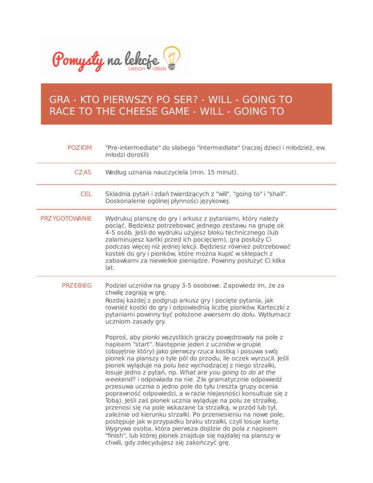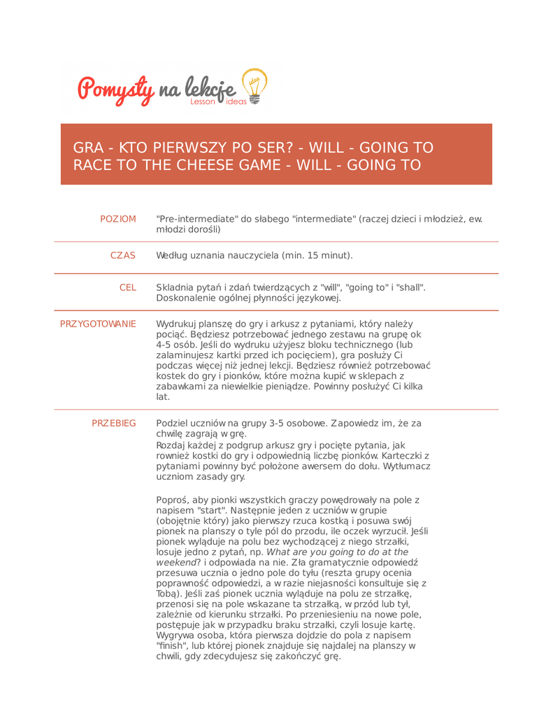 GRA - KTO PIERWSZY PO SER? - WILL - GOING TO RACE TO THE CHEESE GAME - WILL - GOING TO POZIOM CZAS CEL "Pre-intermediate" do słabego "intermediate" (raczej dzieci i młodzież, ew. młodzi dorośli) Według uznania nauczyciela (min. 15 minut). Skladnia pytań i zdań twierdzących z "will", "going to" i "shall". Doskonalenie ogólnej płynności językowej. PRZYGOTOWANIE Wydrukuj planszę do gry i arkusz z pytaniami, który należy pociąć. Będziesz potrzebować jednego zestawu na grupę ok 4-5 osób. Jeśli do wydruku użyjesz bloku technicznego (lub zalaminujesz kartki przed ich pocięciem), gra posłuży Ci podczas więcej niż jednej lekcji. Będziesz również potrzebować kostek do gry i pionków, które można kupić w sklepach z zabawkami za niewielkie pieniądze. Powinny posłużyć Ci kilka lat. PRZEBIEG Podziel uczniów na grupy 3-5 osobowe. Zapowiedz im, że za chwilę zagrają w grę. Rozdaj każdej z podgrup arkusz gry i pocięte pytania, jak rownież kostki do gry i odpowiednią liczbę pionków. Karteczki z pytaniami powinny być położone awersem do dołu. Wytłumacz uczniom zasady gry. Poproś, aby pionki wszystkich graczy powędrowały na pole z napisem "start". Następnie jeden z uczniów w grupie (obojętnie który) jako pierwszy rzuca kostką i posuwa swój pionek na planszy o tyle pól do przodu, ile oczek wyrzucił. Jeśli pionek wyląduje na polu bez wychodzącej z niego strzałki, losuje jedno z pytań, np. What are you going to do at the weekend? i odpowiada na nie. Zła gramatycznie odpowiedź przesuwa ucznia o jedno pole do tyłu (reszta grupy ocenia poprawność odpowiedzi, a w razie niejasności konsultuje się z Tobą). Jeśli zaś pionek ucznia wyląduje na polu ze strzałkę, przenosi się na pole wskazane ta strzałką, w przód lub tył, zależnie od kierunku strzałki. Po przeniesieniu na nowe pole, postępuje jak w przypadku braku strzałki, czyli losuje kartę. Wygrywa osoba, która pierwsza dojdzie do pola z napisem "finish", lub której pionek znajduje się najdalej na planszy w chwili, gdy zdecydujesz się zakończyć grę. Gra odbywa się we wszystkich podgrupach jednocześnie. Staraj się w miarę możliwości krążyć po klasie i monitorować pracę uczniów. Zakończ zabawę kiedy uznasz za stosowne (lub kiedy uczniowie się nią znudzą). Możesz na tym skończyć, ale jeśli masz jeszcze trochę czasu, możesz zwrócić uwagę uczniów na ich typowe błędy podsłuchane w czasie gry. Może dadzą radę sami je poprawić? ZAŁĄCZNIKI NOTATKI Wydrukuj planszę do gry i arkusz z pytaniami, który należy pociąć. Będziesz potrzebować jednego zestawu na grupę ok 4-5 osób. Jeśli do wydruku użyjesz bloku technicznego (lub zalaminujesz kartki przed ich pocięciem), gra posłuży Ci podczas więcej niż jednej lekcji. Będziesz również potrzebować kostek do gry i pionków, które można kupić w sklepach z zabawkami za niewielkie pieniądze. Powinny posłużyć Ci kilka lat.