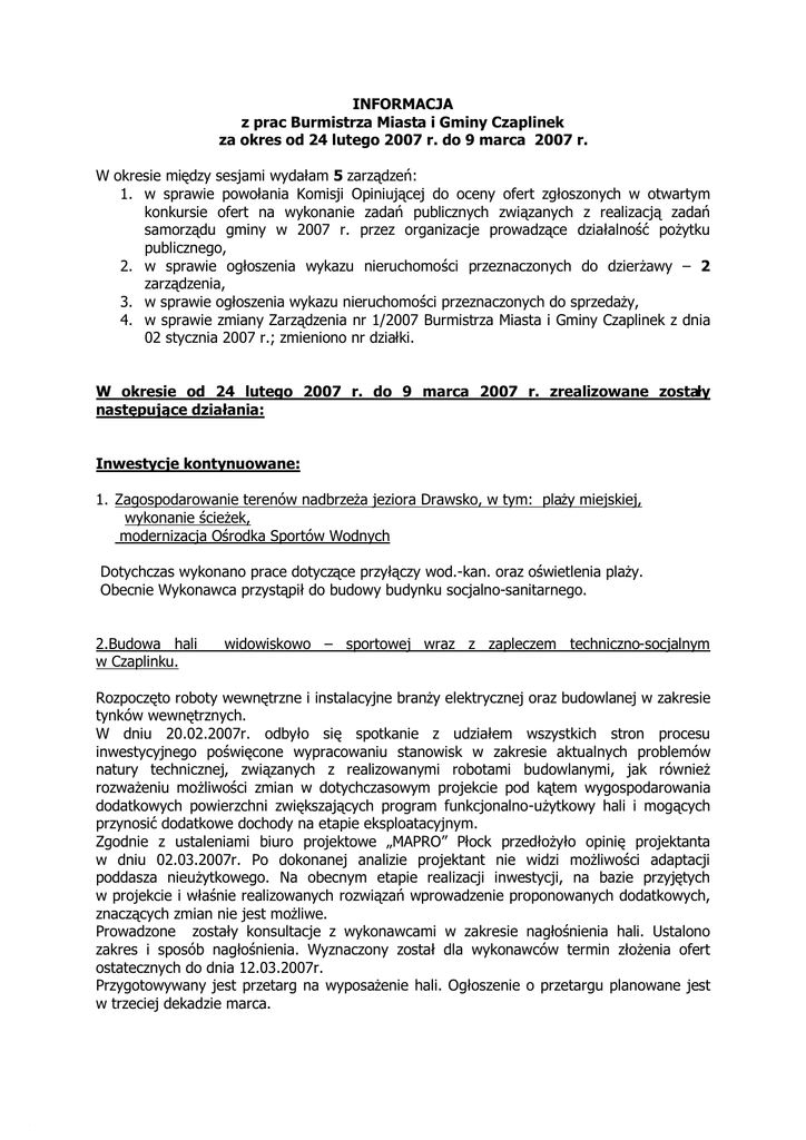INFORMACJA z prac Burmistrza Miasta i Gminy Czaplinek za okres od 24 lutego 2007 r. do 9 marca 2007 r. W okresie między sesjami wydałam 5 zarządzeń: 1. w sprawie powołania Komisji Opiniującej do oceny ofert zgłoszonych w otwartym konkursie ofert na wykonanie zadań publicznych związanych z realizacją zadań samorządu gminy w 2007 r. przez organizacje prowadzące działalność pożytku publicznego, 2. w sprawie ogłoszenia wykazu nieruchomości przeznaczonych do dzierżawy – 2 zarządzenia, 3. w sprawie ogłoszenia wykazu nieruchomości przeznaczonych do sprzedaży, 4. w sprawie zmiany Zarządzenia nr 1/2007 Burmistrza Miasta i Gminy Czaplinek z dnia 02 stycznia 2007 r.; zmieniono nr działki. W okresie od 24 lutego 2007 r. do 9 marca 2007 r. zrealizowane zostały następujące działania: Inwestycje kontynuowane: 1. Zagospodarowanie terenów nadbrzeża jeziora Drawsko, w tym: plaży miejskiej, wykonanie ścieżek, modernizacja Ośrodka Sportów Wodnych Dotychczas wykonano prace dotyczące przyłączy wod.-kan. oraz oświetlenia plaży. Obecnie Wykonawca przystąpił do budowy budynku socjalno-sanitarnego. 2.Budowa hali w Czaplinku. widowiskowo – sportowej wraz z zapleczem techniczno-socjalnym Rozpoczęto roboty wewnętrzne i instalacyjne branży elektrycznej oraz budowlanej w zakresie tynków wewnętrznych. W dniu 20.02.2007r. odbyło się spotkanie z udziałem wszystkich stron procesu inwestycyjnego poświęcone wypracowaniu stanowisk w zakresie aktualnych problemów natury technicznej, związanych z realizowanymi robotami budowlanymi, jak również rozważeniu możliwości zmian w dotychczasowym projekcie pod kątem wygospodarowania dodatkowych powierzchni zwiększających program funkcjonalno-użytkowy hali i mogących przynosić dodatkowe dochody na etapie eksploatacyjnym. Zgodnie z ustaleniami biuro projektowe „MAPRO” Płock przedłożyło opinię projektanta w dniu 02.03.2007r. Po dokonanej analizie projektant nie widzi możliwości adaptacji poddasza nieużytkowego. Na obecnym etapie realizacji inwestycji, na bazie przyjętych w projekcie i właśnie realizowanych rozwiązań wprowadzenie proponowanych dodatkowych, znaczących zmian nie jest możliwe. Prowadzone zostały konsultacje z wykonawcami w zakresie nagłośnienia hali. Ustalono zakres i sposób nagłośnienia. Wyznaczony został dla wykonawców termin złożenia ofert ostatecznych do dnia 12.03.2007r. Przygotowywany jest przetarg na wyposażenie hali. Ogłoszenie o przetargu planowane jest w trzeciej dekadzie marca. 3. Zmiana miejscowego planu zagospodarowania przestrzennego miasta Czaplinka. Przygotowane zostały uchwały w sprawie zatwierdzenia zmian w miejscowym planie zagospodarowania przestrzennego miasta Czaplinka, które są na bieżącej Sesji przedłożone Radzie do uchwalenia. Inwestycje noworozpoczynane: 1. Budowa parkingu przy ul. Grunwaldzkiej w Czaplinku. Pozyskano mapę do celów projektowych. Zlecono wykonanie projektu budowlanego z kosztorysami i specyfikacjami technicznymi dla firmy Zakład Usług Projektowych – Wiesław Kot ze Złocieńca, za kwotę 3.900,-zł. Prace projektowe zostały wykonane i uzgodnione na Zespole Uzgadniania Dokumentacji w Starostwie Powiatowym w Drawsku Pomorskim. W dniu 02.03.2006r. złożono wniosek o wydanie pozwolenia na budowę, które powinniśmy uzyskać w przeciągu 2-ch tygodni. Z początkiem kwietnia przystąpimy do realizacji robót. Wybudowanie parkingu pozwoli na uzyskanie 47 miejsc postojowych. 2. Budowa sieci wod.-kan. i deszczowej na osiedlu „Wiejska”. Zinwentaryzowano zakres rzeczowy II etapu budowy infrastruktury technicznej. Przygotowano kosztorys inwestorski. Kompletowana jest dokumentacja przetargowa na wybór wykonawcy robót. Ogłoszenie o przetargu zostanie opublikowane do 15 marca br. 3. Budowa instalacji wodno-kanalizacyjnej na trasie St. Drawsko – Drahimek oraz na trasie Czaplinek - Łąka.. Przeprowadzone zostanie jedno postępowanie przetargowe na wybór wykonawcy robót całego zadania, tj,. budowy instalacji wodno-kanalizacyjnej na trasie St. Drawsko-Drahimek i na trasie Czaplinek – Łąka. Obecnie przygotowywane są dokumenty niezbędne do rozpoczęcia procedury przetargowej. Ogłoszenie o przetargu planowane jest w miesiącu kwietniu. Na zadanie dot. budowy sieci wod.-kan. do Drahimka Gmina posiada aktualne pozwolenie na budowę. W dniu 02.03.br. złożono do Starostwa Powiatowego wniosek o wydanie pozwolenia na budowę sieci wod.-kan. do m. Łąka. Termin wydania pozwolenia na budowę zgodnie z ustawą Prawo budowlane wynosi do 65 dni od dnia złożenia wniosku. 4. Modernizacja budynku szkoły na bibliotekę, GCI – przy ul. Wałeckiej 49. UMiG poszukuje możliwości pozyskania dofinansowania zewnętrznego na przeniesienie biblioteki publicznej i Gminnego Centrum Informacji do pomieszczeń w budynku przy ul. Wałeckiej 49, w którym zlokalizowane było wcześniej przedszkole. Na obecnym etapie przygotowywany jest zakres rzeczowy inwestycji oraz przygotowywane dokumenty w celu złożenia aplikacji o dotację ze środków zewnętrznych. W chwili obecnej ogłoszone są programy operacyjne Ministra Kultury i Dziedzictwa Narodowego, które są podstawą do ubiegania się o dotacje na zadania z zakresu kultury. Najbliższy termin składania wniosków o dotacje z tego programu upływa 10 kwietnia br. 5. Analiza aktualności planów miejscowych oraz studium uwarunkowań i kierunków zagospodarowania przestrzennego gminy Czaplinek. Wykonane zostało opracowanie zawierające analizę stanu aktualności planów miejscowych oraz studium uwarunkowań i kierunków zagospodarowania przestrzennego gminy. Opracowanie to w najbliższym czasie zostanie przedłożone Radnym w celu określenia rodzaju i zakresu opracowań planistycznych przewidzianych do wykonania w 2007 roku, na podstawie złożonych wniosków. W zakresie drogownictwa: 1. W porozumieniu z Zachodniopomorskim Zarządem Dróg Wojewódzkich w Koszalinie – Rejon Dróg Woje