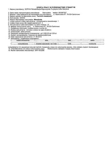 OFERTA PRACY W POŚREDNICTWIE OTWARTYM 1. Nazwa pracodawcy: SOPHIA Rehabilitacja-Wypoczynek-Turystyka Zofia Starybrat 2. Dane osoby reprezentującej pracodawcę: Stanowisko: telefon: 603067267 3. Miejsce i czas zgłaszania się kandydatów do pracodawcy: ul. Nadmorska 97, 76-034 Sarbinowo 4. Nazwa zawodu na stanowisku pracy: T echnik masażysta* 5. Kod zawodu: 325402 6. Nazwa oferowanego stanowiska: Masażysta 7. Liczba wolnych miejsc zatrudnienia - przygotowania zawodowego: 1 8. Liczba miejsc pracy dla niepełnosprawnych: 0 9. Wnioskowana liczba kandydatów na jedno miejsce: 10 10. Miejsce wykonywania pracy: ul. Nadmorska 97, 76-034 Sarbinowo 11. Dodatkowe informacje: możliwa praca w wolne dni 12. Rodzaj zatrudnienia: Umowa o prace na czas określony 13. Zmianowość: jedna zmiana 14. Wysokość wynagrodzenia (miesięcznie): od 2 300,00 do 0,00 zł. 15. System wynagradzania: Czasowy ze stawką godzinową 16. Data rozpoczęcia zatrudnienia: 21.08.2015 Wymaaania - oczekiwania oracodawcy: staż I rodzai wymaaania I I ODiS. ............... I waaa I________ wykształcenie________ I średnie zawodowe, typ: brak I___________ 0.00___________ L ___ ____ konieczne__ . wykształcenie min zawodowe kierunek technik masażysta, prawo do wykonywnia zawodu, mile widziany dyplom fizjoterapeuty 18. Charakterystyka lub rodzaj wykonywanej pracy: Wykonywanie zabiegów masażu leczniczego 19. Numer stanowiska oferowanego: StPr/15/2299 I