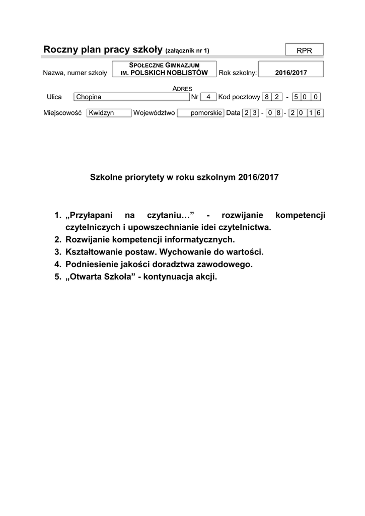 Roczny plan pracy szkoły (załącznik nr 1) Nazwa, numer szkoły Ulica Chopina Miejscowość Kwidzyn SPOŁECZNE GIMNAZJUM IM. POLSKICH NOBLISTÓW ADRES Nr Województwo 4 RPR Rok szkolny: 2016/2017 Kod pocztowy 8 2 - 5 0 0 pomorskie Data 2 3 - 0 8 - 2 0 1 6 Szkolne priorytety w roku szkolnym 2016/2017 1. „Przyłapani na czytaniu…” - rozwijanie kompetencji czytelniczych i upowszechnianie idei czytelnictwa. 2. Rozwijanie kompetencji informatycznych. 3. Kształtowanie postaw. Wychowanie do wartości. 4. Podniesienie jakości doradztwa zawodowego. 5. „Otwarta Szkoła” - kontynuacja akcji. PRIORYTET 1 ZADANIE I: „Przyłapani na czytaniu…” - rozwijanie kompetencji czytelniczych i upowszechnianie idei czytelnictwa. SPODZIEWANE PODNIESIENIE POZIOMU CZYTELNICTWA GIMNAZJALISTÓW, EFEKTY: WZMOCNIENIE MOTYWACJI UCZNIÓW DO SIĘGANIA PO AMBITNĄ LEKTURĘ, WYŻSZA KULTURA ŻYWEGO SŁOWA WŚRÓD MŁODZIEŻY, UZYSKANIE WYŻSZYCH WYNIKÓW EGZAMINU GIMNAZJALNEGO DZIAŁANIA PROWADZĄCE DO UZYSKANIA SPODZIEWANYCH EFEKTÓW. LP. DZIAŁANIA TERMIN OSOBY ODPOWIEDZIALNE 1. Popularyzacja akcji „Przyłapani na czytaniu”. Cały rok 2. Organizacja wystaw promujących czytelnictwo. Współpraca z Miejską Biblioteką w ramach lekcji bibliotecznych – przybliżenie oferty czytelniczej. Udział w wykładach ze współczesnymi pisarzami. Cały rok Organizacja konkursów literackich. Cały rok 3. 4. 5. Cały rok Cały rok Nauczyciele j. polskiego Nauczyciele j. polskiego Nauczyciele j. polskiego, wychowawcy Nauczyciele j. polskiego Nauczyciele j. polskiego PRIORYTET 2 ZADANIE I: Doskonalenie umiejętności informatycznych uczniów. SPODZIEWANE UCZNIOWIE POSIADAJĄ KOMPETENCJE INFORMATYCZNE I SKUTECZNIE SIĘ MINI POSŁUGUJĄ EFEKTY: DZIAŁANIA PROWADZĄCE DO UZYSKANIA SPODZIEWANYCH EFEKTÓW. LP. 1. 2. 3. 4. 5. 6. OSOBY DZIAŁANIA TERMIN Wykorzystanie technologii informacyjnej na wszystkich zajęciach edukacyjnych (prezentacje, filmy edukacyjne, tablice multimedialne). Realizacja różnorodnych projektów uczniowskich z wykorzystaniem TIK. Realizacja autorskiego programu pilotażowego dotyczącego wdrożeniu programowania w edukacji „Rozprawprogramuj się z problemem” Wykorzystanie technologii informacyjnej na lekcjach języków obcych: - korzystanie z platform do nauki słownictwa (InstaLing, MyEnglishLab, inne), - korzystanie z komunikatorów i portali społecznościowych do realizacji projektów językowych. Udział uczniów w szkolnych i pozaszkolnych konkursach i olimpiadach informatycznych. Internetowy savoir-vivre: - cyberprzemoc – jak być bezpiecznym w sieci, - „Twoje dane, twoja sprawa” – projekt GIODO Projekty eTwinning Cały rok Nauczyciele przedmiotów Cały rok Nauczyciele przedmiotów Cały rok Nauczyciele języków obcych Cały rok Cały rok Nauczyciel informatyki Wszyscy nauczyciele, pedagog Cały rok A. Baas ODPOWIEDZIALNE PRIORYTET 3 ZADANIE I: Wzmocnienie działalności wychowawczej szkoły, ze szczególnym uwzględnieniem wychowania patriotycznego, obywatelskiego i regionalnego. SPODZIEWANE UCZNIOWIE MAJĄ POCZUCIE TOŻSAMOŚCI NARODOWEJ I REGIONALNEJ, ZNAJĄ HISTORIĘ MIEJSC PAMIĘCI NARODOWEJ, EFEKTY: Z SZACUNKIEM ODNOSZĄ SIĘ DO SYMBOLI NARODOWYCH I SZKOŁY, POGŁĘBIAJĄ WIEDZĘ O PATRONIE I PROMUJĄ JEGO SYLWETKĘ, POSTAWY WŚRÓD SPOŁECZNOŚCI LOKALNEJ. NAWIĄZUJĄ KONTAKTY Z MŁODZIEŻĄ W CELU PROMOCJI WŁASNEGO REGIONU. DZIAŁANIA PROWADZĄCE DO UZYSKANIA SPODZIEWANYCH EFEKTÓW. LP. DZIAŁANIA 1. 2. 3. 4. 5. 6. 7. 8. Organizowanie wycieczek do miejsc pamięci narodowej. Organizowanie apeli i uroczystości o treściach patriotycznych. Udział młodzieży w obchodach świąt państwowych („dyżur patriotyczny”). Realizowanie treści patriotycznych na lekcjach przedmiotowych i wychowawczych wg planów. Realizacja programu wychowawczo profilaktycznego promującego szacunek i tolerancję dla drugiego człowieka. Działania związane z pogłębianiem wiedzy na temat sylwetki patrona i upowszechnianie jej wśród uczniów innych szkół. Kultywowanie tradycji szkolnych. Jubileuszowe obchody powstania Kwidzyńskich Szkół Społecznych. Przygotowanie do roli aktywnego i odpowiedzialnego współgospodarza kraju, regionu, miasta, szkoły. Kształtowanie postawy szacunku dla innych kultur i tradycji historycznych (Erasmus+, inne imprezy językowe) TERMIN OSOBA ODPOWIEDZIALNA Cały rok Wychowawcy Wg kalendarza Nauczyciele, wychowawcy, Kl.2 SG Nauczyciele i wychowawcy Rada pedagogiczna Cały rok Cały rok Cały rok Rada pedagogiczna Grudzień Zespół organizacyjny Rada pedagogiczna, SU A. Baas, A. Perehuda Nauczyciele języków obcych Cały rok Cały rok PRIORYTET 4 ZADANIE I: Podniesienie świadomości w zakresie zawodoznawstwa. SPODZIEWANE UCZNIOWIE NABYWAJĄ ŚWIADOMOŚCI EFEKTY: PRZYSZŁEJ ŚCIEŻKI ZAWODOWEJ. JAK WAŻNY JEST WYBÓR DZIAŁANIA PROWADZĄCE DO UZYSKANIA SPODZIEWANYCH EFEKTÓW. LP. 1. 2. 3. 4. 5. 6. 7. DZIAŁANIA TERMIN Przygotowanie do świadomego podejmowania decyzji i budowania swojej drogi zawodowej. Kształcenie umiejętności rozpoznawania zasobów osobistych i wykorzystanie ich w planowaniu kariery edukacyjnej lub zawodowej. Kształcenie umiejętności prezentowania siebie, swojej wiedzy i umiejętności. Warsztaty z doradcą zawodowym z PPP. Cały rok Przygotowanie rodziców do efektywnego wspierania dzieci w podejmowaniu przez nie decyzji edukacyjnych i zawodowych – warsztaty dla rodziców z doradcą zawodowym z PPP. „Szkoła blisko pracy” – udział w warsztatach z elektroniki i robotyki – współpraca z Lacroix i CKUiZ w Kwidzynie Ekonomia na co dzień w szkole – współpraca z Fundacją Młodzieżowej Przedsiębiorczości Styczeń Cały rok Cały rok Listopad OSOBA ODPOWIEDZIALNA Wychowawcy i pedagog Wychowawcy i pedagog Wychowawcy i pedagog Wychowawcy i pedagog Wychowawcy i pedagog IX2016V2017 Wychowawcy klas III i pedagog Cały rok Wychowawcy PRIORYTET 5 ZADANIE I: „Otwarta Szkoła” kontynuacja akcji. SPODZIEWANE PODNIES