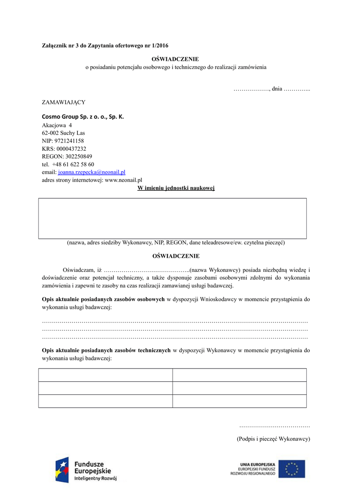 Załącznik nr 3 do Zapytania ofertowego nr 1/2016 OŚWIADCZENIE o posiadaniu potencjału osobowego i technicznego do realizacji zamówienia ………………, dnia ………….. ZAMAWIAJĄCY Cosmo Group Sp. z o. o., Sp. K. Akacjowa 4 62-002 Suchy Las NIP: 9721241158 KRS: 0000437232 REGON: 302250849 tel. +48 61 622 58 60 email: [email protected] adres strony internetowej: www.neonail.pl W imieniu jednostki naukowej (nazwa, adres siedziby Wykonawcy, NIP, REGON, dane teleadresowe/ew. czytelna pieczęć) OŚWIADCZENIE Oświadczam, iż ……………………………………..(nazwa Wykonawcy) posiada niezbędną wiedzę i doświadczenie oraz potencjał techniczny, a także dysponuje zasobami osobowymi zdolnymi do wykonania zamówienia i zapewni te zasoby na czas realizacji zamawianej usługi badawczej. Opis aktualnie posiadanych zasobów osobowych w dyspozycji Wnioskodawcy w momencie przystąpienia do wykonania usługi badawczej: ……………………………………………………………………………………………………………………… ……………………………………………………………………………………………………………………… ……………………………………………………………………………………………………………………… Opis aktualnie posiadanych zasobów technicznych w dyspozycji Wykonawcy w momencie przystąpienia do wykonania usługi badawczej: ……………………………… (Podpis i pieczęć Wykonawcy)
