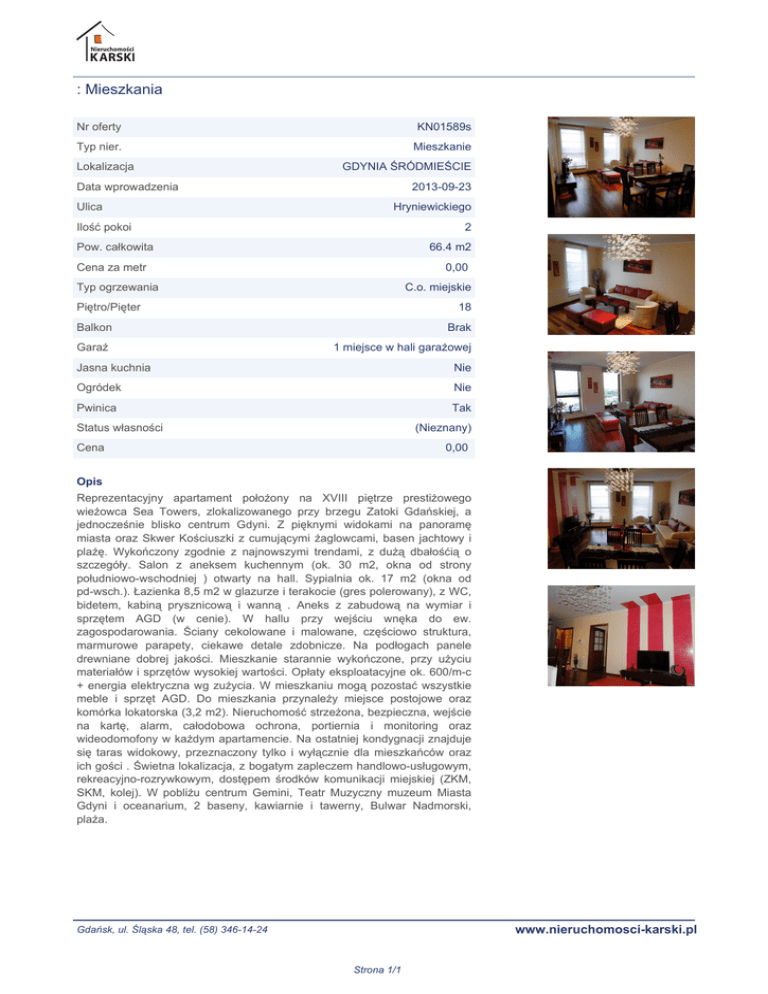 : Mieszkania Nr oferty KN01589s Typ nier. Mieszkanie Lokalizacja GDYNIA ŚRÓDMIEŚCIE Data wprowadzenia Ulica 2013-09-23 Hryniewickiego Ilość pokoi 2 Pow. całkowita 66.4 m2 Cena za metr 0,00 Typ ogrzewania C.o. miejskie Piętro/Pięter 18 Balkon Garaż Brak 1 miejsce w hali garażowej Jasna kuchnia Nie Ogródek Nie Pwinica Tak Status własności (Nieznany) Cena 0,00 Opis Reprezentacyjny apartament położony na XVIII piętrze prestiżowego wieżowca Sea Towers, zlokalizowanego przy brzegu Zatoki Gdańskiej, a jednocześnie blisko centrum Gdyni. Z pięknymi widokami na panoramę miasta oraz Skwer Kościuszki z cumującymi żaglowcami, basen jachtowy i plażę. Wykończony zgodnie z najnowszymi trendami, z dużą dbałośćią o szczegóły. Salon z aneksem kuchennym (ok. 30 m2, okna od strony południowo-wschodniej ) otwarty na hall. Sypialnia ok. 17 m2 (okna od pd-wsch.). Łazienka 8,5 m2 w glazurze i terakocie (gres polerowany), z WC, bidetem, kabiną prysznicową i wanną . Aneks z zabudową na wymiar i sprzętem AGD (w cenie). W hallu przy wejściu wnęka do ew. zagospodarowania. Ściany cekolowane i malowane, częściowo struktura, marmurowe parapety, ciekawe detale zdobnicze. Na podłogach panele drewniane dobrej jakości. Mieszkanie starannie wykończone, przy użyciu materiałów i sprzętów wysokiej wartości. Opłaty eksploatacyjne ok. 600/m-c + energia elektryczna wg zużycia. W mieszkaniu mogą pozostać wszystkie meble i sprzęt AGD. Do mieszkania przynależy miejsce postojowe oraz komórka lokatorska (3,2 m2). Nieruchomość strzeżona, bezpieczna, wejście na kartę, alarm, całodobowa ochrona, portiernia i monitoring oraz wideodomofony w każdym apartamencie. Na ostatniej kondygnacji znajduje się taras widokowy, przeznaczony tylko i wyłącznie dla mieszkańców oraz ich gości . Świetna lokalizacja, z bogatym zapleczem handlowo-usługowym, rekreacyjno-rozrywkowym, dostępem środków komunikacji miejskiej (ZKM, SKM, kolej). W pobliżu centrum Gemini, Teatr Muzyczny muzeum Miasta Gdyni i oceanarium, 2 baseny, kawiarnie i tawerny, Bulwar Nadmorski, plaża. www.nieruchomosci-karski.pl Gdańsk, ul. Śląska 48, tel. (58) 346-14-24 Strona 1/1