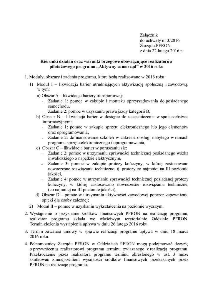 Załącznik do uchwały nr 3/2016 Zarządu PFRON z dnia 22 lutego 2016 r. Kierunki działań oraz warunki brzegowe obowiązujące realizatorów pilotażowego programu „Aktywny samorząd” w 2016 roku 1. Moduły, obszary i zadania programu, które będą realizowane w 2016 roku: 1) Moduł I – likwidacja barier utrudniających aktywizację społeczną i zawodową, w tym: a) Obszar A – likwidacja bariery transportowej: – Zadanie 1: pomoc w zakupie i montażu oprzyrządowania do posiadanego samochodu, – Zadanie 2: pomoc w uzyskaniu prawa jazdy kategorii B, b) Obszar B – likwidacja barier w dostępie do uczestniczenia w społeczeństwie informacyjnym: – Zadanie 1: pomoc w zakupie sprzętu elektronicznego lub jego elementów oraz oprogramowania, – Zadanie 2: dofinansowanie szkoleń w zakresie obsługi nabytego w ramach programu sprzętu elektronicznego i oprogramowania, c) Obszar C – likwidacja barier w poruszaniu się: – Zadanie 2: pomoc w utrzymaniu sprawności technicznej posiadanego wózka inwalidzkiego o napędzie elektrycznym, – Zadanie 3: pomoc w zakupie protezy kończyny, w której zastosowano nowoczesne rozwiązania techniczne, tj. protezy co najmniej na III poziomie jakości, – Zadanie 4: pomoc w utrzymaniu sprawności technicznej posiadanej protezy kończyny, w której zastosowano nowoczesne rozwiązania techniczne, (co najmniej na III poziomie jakości), d) Obszar D – pomoc w utrzymaniu aktywności zawodowej poprzez zapewnienie opieki dla osoby zależnej; 2) Moduł II – pomoc w uzyskaniu wykształcenia na poziomie wyższym. 2. Wystąpienie o przyznanie środków finansowych PFRON na realizację programu, realizator programu składa we właściwym terytorialnie Oddziale PFRON. Termin złożenia wystąpienia upływa w dniu 26 lutego 2016 roku. 3. Termin zawarcia umowy w sprawie realizacji programu upływa w dniu 18 marca 2016 roku. 4. Pełnomocnicy Zarządu PFRON w Oddziałach PFRON mogą podejmować decyzję o przywróceniu realizatorowi programu terminu związanego z realizacją programu. Przekroczenie przez realizatora programu terminu określonego w ust. 3 może skutkować zmniejszeniem wysokości środków finansowych przekazanych przez PFRON na realizację programu. 5. Warunkiem przystąpienia realizatora programu do realizacji programu jest złożenie oświadczenia o nieposiadaniu: 1) wymagalnych zobowiązań wobec PFRON, 2) zaległości w obowiązkowych wpłatach na PFRON, 3) wymagalnych zobowiązań wobec Zakładu Ubezpieczeń Społecznych i Urzędu Skarbowego oraz wobec organów i instytucji wykonujących zadania z zakresu administracji publicznej, przy czym ww. wymagania dotyczą jednostki organizacyjnej samorządu powiatowego odpowiedzialnej za realizację programu, a także jednostki organizacyjnej samorządu powiatowego składającej wystąpienie o przyznanie środków PFRON na realizację programu (o ile jest inna). 6. Z uczestnictwa w programie wyłączeni są wnioskodawcy oraz samorządy powiatowe, którzy/które po otrzymaniu dofinansowania ze środków PFRON na cele określone w ustawie z dnia 27 sierpnia 1997 roku o rehabilitacji zawodowej i społecznej oraz zatrudnianiu osób niepełnosprawnych (tekst jednolity: Dz. U. z 2011 r. Nr 127, poz. 721, z późn. zm.), w tym również w ramach programów zatwierdzonych przez Radę Nadzorczą PFRON, naruszyli/naruszyły warunki umowy (między innymi poprzez nieterminowe lub nienależyte wykonywanie zobowiązań wynikających z umowy) i nie doprowadzili/ nie doprowadziły do usunięcia uchybień do dnia złożenia wniosku (w przypadku wnioskodawcy) lub wystąpienia (w przypadku samorządu powiatowego). 7. W ramach działań promocyjnych realizator programu poinformuje o możliwości uzyskania wsparcia w module II przez osoby niepełnosprawne spełniające warunki uczestnictwa w programie, w szczególności co najmniej szkoły ponadgimnazjalne, w tym ośrodki szkolno-wychowawcze, szkoły specjalne oraz placówki z oddziałami integracyjnymi z terenu swojego działania. 8. Maksymalna kwota dofinansowania w ramach modułu I wynosi, w przypadku: 1) Obszaru A: a) w Zadaniu nr 1 – 5.000 zł, b) w Zadaniu nr 2 – 2.100 zł, w tym: – dla kosztów kursu i egzaminów – 1.500 zł, – dla pozostałych kosztów uzyskania prawa jazdy w przypadku kursu poza miejscowością zamieszkania wnioskodawcy (koszty związane z zakwaterowaniem, wyżywieniem i dojazdem w okresie trwania kursu) – 600 zł, 2) Obszaru B: a) w Zadaniu nr 1: – dla osoby niewidomej – 20.000 zł, z czego na urządzenia brajlowskie 12.000 zł, – dla pozostałych osób z dysfunkcją narządu wzroku – 8.000 zł, – dla osoby z dysfunkcją obu kończyn górnych – 5.000 zł, b) w Zadaniu nr 2: – dla osoby głuchoniewidomej – 4.000 zł, 2 dla pozostałych adresatów obszaru – 2.000 zł, z możliwością zwiększenia kwoty dofinansowania w indywidualnych przypadkach, maksymalnie o 100%, wyłącznie w przypadku, gdy poziom dysfunkcji narządu wzroku wymaga zwiększenia liczby godzin szkolenia, 3) Obszaru C: a) w Zadaniu nr 2 – 2.000 zł, b) w Zadaniu nr 3 dla protezy na III poziomie jakości, przy amputacji: – w zakresie ręki – 9.000 zł, – przedramienia – 20.000 zł, – ramienia i wyłuszczeniu w stawie barkowym – 26.000 zł, – na poziomie podudzia – 14.000 zł, – na wysokości uda (także przez staw kolanowy) – 20.000 zł, – uda i wyłuszczeniu w stawie biodrowym – 25.000 zł, z możliwością zwiększenia kwoty dofinansowania w wyjątkowych przypadkach i wyłącznie wtedy, gdy celowość zwiększenia jakości protezy do poziomu IV (dla zdolności do pracy wnioskodawcy), zostanie zarekomendowana przez eksperta PFRON, c) w Zadaniu nr 4 – do 30% kwot, o których mowa w lit. c, d) w Zadaniu nr 3 i nr 4 dla refundacji kosztów dojazdu beneficjenta programu na spotkanie z ekspertem PFRON lub kosztów dojazdu eksperta PFRON na spotkanie z beneficjentem programu – w zależności od poniesionych kosz