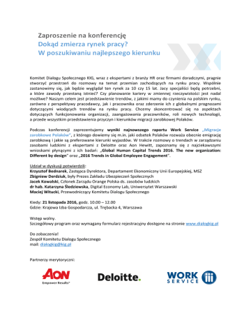 Komitet Dialogu Społecznego KIG, wraz z ekspertami z branży HR oraz firmami doradczymi, pragnie stworzyć przestrzeń do rozmowy na temat przemian zachodzących na rynku pracy. Wspólnie zastanowimy się, jak będzie wyglądał ten rynek za 10 czy 15 lat. Jacy specjaliści będą potrzebni, a które zawody przestaną istnieć? Czy planowanie kariery w zmiennej rzeczywistości jest nadal możliwe? Naszym celem jest przedstawienie trendów, z jakimi mamy do czynienia na polskim rynku, zarówno z perspektywy pracodawcy, jak i pracownika oraz zderzenie ich z globalnymi prognozami dotyczącymi wiodących trendów na rynku pracy. Chcemy skoncentrować się na aspektach dotyczących funkcjonowania organizacji, zaangażowania pracowników, roli nowych technologii, a przede wszystkim przedstawienia przyczyn i kierunków migracji zarobkowej Polaków. Podczas konferencji zaprezentujemy wyniki najnowszego raportu Work Service „Migracje zarobkowe Polaków”, z którego dowiemy się m.in. jaki odsetek Polaków rozważa obecnie emigrację zarobkową i jakie są preferowane kierunki wyjazdów. W trakcie rozmowy o trendach w zarządzaniu zasobami ludzkimi z ekspertami z Deloitte oraz Aon Hewitt, zapoznamy się z najciekawszymi wnioskami płynącymi z ich badań: „Global Human Capital Trends 2016. The new organization: Different by design” oraz „2016 Trends in Global Employee Engagement”. Udział w dyskusji potwierdzili: Krzysztof Bednarek, Zastępca Dyrektora, Departament Ekonomiczny Unii Europejskiej, MSZ Zbigniew Derdziuk, były Prezes Zakładu Ubezpieczeń Społecznych Jacek Kowalski, Członek Zarządu Orange Polska ds. zasobów ludzkich dr hab. Katarzyna Śledziewska, Digital Economy Lab, Uniwersytet Warszawski Maciej Witucki, Przewodniczący Komitetu Dialogu Społecznego Kiedy: 21 listopada 2016, godz. 10.00 – 12.00 Gdzie: Krajowa Izba Gospodarcza, ul. Trębacka 4, Warszawa Wstęp wolny. Szczegółowy program oraz wymagany formularz rejestracyjny dostępne na stronie www.dialogkig.pl Do zobaczenia! Zespół Komitetu Dialogu Społecznego mail: [email protected] Partnerzy merytoryczni: