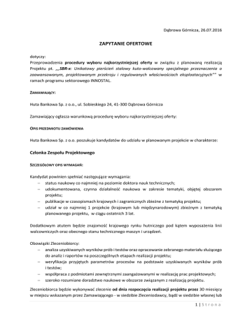 Dąbrowa Górnicza, 26.07.2016 ZAPYTANIE OFERTOWE dotyczy: Przeprowadzenia procedury wyboru najkorzystniejszej oferty w związku z planowaną realizacją Projektu pt. „„SBR-x: Unikatowy pierścień stalowy kuto-walcowany specjalnego przeznaczenia o zaawansowanym, projektowanym przekroju i regulowanych właściwościach eksploatacyjnych”” w ramach programu sektorowego INNOSTAL. ZAMAWIAJĄCY: Huta Bankowa Sp. z o.o., ul. Sobieskiego 24, 41-300 Dąbrowa Górnicza Zamawiający ogłasza warunkową procedurę wyboru najkorzystniejszej oferty: OPIS PRZEDMIOTU ZAMÓWIENIA Huta Bankowa Sp. z o.o. poszukuje kandydatów do udziału w planowanym projekcie w charakterze: Członka Zespołu Projektowego SZCZEGÓŁOWY OPIS WYMAGAŃ: Kandydat powinien spełniać następujące wymagania: status naukowy co najmniej na poziomie doktora nauk technicznych; udokumentowana, czynna działalność naukowa w zakresie tematyki, objętej obszarem projektu; publikacje w czasopismach krajowych i zagranicznych zbieżne z tematyką projektu; udział w co najmniej 1 projekcie (krajowym lub międzynarodowym) zbieżnym z tematyką planowanego projektu, w ciągu ostatnich 3 lat. Dodatkowym atutem będzie znajomość krajowego rynku hutniczego pod kątem wyposażenia linii walcowniczych oraz obecnego stanu technicznego maszyn i urządzeń. Obowiązki Zleceniobiorcy: analiza uzyskiwanych wyników prób i testów oraz opracowanie zebranego materiału służącego do analiz i raportów na poszczególnych etapach realizacji projektu; weryfikacja przyjętych parametrów procesów na podstawie uzyskiwanych wyników prób i testów; współpraca z podmiotami zewnętrznymi zaangażowanymi w realizację prac projektowych; szeroko rozumiane doradztwo naukowe w obszarze związanym z realizacją projektu. Zleceniobiorca będzie wykonywać zlecenie od dnia rozpoczęcia realizacji projektu przez 30 miesięcy w miejscu wskazanym przez Zamawiającego - w siedzibie Zleceniodawcy, bądź w siedzibie własnej lub 1|Strona w jakimkolwiek innym miejscu w kraju lub za granicą, pozostając do dyspozycji Zleceniodawcy za pomocą środków bezpośredniego porozumiewania się na odległość. Planowany termin rozpoczęcia prac projektowych: 1.01.2017r. Zleceniobiorca zobowiązany jest do zapewnienia we własnym zakresie niezbędnych narzędzi do realizacji zadań, w tym przenośny komputer, aktywny adres poczty elektronicznej oraz internet mobilny na okres realizacji umowy. Zleceniobiorca zatrudniony będzie na zasadzie umowy zlecenia na czas trwania prac projektowych Czas realizacji poszczególnych badań będzie uzgadniany przy każdym pojedynczym zamówieniu. WARUNKI UDZIAŁU W POSTĘPOWANIU 1. Oferent musi wykazać się posiadaniem doświadczenia niezbędnych do realizacji zamówienia, zgodnie ze sformułowanymi wymaganiami; 2. W celu uniknięcia konfliktu interesów, zamówienie nie będzie mogło zostać udzielone kandydatom powiązanym z Zamawiającym osobowo lub kapitałowo zgodnie z definicją zawartą Zapytaniu ofertowego. KRYTERIA OCENY Zamawiający dokona wyboru najkorzystniejszej oferty w oparciu o kryterium najniższej ceny. Nazwa kryterium CENA NETTO Waga [%] 100 Cena przedstawiona w ofercie będzie oceniana zgodnie z zależnością: PC = (CN/CR) X 100 gdzie: Pc – liczba punktów w kryterium cena oferty przyznanych rozpatrywanej ofercie Cn – najniższa zaoferowana cena Cr – cena z rozpatrywanej oferty 100 – waga kryterium Maksymalną liczbę punktów 100 otrzyma najniższa oferowana cena. Oceny dokonywać będzie powołany przez Zamawiającego zespół. TERMIN I SPOSÓB SKŁADANIA OFERT Oferta powinna: zawierać dane teleadresowe Oferenta pozwalające na jednoznaczną identyfikację Oferenta; zawierać opis osoby kandydata z uwzględnieniem wymagań zawartych w zapytaniu ofertowym; zawierać proponowany koszt wynagrodzenia wyrażony w PLN netto; 2|Strona być ważna co najmniej do dnia 31/01/2017 roku; zawierać oświadczenie, iż Oferent nie jest powiązany z Zamawiającym osobowo lub kapitałowo zgodnie z definicją zamieszczoną w Zapytania Ofertowego w formie adnotacji do oferty „Oświadczam, że podmiot składający ofertę nie jest powiązany z Zamawiającym osobowo lub kapitałowo zgodnie z definicją zamieszczoną w otrzymanym zapytaniu ofertowym”. Oferty należy przesłać do dnia 9 sierpnia 2016 roku (liczy się data wpływu do Zamawiającego) na jeden z dwóch możliwych sposobów: w formie papierowej do miejsca wykonywania działalności Zamawiającego w Dąbrowie Górniczej przy ul. Sobieskiego 24, kod pocztowy 41-300, lub drogą mailową na adres [email protected]. Oferty złożone po terminie nie będą rozpatrywane. DEFINICJA POWIĄZAŃ OSOBOWYCH LUB KAPITAŁOWYCH Przez powiązania kapitałowe lub osobowe rozumie się wzajemne powiązania między Zamawiającym lub osobami upoważnionymi do zaciągania zobowiązań w imieniu Zamawiającego lub osobami wykonującymi w imieniu Zamawiającego czynności związane z przygotowaniem i przeprowadzeniem procedury wyboru Zleceniobiorcy, polegające w szczególności na: uczestniczeniu w spółce jako wspólnik spółki cywilnej lub spółki osobowej, posiadaniu co najmniej 10 % udziałów lub akcji, pełnieniu funkcji członka organu nadzorczego lub zarządzającego, prokurenta, pełnomocnika, pozostawaniu w związku małżeńskim, w stosunku pokrewieństwa lub powinowactwa w linii prostej, pokrewieństwa drugiego stopnia lub powinowactwa drugiego stopnia w linii bocznej lub w stosunku przysposobienia, opieki lub kurateli. INFORMACJE DODATKOWE pytania odnośnie przedmiotu zamówienia prosimy kierować do Pani Aleksandry Krawczyk na adres mailowy [email protected]. zapytanie ofertowe zostało umieszczone na stronach internetowych Zamawiającego (www.hutabankowa.pl). o wyborze najkorzystniejszej oferty zostaną powiadomieni wszyscy oferenci biorący udział w przedmiotowej procedurze. wybór oferty i realizacja zamówienia objętego niniejszym postępowaniem we