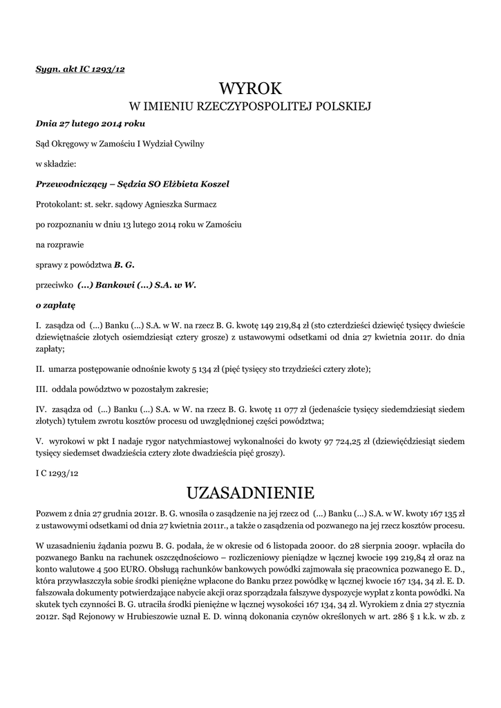 Sygn. akt IC 1293/12 WYROK W IMIENIU RZECZYPOSPOLITEJ POLSKIEJ Dnia 27 lutego 2014 roku Sąd Okręgowy w Zamościu I Wydział Cywilny w składzie: Przewodniczący – Sędzia SO Elżbieta Koszel Protokolant: st. sekr. sądowy Agnieszka Surmacz po rozpoznaniu w dniu 13 lutego 2014 roku w Zamościu na rozprawie sprawy z powództwa B. G. przeciwko (...) Bankowi (...) S.A. w W. o zapłatę I. zasądza od (...) Banku (...) S.A. w W. na rzecz B. G. kwotę 149 219,84 zł (sto czterdzieści dziewięć tysięcy dwieście dziewiętnaście złotych osiemdziesiąt cztery grosze) z ustawowymi odsetkami od dnia 27 kwietnia 2011r. do dnia zapłaty; II. umarza postępowanie odnośnie kwoty 5 134 zł (pięć tysięcy sto trzydzieści cztery złote); III. oddala powództwo w pozostałym zakresie; IV. zasądza od (...) Banku (...) S.A. w W. na rzecz B. G. kwotę 11 077 zł (jedenaście tysięcy siedemdziesiąt siedem złotych) tytułem zwrotu kosztów procesu od uwzględnionej części powództwa; V. wyrokowi w pkt I nadaje rygor natychmiastowej wykonalności do kwoty 97 724,25 zł (dziewięćdziesiąt siedem tysięcy siedemset dwadzieścia cztery złote dwadzieścia pięć groszy). I C 1293/12 UZASADNIENIE Pozwem z dnia 27 grudnia 2012r. B. G. wnosiła o zasądzenie na jej rzecz od (...) Banku (...) S.A. w W. kwoty 167 135 zł z ustawowymi odsetkami od dnia 27 kwietnia 2011r., a także o zasądzenia od pozwanego na jej rzecz kosztów procesu. W uzasadnieniu żądania pozwu B. G. podała, że w okresie od 6 listopada 2000r. do 28 sierpnia 2009r. wpłaciła do pozwanego Banku na rachunek oszczędnościowo – rozliczeniowy pieniądze w łącznej kwocie 199 219,84 zł oraz na konto walutowe 4 500 EURO. Obsługą rachunków bankowych powódki zajmowała się pracownica pozwanego E. D., która przywłaszczyła sobie środki pieniężne wpłacone do Banku przez powódkę w łącznej kwocie 167 134, 34 zł. E. D. fałszowała dokumenty potwierdzające nabycie akcji oraz sporządzała fałszywe dyspozycje wypłat z konta powódki. Na skutek tych czynności B. G. utraciła środki pieniężne w łącznej wysokości 167 134, 34 zł. Wyrokiem z dnia 27 stycznia 2012r. Sąd Rejonowy w Hrubieszowie uznał E. D. winną dokonania czynów określonych w art. 286 § 1 k.k. w zb. z art. 271 § 3 k.k. w zw. z art. 11 § 2 k.k., w zw. z art. 12 k.k. oraz art. 270 k.k.i skazał na karę pozbawienia wolności z warunkowym zawieszeniem jej wykonania. Wyrok uprawomocnił się. Dnia 27 kwietnia 2011r. B. G. złożyła pisemną reklamację do dyrektora pozwanego Banku w sprawie utraty swoich oszczędności, na skutek której zwrócono powódce 4 500 zł EURO wraz z odsetkami, a decyzja w przedmiocie zwrotu pozostałej kwoty miała być podjęta po zakończeniu postępowania przez Prokuraturę. Pomimo zakończenia tego postępowania, jak też wydania przez Sąd prawomocnego wyroku karnego, pozwany nie zwrócił powódce kwoty dochodzonej pozwem. W odpowiedzi na pozew (...) Bank (...) S.A. w W. uznał powództwo do kwoty 97 724, 25 zł a w pozostałym zakresie nie uznał powództwa i wnosił o jego oddalenie. W przypadku uwzględnienia powództwa ponad kwotę uznaną, wnosił o oddalenie powództwa o zasądzenie odsetek ustawowych za okres od dnia 27 kwietnia 2011r. do dnia 11 maja 2011r. (k. 37). Pozwany podnosił, że nie był uczestnikiem procesu karnego, nie miał wpływu na materiał dowodowy gromadzony w tamtym postępowaniu ani jego ocenę. Sama powódka w postępowaniu karnym nie potrafiła określić rozmiaru poniesionej szkody. Pozwany dysponuje 14 dowodami wpłat powódki na rachunek oszczędnościowo – rozliczeniowy, na łączną kwotę 147 724, 25 zł. Na rachunku bankowym nie odnotowano księgowania kwoty 51 495, 59 zł pochodzącej – zdaniem powódki – z wypłaty z (...) Banku, która to kwota miała być wpłacona w 2004r. Z rachunku powódki dokonano w dniu 6 października 2010r. przelewu kwoty 50 000 zł na rachunek spółki (...), tytułem przedpłaty na zakup mieszkania. Na rozprawie w dniu 7 marca 2013r. pełnomocnik pozwanego sprostował stanowisko wyrażone w odpowiedzi na pozew, wnosząc o oddalenie powództwa w zakresie kwoty 69 410, 09 zł (k. 114). Na rozprawie w dniu 13 lutego 2014r. pełnomocnik powódki ograniczył żądanie pozwu do kwoty 162 001 zł, w pozostałym zakresie cofnął pozew co do kwoty głównej i zrzekł się roszczenia, podtrzymując żądanie zasądzenia odsetek odnośnie całości kwoty dochodzonej pozwem. Podał, że cofnięcie pozwu dotyczy kwoty 4 500 EURO, która została powódce zwrócona i jest to równowartość kwoty 17 914, 50 zł. (250v., 252). Pełnomocnik pozwanego podtrzymał dotychczasowe stanowisko (k. 247 – 248, 250v., 252). Sąd Okręgowy ustalił, co następuje. B. G. od 1995r. wyjeżdżała do pracy za granicę w celach zarobkowych. Pieniądze lokowała na rachunkach bankowych w pozwanym Banku Oddział w H. oraz we (...) Banku (...) S.A. (w późniejszym czasie przejętym przez (...) Bank S.A.). Pełnomocnictwo do dysponowania lokatami powódki miała jej matka A. G.. Pracownikiem pozwanego Banku była koleżanka powódki E. D. (zatrudniona od 1 maja 1986r.), która proponowała B. G. likwidację lokat terminowych i zakup obligacji. Następnie E. D. poinformowała matkę powódki, że (...) Bank (...) „rozpada się” i radziła, aby lokaty powódki przenieść do pozwanego Banku. A. G. w asyście znajomego R. F., na podstawie posiadanego pełnomocnictwa podjęła we (...) Banku (...) depozyty powódki w łącznej kwocie 51 485, 59 zł i wpłaciła je w pozwanym Banku (...) (zeznania świadków A. G. i R. F. – k. 215 -216, 217). E. D. początkowo kupowała obligacje, jednak po pewnym czasie sprzedawała je a pieniądze przeznaczała na własne potrzeby. Dowody zakupu i sprzedaży trzymała w biurku, a później zniszczyła, zaś powódkę informowała ustnie lub tworząc fikcyjne dokumenty, że jej środki pieniężne są pomnażane. Nadto przyjmowała