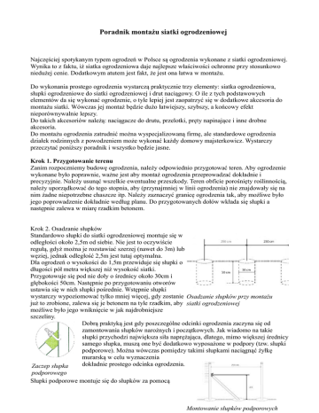 Poradnik montażu siatki ogrodzeniowej Najczęściej spotykanym typem ogrodzeń w Polsce są ogrodzenia wykonane z siatki ogrodzeniowej. Wynika to z faktu, iż siatka ogrodzeniowa daje najlepsze właściwości ochronne przy stosunkowo niedużej cenie. Dodatkowym atutem jest fakt, że jest ona łatwa w montażu. Do wykonania prostego ogrodzenia wystarczą praktycznie trzy elementy: siatka ogrodzeniowa, słupki ogrodzeniowe do siatki ogrodzeniowej i drut naciągowy. O ile z tych podstawowych elementów da się wykonać ogrodzenie, o tyle lepiej jest zaopatrzyć się w dodatkowe akcesoria do montażu siatki. Wówczas jej montaż będzie dużo łatwiejszy, szybszy, a końcowy efekt nieporównywalnie lepszy. Do takich akcesoriów należą: naciągacze do drutu, przelotki, pręty napinające i inne drobne akcesoria. Do montażu ogrodzenia zatrudnić można wyspecjalizowaną firmę, ale standardowe ogrodzenia działek rodzinnych z powodzeniem może wykonać każdy domowy majsterkowicz. Wystarczy przeczytać poniższy poradnik i wszystko będzie jasne. Krok 1. Przygotowanie terenu Zanim rozpoczniemy budowę ogrodzenia, należy odpowiednio przygotować teren. Aby ogrodzenie wykonane było poprawnie, ważne jest aby montaż ogrodzenia przeprowadzać dokładnie i precyzyjnie. Należy usunąć wszelkie ewentualne przeszkody. Teren obficie porośnięty roślinnością, należy uporządkować do tego stopnia, aby (przynajmniej w linii ogrodzenia) nie znajdowały się na nim żadne niepotrzebne chaszcze itp. Należy zaznaczyć granicę ogrodzenia tak, aby możliwe było jego poprowadzenie dokładnie według planu. Do przygotowanych dołów wkłada się słupki a następnie zalewa w miarę rzadkim betonem. Krok 2. Osadzanie słupków Standardowo słupki do siatki ogrodzeniowej montuje się w odległości około 2,5m od siebie. Nie jest to oczywiście regułą, gdyż można je rozstawiać szerzej (nawet do 3m) lub węziej, jednak odległość 2,5m jest tutaj optymalna. Dla ogrodzeń o wysokości do 1,5m przewiduje się słupki o długości pół metra większej niż wysokość siatki. Przygotowuje się pod nie doły o średnicy około 30cm i głębokości 50cm. Następnie po przygotowaniu otworów ustawia się w nich słupki pośrednie. Wstępnie słupki wystarczy wypoziomować tylko mniej więcej, gdy zostanie Osadzanie słupków przy montażu już to zrobione, zalewa się je betonem na tyle rzadkim, aby siatki ogrodzeniowej możliwe było jego wniknięcie w jak najdrobniejsze szczeliny. Dobrą praktyką jest gdy poszczególne odcinki ogrodzenia zaczyna się od zamontowania słupków narożnych i początkowych. Jak wiadomo na takie słupki przychodzi największa siła naprężająca, dlatego, mimo większej średnicy samego słupka, muszą one być dodatkowo wyposażone w podpory (tzw. słupki podporowe). Można wówczas pomiędzy takimi słupkami naciągnąć żyłkę murarską w celu wyznaczenia dokładnie prostego odcinka ogrodzenia. Zaczep słupka podporowego Słupki podporowe montuje się do słupków za pomocą Montowanie słupków podporowych specjalnych zaczepów. Słupek podporowy powinien być zamontowany pod kątem nie mniejszym niż 45o do podpieranego słupka narożnego. Powinny się one łączyć mniej więcej na 2/3 wysokości słupka narożnego. Słupek podporowy przykręca się do słupka narożnego za pomocą specjalnych zaczepów. Krok 3. Poziomowanie i wyrównywanie słupków Zanim beton, którym zalano słupki zacznie wiązać należy je dokładnie wypoziomować i spionizować. Aby wypoziomować słupki najlepiej jest dostosować ich górną krawędź do jednej linii naznaczonej np. żyłka murarską. W celu wypionizowania słupków należy każdy słupek po kolei ustawić do pionu posługując się przy tym poziomicą. Tak ustawione słupki należy zabezpieczyć przed możliwością ich osunięcia lub pochylenia i pozostawić na minimum 3 dni. Poziomowanie słupków ogrodzeniowych Krok 4. Mocowanie drutu naciągowego na słupkach Po 3 dniach od osadzenia słupków, beton związał już na tyle mocno, że możliwe jest zamontowanie drutów naciągowych. Montowanie drutu zaczynamy od wybranego słupka początkowego bądź narożnikowego. W zależności od ilości drutów naciągowych (zaleca się aby druty naciągowe montowane były co 50cm wysokości ogrodzenia), na wysokości każdego przewidzianego drutu naciągowego montuje się napinacz wraz z opaską mocującą i śrubą z oczkiem. Przez oczka śruby Montowanie drutu naciągowego i napinaczy przekłada się pręt napinający. Jeśli napinacz mocowany jest nie na słupku początkowym, ale na narożnym, na opaskę należy nałożyć dodatkowe oczko do zamocowania na tej samej opasce napinacza w drugim kierunku. Drut naciągowy powinien być w ten sam sposób zakończony na drugim słupku narożnikowym, bądź na słupku stabilizującym. Przy czym na słupku stabilizującym nie ma potrzeby montowania prętów napinających. Zamiast opaski mocującej z dodatkowym oczkiem, można użyć dwie opaski, natomiast napinacz można przymocować do nich za pomocą śruby prostej bez oczka. Gdy wszystkie napinacze zostaną już Montowanie przelotek i napinaczy do drutu przymocowane, montuje się na nich drut naciągowego naciągowy. W tym celu jego końce przekłada się przez otwory w napinaczach. Następnie za pomocą klucza (8mm) okręca się kołowrotkiem napinacza tak długo, aż drut uzyska wystarczające naprężenie. Napinacz posiada skuteczny mechanizm samoblokujący, nie ma więc potrzeby jego dodatkowego blokowania. Ponieważ drut naciągowy na obu końcach mocuje się do naciągacza dobrze jest uciągać go jednocześnie z obu stron. Wówczas drut napręża się jednakowo na całej długości, eliminując ryzyko zerwania. Gdy drut zostanie już uciągnięty, należy przymocować go do słupków pośrednich za pomocą przelotek. W tym celu na wysokości drutu, w każdym Montowanie przelotki do drutu naciągowego słupku należy na