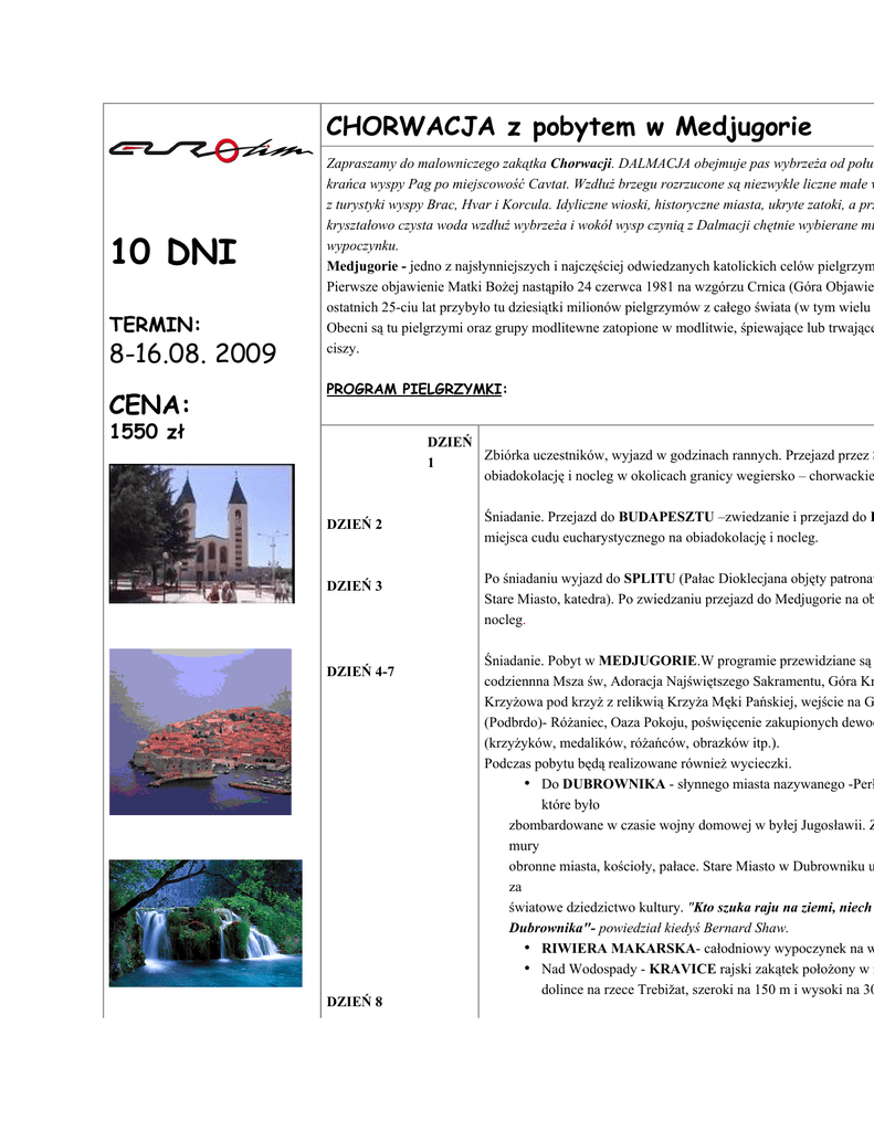 CHORWACJA z pobytem w Medjugorie 10 DNI TERMIN: 8-16.08. 2009 CENA: Zapraszamy do malowniczego zakątka Chorwacji. DALMACJA obejmuje pas wybrzeża od połud krańca wyspy Pag po miejscowość Cavtat. Wzdłuż brzegu rozrzucone są niezwykle liczne małe w z turystyki wyspy Brac, Hvar i Korcula. Idyliczne wioski, historyczne miasta, ukryte zatoki, a prz kryształowo czysta woda wzdłuż wybrzeża i wokół wysp czynią z Dalmacji chętnie wybierane mi wypoczynku. Medjugorie - jedno z najsłynniejszych i najczęściej odwiedzanych katolickich celów pielgrzym Pierwsze objawienie Matki Bożej nastąpiło 24 czerwca 1981 na wzgórzu Crnica (Góra Objawie ostatnich 25-ciu lat przybyło tu dziesiątki milionów pielgrzymów z całego świata (w tym wielu Obecni są tu pielgrzymi oraz grupy modlitewne zatopione w modlitwie, śpiewające lub trwające ciszy. PROGRAM PIELGRZYMKI: 1550 zł DZIEŃ Zbiórka uczestników, wyjazd w godzinach rannych. Przejazd przez S 1 obiadokolację i nocleg w okolicach granicy wegiersko – chorwackie DZIEŃ 2 DZIEŃ 3 DZIEŃ 4-7 DZIEŃ 8 Śniadanie. Przejazd do BUDAPESZTU –zwiedzanie i przejazd do L miejsca cudu eucharystycznego na obiadokolację i nocleg. Po śniadaniu wyjazd do SPLITU (Pałac Dioklecjana objęty patronat Stare Miasto, katedra). Po zwiedzaniu przejazd do Medjugorie na ob nocleg. Śniadanie. Pobyt w MEDJUGORIE.W programie przewidziane są codziennna Msza św, Adoracja Najświętszego Sakramentu, Góra Kr Krzyżowa pod krzyż z relikwią Krzyża Męki Pańskiej, wejście na G (Podbrdo)- Różaniec, Oaza Pokoju, poświęcenie zakupionych dewoc (krzyżyków, medalików, różańców, obrazków itp.). Podczas pobytu będą realizowane również wycieczki. • Do DUBROWNIKA - słynnego miasta nazywanego -Perł które było zbombardowane w czasie wojny domowej w byłej Jugosławii. Z mury obronne miasta, kościoły, pałace. Stare Miasto w Dubrowniku u za światowe dziedzictwo kultury. "Kto szuka raju na ziemi, niech Dubrownika"- powiedział kiedyś Bernard Shaw. • RIWIERA MAKARSKA- całodniowy wypoczynek na w • Nad Wodospady - KRAVICE rajski zakątek położony w m dolince na rzece Trebižat, szeroki na 150 m i wysoki na 30 DZIEŃ 9 daleka dający o sobie znać głośnym szumem wody i pows skutek hukiem, możliwość kąpieli. Po śniadaniu wyjazd z MEDJUGORIE, przejazd do Parku Narodow JEZIORA PLITWICKIE – malowniczych jezior krasowych połąc licznymi kaskadami i wodospadami.. Wieczorem zakwaterowanie, o nocleg. Śniadanie, wyjazd w drogę powrotną do Polski. Cena obejmuje: - przejazd zachodnim autokarem na podanej trasie, - zakwaterowanie: 8 noclegów , - wyżywienie: 8 x śniadanie, 8x obiadokolacja, - ubezpieczenie od KL (do 50 000 zł) i NNW w czasie podróży i pobytu za granicą, - opiekę pilota. Cena nie obejmuje: - biletów wstępu do zwiedzanych obiektów, przewodników. (ok.35 EUR), ul. Inowrocławska 35 85-153 Bydgoszcz www.eurotim.com.pl e-mail: [email protected] tel./fax: (+ 41 08 tel.: (+48 5 77