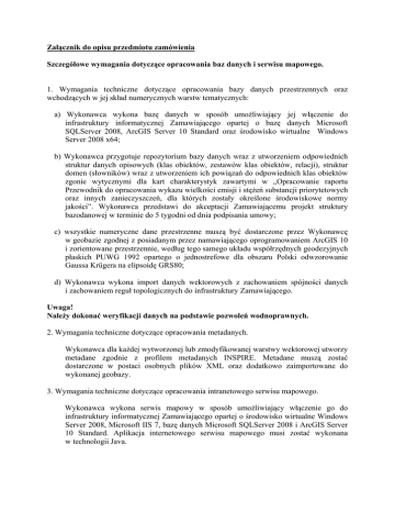 Załącznik do opisu przedmiotu zamówienia Szczegółowe wymagania dotyczące opracowania baz danych i serwisu mapowego. 1. Wymagania techniczne dotyczące opracowania bazy danych przestrzennych oraz wchodzących w jej skład numerycznych warstw tematycznych: a) Wykonawca wykona bazę danych w sposób umożliwiający jej włączenie do infrastruktury informatycznej Zamawiającego opartej o bazę danych Microsoft SQLServer 2008, ArcGIS Server 10 Standard oraz środowisko wirtualne Windows Server 2008 x64; b) Wykonawca przygotuje repozytorium bazy danych wraz z utworzeniem odpowiednich struktur danych opisowych (klas obiektów, zestawów klas obiektów, relacji), struktur domen (słowników) wraz z utworzeniem ich powiązań do odpowiednich klas obiektów zgonie wytycznymi dla kart charakterystyk zawartymi w „Opracowanie raportu Przewodnik do opracowania wykazu wielkości emisji i stężeń substancji priorytetowych oraz innych zanieczyszczeń, dla których zostały określone środowiskowe normy jakości”. Wykonawca przedstawi do akceptacji Zamawiającemu projekt struktury bazodanowej w terminie do 5 tygodni od dnia podpisania umowy; c) wszystkie numeryczne dane przestrzenne muszą być dostarczone przez Wykonawcę w geobazie zgodnej z posiadanym przez namawiającego oprogramowaniem ArcGIS 10 i zorientowane przestrzennie, według tego samego układu współrzędnych geodezyjnych płaskich PUWG 1992 opartego o jednostrefowe dla obszaru Polski odwzorowanie Gaussa Krügera na elipsoidę GRS80; d) Wykonawca wykona import danych wektorowych z zachowaniem spójności danych i zachowaniem reguł topologicznych do infrastruktury Zamawiającego. Uwaga! Należy dokonać weryfikacji danych na podstawie pozwoleń wodnoprawnych. 2. Wymagania techniczne dotyczące opracowania metadanych. Wykonawca dla każdej wytworzonej lub zmodyfikowanej warstwy wektorowej utworzy metadane zgodnie z profilem metadanych INSPIRE. Metadane muszą zostać dostarczone w postaci osobnych plików XML oraz dodatkowo zaimportowane do wykonanej geobazy. 3. Wymagania techniczne dotyczące opracowania intranetowego serwisu mapowego. Wykonawca wykona serwis mapowy w sposób umożliwiający włączenie go do infrastruktury informatycznej Zamawiającego opartej o środowisko wirtualne Windows Server 2008, Microsoft IIS 7, bazę danych Microsoft SQLServer 2008 i ArcGIS Server 10 Standard. Aplikacja internetowego serwisu mapowego musi zostać wykonana w technologii Java. 4. Funkcjonalność intranetowego serwisu mapowego. 4.1 Funkcjonalność związana z prezentacją, wyszukiwaniem danych oraz funkcje nawigacyjne: a) funkcja powiększenie, b) funkcja pomniejszenie, c) funkcja przesuwanie, d) funkcja identyfikacja, e) funkcja pomiar odległości, f) funkcja wyszukiwanie, g) funkcja formułowanie zapytań, h) funkcja poprzedni/następny widok mapy – funkcja umożliwiająca poruszanie się po kolejno wyświetlanych przez użytkownika zakresach mapy. Przycisk „poprzedni” wracać ma do wcześniej wyświetlonego widoku, a „następny” do kolejnych, i) funkcja okno podglądu – funkcja ma za zadanie ułatwić orientację na mapie, powinna umożliwić wyświetlenie dodatkowego okna zawierającego ogólniejszy widok od bieżącego widoku okna mapy, j) funkcja nawigator – funkcja wyświetlająca pionowy suwak pozwalający na szybkie przejście do oczekiwanego zakresu skalowego. Przyciski „plus” i „minus” na dole i górze suwaka powinny działać analogicznie do opisanych funkcji „powiększ” i „pomniejsz”, k) funkcja wyboru skali – funkcja umożliwiająca przy pomocy menu rozwijalnego wybór przedziału skalowego pozwalający na szybkie przejście do oczekiwanego zakresu skalowego, l) funkcja drukowanie – funkcja umożliwiająca drukowanie okna mapy wraz z legendą, m) funkcja generowanie raportu – funkcja generowania raportów, opcjonalnie dla obszaru regionu, województwa, powiatu, gminy, Jednolitej Części Wód wraz z możliwością wydruku, n) funkcja wyświetlania serwisów WMS – funkcja umożliwiająca włącznie do serwisu informacji z zewnętrznych serwisów WMS, (serwisy WMS muszą być dowolnie określane przez Zamawiającego), o) funkcja logowania do serwisu – funkcja logowania użytkowników posiadających uprawnienia do edycji danych przestrzennych. 4.2 Funkcjonalność związana z edycją danych geometrycznych intranetowego serwisu mapowego: a) wstawianie obiektów, b) wstawianie obiektów za pomocą współrzędnych xy, c) dociąganie obiektów do wybranej warstwy, d) usuwanie obiektów, e) przesuwanie obiektów, f) selekcję obiektów. Uwaga! Serwis musi umożliwić wprowadzanie współrzędnych w układzie PUWG 2000. 4.3 Funkcjonalność związana z edycją danych opisowych intranetowego serwisu mapowego: a) funkcjonalność umożliwiająca wprowadzanie i edycję danych opisowych w formie widoku zgodnego z kartami charakterystyk, b) funkcjonalność umożliwiająca korzystanie z domen (słowników) predefiniowanych w repozytorium bazy danych w formie menu rozwijalnych: - obszary dorzeczy - nazwa oraz kod, - regiony wodne - nazwa oraz kod, - scalone części wód powierzchniowych (SCWP) – nazwa oraz kod, - Jednolite Część Wód Powierzchniowych (JCWP) - nazwa, kod oraz typ, - Jednolite Część Wód Podziemnych (JCWPd) - nazwa oraz kod, - nazwa cieku – nazwa oraz kod, - nazwa zbiornika wodnego– nazwa oraz kod, - brzeg – lewy, prawy, - wodowskazy – nazwa, nazwa cieku, kilometr, - nazwa substancji priorytetowej, - numer CAS (numer przypisany substancji przez Chemical Abstracts Service). 5. Baza danych przestrzennych musi zawierać odnoszące się do obszaru opracowania warstwy przestrzenne: przekazane przez Zamawiającego oraz utworzone bądź zmodyfikowane przez Wykonawcę w wyniku realizacji niniejszego zamówienia, w tym w szczególności: a) granicę obszaru działania RZGW w Szczecinie, b) granice regionów wodnych, c) granice administracyjne województw, powiatów, gmin