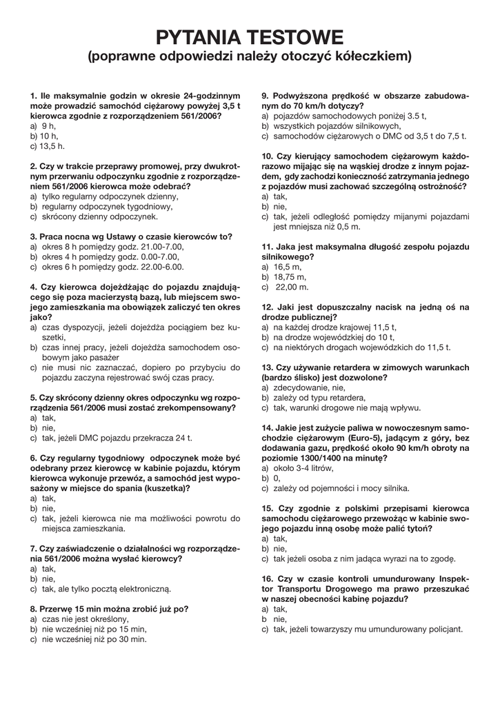 PYTANIA TESTOWE (poprawne odpowiedzi należy otoczyć kółeczkiem) 1. Ile maksymalnie godzin w okresie 24-godzinnym może prowadzić samochód ciężarowy powyżej 3,5 t kierowca zgodnie z rozporządzeniem 561/2006? a) 9 h, b) 10 h, c) 13,5 h. 2. Czy w trakcie przeprawy promowej, przy dwukrotnym przerwaniu odpoczynku zgodnie z rozporządzeniem 561/2006 kierowca może odebrać? a) tylko regularny odpoczynek dzienny, b) regularny odpoczynek tygodniowy, c) skrócony dzienny odpoczynek. 3. Praca nocna wg Ustawy o czasie kierowców to? a) okres 8 h pomiędzy godz. 21.00-7.00, b) okres 4 h pomiędzy godz. 0.00-7.00, c) okres 6 h pomiędzy godz. 22.00-6.00. 4. Czy kierowca dojeżdżając do pojazdu znajdującego się poza macierzystą bazą, lub miejscem swojego zamieszkania ma obowiązek zaliczyć ten okres jako? a) czas dyspozycji, jeżeli dojeżdża pociągiem bez kuszetki, b) czas innej pracy, jeżeli dojeżdża samochodem osobowym jako pasażer c) nie musi nic zaznaczać, dopiero po przybyciu do pojazdu zaczyna rejestrować swój czas pracy. 5. Czy skrócony dzienny okres odpoczynku wg rozporządzenia 561/2006 musi zostać zrekompensowany? a) tak, b) nie, c) tak, jeżeli DMC pojazdu przekracza 24 t. 6. Czy regularny tygodniowy odpoczynek może być odebrany przez kierowcę w kabinie pojazdu, którym kierowca wykonuje przewóz, a samochód jest wyposażony w miejsce do spania (kuszetka)? a)tak, b)nie, c) tak, jeżeli kierowca nie ma możliwości powrotu do miejsca zamieszkania. 7. Czy zaświadczenie o działalności wg rozporządzenia 561/2006 można wysłać kierowcy? a) tak, b) nie, c) tak, ale tylko pocztą elektroniczną. 8. Przerwę 15 min można zrobić już po? a) czas nie jest określony, b) nie wcześniej niż po 15 min, c) nie wcześniej niż po 30 min. 9. Podwyższona prędkość w obszarze zabudowanym do 70 km/h dotyczy? a) pojazdów samochodowych poniżej 3.5 t, b) wszystkich pojazdów silnikowych, c) samochodów ciężarowych o DMC od 3,5 t do 7,5 t. 10. Czy kierujący samochodem ciężarowym każdorazowo mijając się na wąskiej drodze z innym pojazdem, gdy zachodzi konieczność zatrzymania jednego z pojazdów musi zachować szczególną ostrożność? a) tak, b) nie, c) tak, jeżeli odległość pomiędzy mijanymi pojazdami jest mniejsza niż 0,5 m. 11. Jaka jest maksymalna długość zespołu pojazdu silnikowego? a) 16,5 m, b) 18,75 m, c) 22,00 m. 12. Jaki jest dopuszczalny nacisk na jedną oś na drodze publicznej? a) na każdej drodze krajowej 11,5 t, b) na drodze wojewódzkiej do 10 t, c) na niektórych drogach wojewódzkich do 11,5 t. 13. Czy używanie retardera w zimowych warunkach (bardzo ślisko) jest dozwolone? a) zdecydowanie, nie, b) zależy od typu retardera, c) tak, warunki drogowe nie mają wpływu. 14. Jakie jest zużycie paliwa w nowoczesnym samochodzie ciężarowym (Euro-5), jadącym z góry, bez dodawania gazu, prędkość około 90 km/h obroty na poziomie 1300/1400 na minutę? a) około 3-4 litrów, b) 0, c) zależy od pojemności i mocy silnika. 15. Czy zgodnie z polskimi przepisami kierowca samochodu ciężarowego przewożąc w kabinie swojego pojazdu inną osobę może palić tytoń? a) tak, b) nie, c) tak jeżeli osoba z nim jadąca wyrazi na to zgodę. 16. Czy w czasie kontroli umundurowany Inspektor Transportu Drogowego ma prawo przeszukać w naszej obecności kabinę pojazdu? a) tak, b nie, c) tak, jeżeli towarzyszy mu umundurowany policjant. miejsce na znaczek REDAKCJA „POLSKI TRAKER” ul. Roweckiego 6 32-005 Niepołomice Eliminacje do Mistrzostw Świata Kierowców UICR Sosnowiec – 15.04.2014 r. 1. Imię ........................................................................................................................................................... 2. Nazwisko .................................................................................................................................................. 3. Data urodzenia .......................................................................... SKPT nr ................................................ 4. Adres ........................................................................................................................................................ 5. Telefon kontaktowy ................................................................................................................................... 6. Prawo jazdy nr ..................................... kategorie .................................................................................... 7. Miejsce zatrudnienia (nazwa, adres) ........................................................................................................ ....................................................................................................................................................................... ....................................................................................................................................................................... 8. Rozmiar koszulki ..................................................................................................................................... FWHU BBZ uprzejmie informuje, że Pani/Pana dane osobowe gromadzone są przez firmę dla potrzeb Eliminacji do Mistrzostw Świata Kierowców UICR (Sosnowiec – 15.04.2014 r.). Zbieranie danych odbywa się na zasadzie dobrowolności. Niniejszym wyrażam zgodę na przetwarzanie przez firmę BBZ moich danych osobowych zgodnie z ustawą o ochronie danych osobowych. (Dz.U.133/97 poz.883). 9 . Podpis ....................................................................................................................................................... * właściwą kategorię podkreślić ZGŁOSZENIE do KAT.* A (solo do 12 t), C (zestaw z naczepą), D (zestaw z przyczepą).