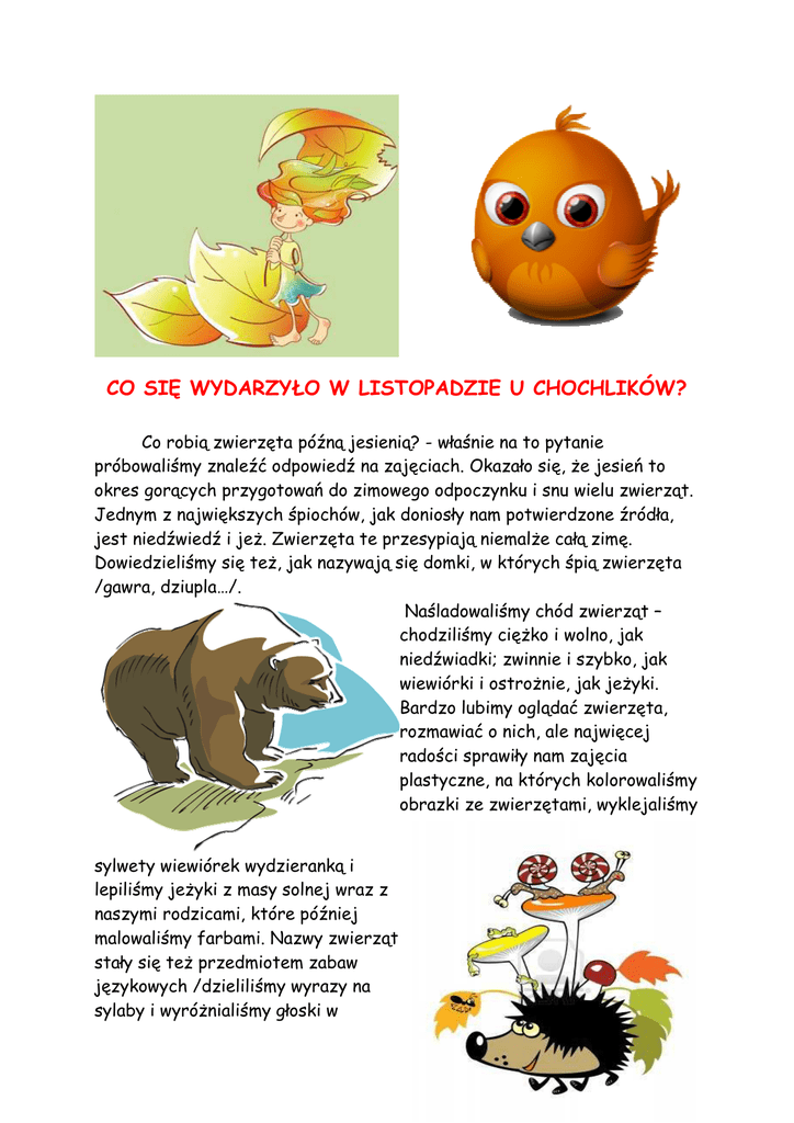 CO SIĘ WYDARZYŁO W LISTOPADZIE U CHOCHLIKÓW? Co robią zwierzęta późną jesienią? - właśnie na to pytanie próbowaliśmy znaleźć odpowiedź na zajęciach. Okazało się, że jesień to okres gorących przygotowań do zimowego odpoczynku i snu wielu zwierząt. Jednym z największych śpiochów, jak doniosły nam potwierdzone źródła, jest niedźwiedź i jeż. Zwierzęta te przesypiają niemalże całą zimę. Dowiedzieliśmy się też, jak nazywają się domki, w których śpią zwierzęta /gawra, dziupla…/. Naśladowaliśmy chód zwierząt – chodziliśmy ciężko i wolno, jak niedźwiadki; zwinnie i szybko, jak wiewiórki i ostrożnie, jak jeżyki. Bardzo lubimy oglądać zwierzęta, rozmawiać o nich, ale najwięcej radości sprawiły nam zajęcia plastyczne, na których kolorowaliśmy obrazki ze zwierzętami, wyklejaliśmy sylwety wiewiórek wydzieranką i lepiliśmy jeżyki z masy solnej wraz z naszymi rodzicami, które później malowaliśmy farbami. Nazwy zwierząt stały się też przedmiotem zabaw językowych /dzieliliśmy wyrazy na sylaby i wyróżnialiśmy głoski w nagłosie/. Śpiewaliśmy piosenki o misiu brunatnym, śpiącym w gawrze i o jeżyku, który kłuje swoimi kolcami. Określaliśmy wielkości zwierząt /mały, mniejszy, najmniejszy/, przeliczaliśmy i porównywaliśmy zbiory z sylwetami zwierząt, określaliśmy liczebność tych zbiorów /najmniej, najwięcej, tyle samo/. Ponadto bawiliśmy się instrumentami, wystukiwaliśmy rytmy na wiele sposobów. Uczestniczyliśmy w spacerach, podczas których obserwowaliśmy zmiany zachodzące w przyrodzie, byliśmy świadkami różnorodnych prac porządkowych np. odkurzania liści odkurzaczem, czy wsypywania ich na przyczepę. Przyglądaliśmy się też bardzo skomplikowanym pracom drogowym i przeróżnym pojazdom, maszynom, obsługiwanym przez budowniczych /widzieliśmy walec, spychacz, dźwig, itp. – szczególnie my, chłopcy, byliśmy przeszczęśliwi/. W drugiej połowie listopada rozmawialiśmy i uczyliśmy się o tym, jak i w co powinniśmy się ubierać w chłodne dni, by być zdrowymi przedszkolakami. Wymienialiśmy kolejno części garderoby i ubieraliśmy w nie sylwety postaci. Gościły u nas maskotki - zwierzęta przyniesione przez Przemka, które były później bohaterami teatrzyku wystawionego przez naszą panią. Dowiedzieliśmy się też, że jedzenie może być zdrowe i niezdrowe, a nawet poznaliśmy specjalną piramidę żywieniową, która mówi nam, czego powinniśmy spożywać najwięcej, a co należy ograniczać. Byliśmy bardzo zawiedzeni faktem, że chipsy i cola należą do rzeczy, których powinniśmy unikać. Próbowaliśmy też ułożyć jadłospis na cały dzień i trzeba przyznać, że poszło nam całkiem nieźle, choć niektórzy z nas na obiad chętnie zjedliby czekoladę zamiast surówki:) Na szczęście historyjka „O księżniczce Zuzance i rycerzu Witaminku” wyjaśniła nam, dlaczego nie można jeść słodyczy w dużych ilościach, no i dowiedzieliśmy się, co to są witaminy oraz gdzie je można znaleźć:) Ostatni tydzień listopada był poświęcony dyskusjom o tym, jak dbać o zdrowie. Prawdziwą niespodziankę zrobiła nam Mama Przemka, która, jak się okazało, jest lekarzem i przyszła do przedszkola, by nam opowiedzieć ciekawostki o higienie i o tym, jak my sami możemy zatroszczyć się o swoje zdrowie. Wytłumaczyła nam, co to są i pokazała, jak wyglądają bakterie oraz zarazki /wyglądają raczej niemiło/. Pani doktor nauczyła nas myć „porządnie” ręce – teraz instrukcja mycia rąk wisi w łazience. Wiemy już też, że zastrzyków boją się tylko nasi tatusiowie /by potwierdzić tę teorię, pani Dorota wcieliła się w rolę „tatusia”, ale gdy tylko podeszła do niej pani doktor ze strzykawką, natychmiast zemdlała…/. Pani doktor podarowała nam strzykawki, ale co się działo w domach z naszymi tatusiami, to nasza słodka tajemnica:) Mieliśmy szansę posłuchać bicia swego serca, a kiedy pani spytała, kto ma kaszel i jest chory, to nie wiemy dlaczego i jak to się stało, ale wszyscy zaczęliśmy nagle strasznie kaszleć – dziwna sprawa... Po tej wizycie jesteśmy o wiele mądrzejsi: wiemy, że nie wolno nam samym brać leków, że mogą podawać nam je tylko osoby dorosłe. Najważniejsze jest jednak to, że nikt z nas NIE BOI SIĘ JUŻ LEKARZY. Mama Przemka jest super!!! Dziękujemy jej za odwiedziny i życzymy samych dzielnych i uśmiechniętych pacjentów. PIOSENKI: MIŚ BRUNATNY Miś brunatny w gawrze śpi x2 My misia lubimy Z misiem się bawimy, Jak się zbudzi to, miód zje x2 Pierwsza godzina misio śpi, Druga godzina misio chrapie, Trzecia godzina miś miód łapie. JEŻ W ogródeczku jeżyk śpi, zbudź się jeżu, zbudź, zbudź! Lecz nie podam rączki ci, bo mnie będziesz kłuć, kłuć! La, la, la, la, la, la, la, zbudź się jeżu, zbudź, zbudź, La, la, la, la, la, la, la, bo mnie będziesz kłuć, kłuć. PAN LISTOPAD 1. Pan Listopad gra na basie dylu, dylu, dyl. Na jesiennym graniu zna się trawką dotknął strun. Ref.: Wesoło gra muzyka, pada deszcz. Świerszcz za kominem cyka tańcz, gdy chcesz. 2. Pan Listopad gra na bębnie bara, bara, bum. Z deszczem puka równo, pięknie koncert daje mu. Ref.:Wesoło gra muzyka... 3. Pan Listopad gra na flecie fiju, fiju, fiu. Z liści złotych ma berecik a kubraczek kubraczek nut. Ref.:Wesoło gra muzyka... PRACZKI Tu jedną mam rączkę, a tu drugą mam, Jak praczki pracują pokażę ja wam. Tak piorą, tak piorą przez cały długi dzień. /x2 Tu jedną mam rączkę, a tu drugą mam, Jak praczki pracują pokażę ja wam. Tak kręcą, tak kręcą przez cały długi dzień. /x2 Tu jedną mam rączkę, a tu drugą mam, Jak praczki pracują pokażę ja wam. Wieszają, wieszają przez cały długi dzień. /x2 Tu jedną mam rączkę, a tu drugą mam, Jak praczki pracują pokażę ja wam. Prasują, prasują przez cały długi dzień. /x2 Tu jedną mam rączkę, a tu