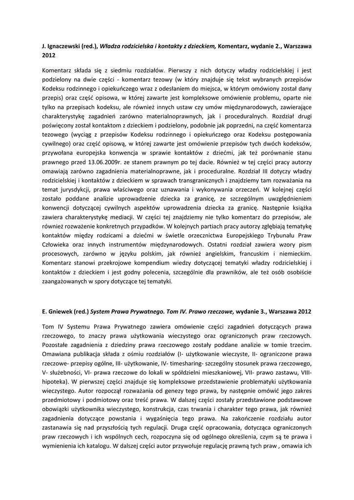 J. Ignaczewski (red.), Władza rodzicielska i kontakty z dzieckiem, Komentarz, wydanie 2., Warszawa 2012 Komentarz składa się z siedmiu rozdziałów. Pierwszy z nich dotyczy władzy rodzicielskiej i jest podzielony na dwie części - komentarz tezowy (w który znajduje się tekst wybranych przepisów Kodeksu rodzinnego i opiekuńczego wraz z odesłaniem do miejsca, w którym omówiony został dany przepis) oraz część opisowa, w której zawarte jest kompleksowe omówienie problemu, oparte nie tylko na przepisach kodeksu, ale również innych ustaw czy umów międzynarodowych, zawierające charakterystykę zagadnień zarówno materialnoprawnych, jak i proceduralnych. Rozdział drugi poświęcony został kontaktom z dzieckiem i podzielony, podobnie jak poprzedni, na część komentarza tezowego (wyciąg z przepisów Kodeksu rodzinnego i opiekuńczego oraz Kodeksu postępowania cywilnego) oraz część opisową, w której zawarte jest omówienie przepisów tych dwóch kodeksów, przywołana europejska konwencja w sprawie kontaktów z dziećmi, jak też porównanie stanu prawnego przed 13.06.2009r. ze stanem prawnym po tej dacie. Również w tej części pracy autorzy omawiają zarówno zagadnienia materialnoprawne, jak i proceduralne. Rozdział III dotyczy władzy rodzicielskiej i kontaktów z dzieckiem w sprawach transgranicznych i znajdziemy tam rozważania na temat jurysdykcji, prawa właściwego oraz uznawania i wykonywania orzeczeń. W kolejnej części zostało poddane analizie uprowadzenie dziecka za granicę, ze szczególnym uwzględnieniem konwencji dotyczącej cywilnych aspektów uprowadzenia dziecka za granicę. Następnie książka zawiera charakterystykę mediacji. W części tej znajdziemy nie tylko komentarz do przepisów, ale również rozważenie konkretnych przypadków. W kolejnych partiach pracy autorzy zgłębiają tematykę kontaktów między rodzicami a dziećmi w świetle orzecznictwa Europejskiego Trybunału Praw Człowieka oraz innych instrumentów międzynarodowych. Ostatni rozdział zawiera wzory pism procesowych, zarówno w języku polskim, jak również angielskim, francuskim i niemieckim. Komentarz stanowi przekrojowe kompendium wiedzy dotyczącej tematyki władzy rodzicielskiej i kontaktów z dzieckiem i jest godny polecenia, szczególnie dla prawników, ale też osób osobiście zaangażowanych w spory dotyczące tej tematyki. E. Gniewek (red.) System Prawa Prywatnego. Tom IV. Prawo rzeczowe, wydanie 3., Warszawa 2012 Tom IV Systemu Prawa Prywatnego zawiera omówienie części zagadnień dotyczących prawa rzeczowego, to znaczy prawa użytkowania wieczystego oraz ograniczonych praw rzeczowych. Pozostałe zagadnienia z dziedziny prawa rzeczowego zostały poddane analizie w tomie trzecim. Omawiana publikacja składa z ośmiu rozdziałów (I- użytkowanie wieczyste, II- ograniczone prawa rzeczowe- przepisy ogólne, III- użytkowanie, IV- timesharing- szczególny stosunek prawa rzeczowego, V- służebności, VI- prawa rzeczowe do lokali w spółdzielni mieszkaniowej, VII- prawo zastawu, VIIIhipoteka). W pierwszej części znajduje się kompleksowe przedstawienie problematyki użytkowania wieczystego. Autor rozpoczął rozważania od genezy tego prawa, by następnie omówić jego zakres przedmiotowy i podmiotowy oraz treść prawa. W dalszej części zostały przedstawione podstawowe obowiązki użytkownika wieczystego, konstrukcja, czas trwania i charakter tego prawa, jak również zagadnienia dotyczące powstania i wygaśnięcia tego prawa. Na zakończenie rozdziału autor zastanawia się nad przyszłością tych regulacji. Druga część opracowania, dotycząca ograniczonych praw rzeczowych i ich wspólnych cech, rozpoczyna się od ogólnego określenia, czym są te prawa i wymienienia ich katalogu. W dalszej części autor przywołuje regulację prawną tych praw , omawia ich powstanie, przeniesienie, pierwszeństwo oraz wygaśnięcie. Na zakończenie rozdziału przeanalizowana została ochrona tych praw. W dalszych częściach pracy znajdują się analizy poszczególnych ograniczonych praw rzeczowych, w pierwszej kolejności użytkowania. Rozdział ten został podzielony na omówienie ogólnej charakterystyki tego prawa, generalnej regulacji jego dotyczącej oraz poszczególnych przypadków użytkowania- przez osoby fizyczne, rolnicze spółdzielnie produkcyjne oraz inne przypadki. W następnej części opracowania omówione zostały zagadnienia związane z timesharingiem. Autor przywołał genezę tego prawa oraz jego definicję, jak również porównał regulacje przyjęte w państwach europejskich oraz praktykę w nich wypracowaną, kładąc szczególny nacisk na rozróżnienia timesharingu z przewagą cech prawa obligacyjnego od timesharnigu „własnościowego”, czyli zbliżonego od ograniczonych praw rzeczowych. W rozdziale tym znajdziemy także wymagania prawa europejskiego w zakresie ochrony konsumentów zestawione z regulacją cywilnoprawną oraz polską konstrukcję tego prawa, opartą na przepisach ustawy o timeshare. Rozdział piąty zawiera omówienie służebności, zarówno gruntowych jak i osobistych. Autor podał analizie nie tylko zagadnienia ogólne, tzn. treść i wykonywanie służebności gruntowych oraz osobistych, ale też zagadnienia szczegółowe: skutki podziału nieruchomości w stosunku do służebności oraz uprawnienia domowników służebnika. W następnej części znalazło się omówienie praw rzeczowych do lokali w spółdzielni mieszkaniowej. Autor przedstawił ogólnie uregulowania dotyczące spółdzielni mieszkaniowych, a następnie szczegółowo poddał analizie spółdzielcze własnościowe prawo do lokalu oraz prawo odrębnej własności lokalu w spółdzielni mieszkaniowej. Rozdział VII nosi nazwę „prawo zastawu” i znajdziemy w nim rozbudowaną analizę tego prawa. Po początkowy ogólnym przedstawieniu instytucji zastawu autor przeszedł do charakteryzacji kolejno: zastawu zwykłego, zastawu zwykłego na