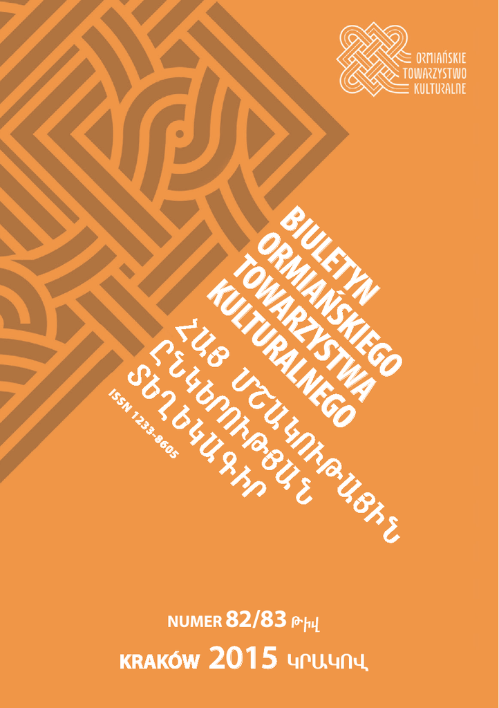 SN 12 33 GO YN IE A ET SK TW GO UL AŃ YS E BI MI RZ ALN OR WA R TO LTU KU IS -8 60 5 NUMER 82/83 2015 GRAGOW KRAKÓW BIULETYN ORMIAŃSKIEGO TOWARZYSTWA KULTURALNEGO ՀԱՅ ՄՇԱԿՈՒԹԱՅԻՆ ԸՆԿԵՐՈՒԹՅԱՆ ՏԵՂԵԿԱԳԻՐ W Biuletynie są publikowane relacje, wspomnienia, opinie, opracowania naukowe i inne utwory dowolnej formy, których tematyka jest związana z historią, kulturą i współczesnymi problemami Ormian i Armenii. Copyright by Ormiańskie Towarzystwo Kulturalne – Kraków 2015 Materiałów zamieszczonych w Biuletynie OTK nie można w żadnej formie reprodukować bez pisemnej zgody Wydawcy. Kolegium Redakcyjne prof. dr hab. Andrzej Pisowicz (przewodniczący) dr hab. Krzysztof Stopka, prof. UJ dr Jakub Osiecki Katarzyna Agopsowicz Redakcja armenistyczna prof. dr hab. Andrzej Pisowicz Adres Ormiańskie Towarzystwo Kulturalne ul. Halicka 10/11 lok. 109 31–036 Kraków www.otk.org.pl [email protected] Konto bankowe Alior Bank 63 2490 0005 0000 4500 5287 9182 Projekt okładki i szaty graficznej Monika Sutryk Skład Katarzyna Agopsowicz Druk ISSN 1233-8605 Poligrafia Salezjańska 30–318 Kraków, ul. Michała Bałuckiego 8 http://poligrafia.salezjanie.net Zrealizowano dzięki dotacji Ministra Administracji i Cyfryzacji Armen Artwich [Warszawa] Panie Ambasadorze, Szanowni Państwo! W imieniu Ormiańskiego Towarzystwa Kulturalnego pragniemy powitać na uroczystym spotkaniu jubileuszowym poświęconym 35. rocznicy pierwszego po drugiej wojnie światowej zjazdu Ormian polskich, który odbył się w Krakowie, oraz 25. rocznicy działalności Ormiańskiego Towarzystwa Kulturalnego. Są dziś z nami organizatorzy i uczestnicy owego historycznego zjazdu – witamy Państwa szczególnie serdecznie. Przeszło 35 lat temu powstała w Krakowie organizacja niezwykła. Z inicjatywy m. in. śp. Stanisława Donigiewicza oraz na wniosek i dzięki wszechstronnej pomocy i życzliwości pana doktora Janusza Kamockiego – ówczesnego kustosza Muzeum Etnograficznego w Krakowie, przy wsparciu pani Aleksandry Jacher-Tyszkowej i pani doktor Anny Kowalskiej-Lewickiej, utworzono przy Polskim Towarzystwie Ludoznawczym – Koło Zainteresowań Kulturą Ormian, którego pierwszym prezesem został pan Michał Bohosiewicz, zaś sekretarzem – pani Teresa Passakas. Po latach milczenia spowodowanych tragedią II wojny światowej, zagładą archidiecezji ormiańskiej we Lwowie, przymusowymi wysiedleniami z Kresów Wschodnich i realiami PRL, polscy Ormianie zaczęli organizować się na nowo. Już kilka miesięcy później Koło Zainteresowań Kulturą Ormian zorganizowało w Krakowie pierwszy zjazd Ormian polskich, połączony z sesją naukową. W dniach 8–9 listopada 1980 r. w murach krakowskiego PAX i klasztoru ojców Dominikanów spotkało się około 500 delegatów z całej Polski. Wielu z nich zobaczyło się po raz pierwszy od czasów przedwojennych. Aby lepiej oddać atmosferę tego spotkania, warto przytoczyć barwną relację niezapomnianego pana Leona Ter-Oganjana z Warszawy, która ukazała się na łamach ówczesnej prasy2: 1 Wystąpienie odczytane zostało w językach polskim i ormiańskim przez Katarzynę Agopsowicz, Armena Artwicha, Hripsime Mamikonyan i Vigena Yeremyana 5 grudnia 2015 roku, o godzinie 13, w Sali Złotej Filharmonii Krakowskiej. 2 Cytat pochodzi z artykułu Jerzego Marka Włodarka, pt. Gonił Ormianin Polkę po Lwowie, który ukazał się w czasopiśmie „Zorza”. 3 82/83 Թիվ NUMER 2015 Wystąpienie inaugurujące uroczystość dla uczczenia 35 rocznicy zjazdu Ormian polskich w Krakowie (1980) i 25 rocznicy utworzenia Ormiańskiego Towarzystwa Kulturalnego1 Sesja została zorganizowana wzorowo. Niechybnie greccy bogowie w to się wdali: dr Kamocki jako praprzyczyna i potęga niewidzialna; Pan Michał Bohosiewicz jako Zeus wieńconośny, Jan Klemens Krzysztofowicz jako posłaniec bogów, Merkury. A prace wykonawcze wzięły na siebie trzy boginie w pierwszej ćwiartce wieku lub zaraz po niej: Teresa Passakas, Grażyna Gäntner i Ewa Krzysztofowicz. Olimp ten zgromadził adresy, wysłał zaproszenia, zamówił hotele, znalazł salę w PAX-ie, zdobył jedzenie, dbał o gości i, jak to zawsze w pracach organizacyjnych bywa, miał tysiące spraw do załatwienia z pomocą wielu chętnych „pomocników”. Wszystkim chwała i cześć!!! Nawet na wzór kongresów międzynarodowych uczestnicy otrzymali broszki ze swymi nazwiskami. Ksiądz Kazimierz Filipiak (jedyny ksiądz w Polsce umiejący odprawiać Mszę św. po ormiańsku) przyjechał z trzema ministrantami, znającymi ministranturę w języku naszych Ojców. Pan Tadeusz Isakowicz-Zaleski (student św. Teologii) diakonował podczas obu Mszy św. odprawionych w kościele św. Idziego u stóp Kurzej Stopki pod Wawelem. Zaproszono chór z kościoła św. Anny, śpiewała nasza Flora Nazarian; po mszy niedzielnej 20-minutowy koncert dał zespół „Kirsch” z Wrocławia. Dwukrotnie ksiądz Kazimierz wygłosił homilię, wzywał do braterstwa i przyjaźni, dziękował za liczny udział, podkreślał wielką wagę zebrań tego typu w kontynuacji tradycji Ormian polskich, ich łączności i współżycia. Takie płomienne wezwanie przyczyniło się do wytworzenia rodzinnej atmosfery w późniejszych sesjach. Modliliśmy się za naszych braci zmarłych i żywych i o powołania duchowne wśród młodzieży ormiańskiej. Wygłoszono sześć referatów o olbrzymim ładunku faktograficznym, prowadzono długie dyskusje z udziałem Panów Donigiewicza i Nikosiewicza z Warszawy. W części koncertowo-poetyckiej słuchano pieśni ormiańskich w wykonaniu Flory, folkloru ormiańskiego w prezentacji ludowo-rubasznej Erama Manukiana. Poezję ormiańską czytali: Maria Nowotarska (o potężnej urodzie) i Jan Adamski (o potężnej posturze i głosie), artyści Teatru im. Słowackiego. Akompaniował (genialnie) pan Leszek Sokołowski. Całość prowadziła z werwą i zaangażowaniem Pani Ewa z Bohosiewiczów. Zebrani wraz z ni