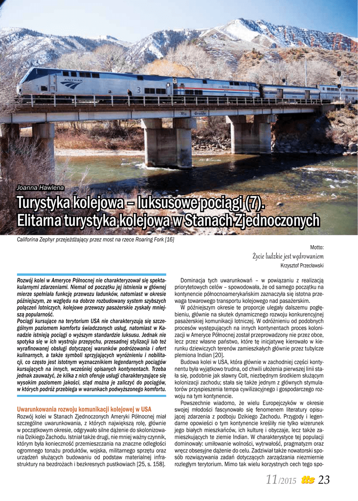 Joanna Hawlena Turystyka kolejowa – luksusowe pociągi (7). Elitarna turystyka kolejowa w Stanach Zjednoczonych Califorina Zephyr przejeżdżający przez most na rzece Roaring Fork [16] Motto: Życie ludzkie jest wędrowaniem Krzysztof Przecławski Rozwój kolei w Ameryce Północnej nie charakteryzował się spektakularnymi zdarzeniami. Niemal od początku jej istnienia w głównej mierze spełniała funkcję przewozu ładunków, natomiast w okresie późniejszym, ze względu na dobrze rozbudowany system szybszych połączeń lotniczych, kolejowe przewozy pasażerskie zyskały mniejszą popularność. Pociągi kursujące na terytorium USA nie charakteryzują się szczególnym poziomem komfortu świadczonych usług, natomiast w Kanadzie istnieją pociągi o wyższym standardzie luksusu. Jednak nie spotyka się w ich wystroju przepychu, przesadnej stylizacji lub też wyrafinowanej obsługi dotyczącej warunków podróżowania i ofert kulinarnych, a także symboli sprzyjających wyróżnieniu i nobilitacji, co często jest istotnym wyznacznikiem legendarnych pociągów kursujących na innych, wcześniej opisanych kontynentach. Trzeba jednak zauważyć, że kilka z nich oferuje usługi charakteryzujące się wysokim poziomem jakości, stąd można je zaliczyć do pociągów, w których podróż przebiega w warunkach podwyższonego komfortu. Uwarunkowania rozwoju komunikacji kolejowej w USA Rozwój kolei w Stanach Zjednoczonych Ameryki Północnej miał szczególne uwarunkowania, z których największą rolę, głównie w początkowym okresie, odgrywało silne dążenie do skolonizowania Dzikiego Zachodu. Istniał także drugi, nie mniej ważny czynnik, którym była konieczność przemieszczania na znaczne odległości ogromnego tonażu produktów, wojska, militarnego sprzętu oraz urządzeń służących budowaniu od podstaw materialnej infrastruktury na bezdrożach i bezkresnych pustkowiach [25, s. 158]. Dominacja tych uwarunkowań – w powiązaniu z realizacją priorytetowych celów – spowodowała, że od samego początku na kontynencie północnoamerykańskim zaznaczyła się istotna przewaga towarowego transportu kolejowego nad pasażerskim. W późniejszym okresie te proporcje ulegały dalszemu pogłębieniu, głównie na skutek dynamicznego rozwoju konkurencyjnej pasażerskiej komunikacji lotniczej. W odróżnieniu od podobnych procesów występujących na innych kontynentach proces kolonizacji w Ameryce Północnej został przeprowadzony nie przez obce, lecz przez własne państwo, które tę inicjatywę kierowało w kierunku dziewiczych terenów zamieszkałych głównie przez tubylcze plemiona Indian [20]. Budowa kolei w USA, która głównie w zachodniej części kontynentu była wyjątkowo trudna, od chwili ułożenia pierwszej linii stała się, podobnie jak sławny Colt, niezbędnym środkiem służącym kolonizacji zachodu; stała się także jednym z głównych stymulatorów przyspieszenia tempa cywilizacyjnego i gospodarczego rozwoju na tym kontynencie. Powszechnie wiadomo, że wielu Europejczyków w okresie swojej młodości fascynowało się fenomenem literatury opisującej zdarzenia z podboju Dzikiego Zachodu. Przygody i legendarne opowieści o tym kontynencie kreśliły nie tylko wizerunek jego białych mieszkańców, ich kulturę i obyczaje, lecz także zamieszkujących te ziemie Indian. W charakterystyce tej populacji dominowały: umiłowanie wolności, wytrwałość, pragmatyzm oraz wręcz obsesyjne dążenie do celu. Zadziwiał także nowatorski sposób rozwiązywania zadań dotyczących zarządzania niezmiernie rozległym terytorium. Mimo tak wielu korzystnych cech tego spo- 11 /2015 23 Systemy transportowe Rys. 1. Ilustrowana mapa trasy Pony Express (rys. W. H. Jackson, 1860 r.) [4] łeczeństwa budowanie systemu kolejowych połączeń pomiędzy zdekoncentrowanymi skupiskami surowców i ludności stanowiło poważne wyzwanie – tym bardziej, że znaczną część ziem, o których mowa, stanowiły bezkresne pustkowia [1]. Drogą, którą kiedyś podążali osadnicy Dzikiego Zachodu, dziś przebiega legendarna trasa Route 66 (rys. 1), natomiast drogą z pierwszej „gorączki złota” prowadzi słynny szlak Santa Fe Trail. Cywilizacyjny rozwój kontynentu, w tym także kolei, rozpoczął się i miał większą dynamikę we wschodniej jego części. Być może wynikało to z liczniejszych kontaktów z Europą, w której wcześniej zapoczątkowano rewolucję przemysłową. Jej wyznacznikiem była maszyna parowa, którą George Stephenson zainstalował w pierwszej lokomotywie parowej Mylord, oraz zbudowana na wyspach brytyjskich w 1830 r. pierwsza trakcja kolei parowej, łącząca Liverpool z Manchesterem. Zalety kolei natychmiast dostrzeżono w Ameryce, jednak na drodze dynamicznego rozwoju tego środka transportu stanęły niespodziewane obciążenia finansowe, związane z wojną meksykańsko-amerykańską oraz secesyjną. Skutki tych wydarzeń miały znaczący wpływ na genezę amerykańskiej kolei i zadecydowały nie tylko o dynamice jej rozwoju, lecz także o procesie kolonizacji Zachodu. Przesiedlająca się w tym kierunku fala osadnicza brała pod uwagę miejsca eksploatacji surowców, upraw rolniczych i handlu. Między tymi ośrodkami nie istniał system regularnego transportu. Były to zazwyczaj enklawy zamieszkałe przez tubylcze plemiona Indian, co nie zachęcało do inwestowania w infrastrukturę kolejową [21, s. 182–207]. Radykalną zmianę w postrzeganiu korzyści płynących z uruchomienia kolejowych szlaków spowodowały nieoczekiwane wydarzenia. Pierwsze inicjatywy kolonizacji zachodu przypadają na początek XIX w. Powstająca wówczas fala kolonizacji miała swoje źródło w odkryciu złóż złota na przedgórzu Gór Kalifornii (1848 r.). Kolonizatorzy tworzyli bardzo zróżnicowaną grupę, w której oprócz Amerykanów można było spotkać ludzi niemal z każdego zakątka świata. W ten sposób do Ameryki przybyły nie tylko osoby o odm