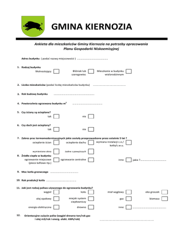 GMINA KIERNOZIA Ankieta dla mieszkańców Gminy Kiernozia na potrzeby opracowania Planu Gospodarki Niskoemisyjnej Adres budynku ( podać nazwę miejscowości ) …………………………….………… 1. Rodzaj budynku Bliźniak lub szeregowiec Wolnostojący 2. Liczba mieszkańców (podać liczbę mieszkańców budynku) 3. Rok budowy budynku Mieszkanie w budynku wielorodzinnym …………………………………….………… ……………………………………………………. 4. Powierzchnia ogrzewana budynku m2 ……………………………………… 5. Czy ściany są ocieplone? tak nie 6. Czy dach jest ocieplony? tak nie 7. Zakres prac termomodernizacyjnych jakie zostały przeprowadzone przez ostatnie 5 lat ? wymiana instalacji c.o./ ocieplenie ścian ocieplenie dachu kotła/c.w.u. wymienione okna żadne z powyższych 8. Źródło ciepła w budynku ogrzewanie miejscowe (piece kaflowe itp.) ogrzewanie centralne inne jakie ?………………………………… 9. Moc kotła grzewczego …………………………………… 10. Rok produkcji kotła …………………………………..…...… 11. Jaki jest rodzaj paliwa używanego do ogrzewania budynku? 12. węgiel koks miał węglowy eko groszek olej opałowy miejski system ciepłowniczy gaz biomasa energia elektryczna drewno inne Orientacyjne zużycie paliw (węgiel drewno ton/rok gaz i olej m3/rok i energ. elekt. kWh/rok) ………………………………………….. ………………………………………………....…………………………… 13. Rodzaj paliwa do przygotowania ciepłej wody użytkowej (c.w.u.) takie samo jak gaz ogrzewanie energia słoneczna węgiel drewno inne energia elektryczna …………………………………………. 14. Zużycie paliw (węgiel drewno ton/rok gaz i olej m3/rok i energ. elekt. kWh/rok) ………………………….…………………… 15. Czy planowana jest termomodernizacja budynku do 2020 r.? tak 16. Jeśli tak - to w jakim zakresie? wymiana starego kotła na nowy montaż pompy ciepła nie ocieplenie ścian zewnętrznych ocieplenie dachu/ stropodachu montaż kolektorów słonecznych inne wymiana okien i drzwi jakie………………………………… 17. Dane dotyczące posiadanych pojazdów podać roczny przebieg/motogodziny pracy pojazdów w rozbiciu na: podać liczbę posiadanych pojazdów w rozbiciu na: rodzaj stosowanego paliwa pojazdów: osobowe: ………………… osobowe : ….………………….. benzyna ciężarowe: ………………. ciężarowe : …………………….. ropa rolnicze: ………….………. rolnicze: …………………………. gaz/Lpg 18. Dane dotyczące zużycia energii elektrycznej grupa taryfowa: ………………………………………………………. miesięczne zużycie prądu zł/miesiąc: ……………………………………………………. 19. Czy wyrażają Państwo chęć uczestnictwa w programach/projektach unijnych (umożliwiających dofinansowanie) tak nie Wypełnioną Ankietę należy dostarczyć do Urzędzu Gminy Kiernozia Lub Uzupełnić elektronicznie ankietę, która jest dostępna online na stronie internetowej: http://goo.gl/lN6qSX bądź na stronie Urzędu Gminy Kiernozia Dziękujemy za wypełnienie ankiety