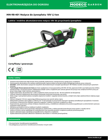 ELEKTRONARZĘDZIA DO OGRODU MN-98-401 Nożyce do żywopłotu 18V Li-Ion Lekkie i mobilne akumulatorowe nożyce 18V do przycinania żywopłotu Certyfikaty i gwarancje: Cechy i zalety • Zasilanie akumulatorowe daje bardzo dużą swobodę użytkowanie i nieograniczony zasięg pracy urządzenia • Zastosowanie akumulatora do zasilana wyeliminowało częsty problem przecięcia kabla zasilającego podczas pracy nożycami • One4All - jeden akumulator pasuje do wszystkich akumulatorowych narzędzi ogrodowych 18V Modeco Garden oznaczonych systemem One4All • Technologia litowo-jonowa (Li-Ion) jest dużo wydajniesza niż jej poprzednicy (Ni-MH, Ni-Cd), zapewnia krótki czas ładowania bez efektu pamięciowego, utrzymuje poziom naładowania (dzięki czemu urządzenie jest zawsze gotowe do pracy) oraz zwiększa komfort pracy po przez niską wagę i małe rozmiary akumulatora • Dzięki pojemnemu akumulatorowi 1,5Ah urządzenie może pracować ok 30 - 40 min (zależnie od obciążenia) • LEDowy wskaźnik naładowania akumulatora pozawala oszacować pozostały czas pracy • Niska waga i wytrzymała budowa narzędzia zapewnia trwałość i wygodę manewrowania, a dzięki temu daje użytkownikowi większą wygo dę pracy • Ostrza o długości 510 mm zapewniają efektywną pracę oraz szeroki zakres cięcia • Maksymalna grubość cięcia gałęzi o śrdenicy do 15 mm pozwala na przycinanie starszych i bardziej zaniedbanych żywopłotów i krzewów • Gumowana, ergonomiczna rękojeść zapewnia wygodne i stabilne trzymanie urządzenia w dłoni • Ergonomiczny, gumowany uchwyt zmiejsza zmęczenie pracą, a dodatkowe zabezpiecznie przed przypadkowym uruchomieniem wymusza trzymanie nożyc oburącz • Metalowa prowadnica ostrzy zwiększa trwałość urządzenia • Przeźroczysta osłona ostrzy pozawala zabezpiecza użytkownika, a także pozwala kontrolować pracę nawet u nasady ostrza • Osłona na końcu ostrzy zapobiega ich uszkodzeniom oraz pozwala powiesić urządzenie podczas przechowywania • System zabezpieczający zapobiega przypadkowemu włączeniu urządzenia • Szybka ładowarka pozwala całkowicie naładować akumulator w niewiele ponad godzinę Zastosowanie • Do przycinania i kształtowania żywopłotów • Do pielęgnacji, przycinania i kształtowania krzewów i innych roślin www.modeco.pl ELEKTRONARZĘDZIA DO OGRODU Wyposażenie • 1 akumulator Li-Ion 18V 1,5Ah One4All z wskaźnikiem naładowania • Szybka ładowarka Użytkownicy • Ogrodnicy Dane techniczne Indeks MN-98-401 ** Napięcie Opakowanie jed nostkowe Opakowanie zbiorcze Waga opakowa nia jednostkowe go Waga opakowa nia zbiorczego [V] [szt] [szt] [kg] [kg] 18 1 4 2.8 11.2 akumulator One4All - Li-Ion 18 V akumulator prędkość Długość ostrza Maksymalna średnica cięcia czas ładowania akumulatora 1,5 Ah 1200 /min 510 mm 15 mm 72 min EAN 5906675324203 ** Nowość w ofercie sprzedażowej. Ostrzeżenia • • • • • Przeczytaj instrukcję obsługi Zawsze używaj ochrony oczu (okulary, gogle lub przyłbice ochronne) Zawsze używaj ochrony rąk (rękawice) Zawsze używaj ochrony słuchu (nauszniki, zatyczki do uszu) INSTRUKCJA OBSŁUGI. Zawsze przestrzegaj wskazówek dotyczących bezpieczeństwa zawartych w instrukcji obsługi i obowiązujących przepisów BHP. Nie przestrzeganie zawartych w niej ostrzeżeń i zaleceń może być przyczyną porażenia prądem, pożaru, a także poważne go uszkodzenia ciała, a nawet śmierci. Należy dokładnie przeczytać i zrozumieć instrukcję obsługi, a także zachować ją do późniejszego wglądu www.modeco.pl