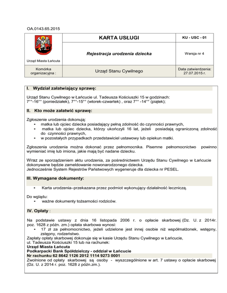 OA.0143.65.2015 KARTA USŁUGI KU - USC - 01 Rejestracja urodzenia dziecka Wersja nr 4 Urząd Stanu Cywilnego Data zatwierdzenia: 27.07.2015 r. Urząd Miasta Łańcuta Komórka organizacyjna : I. Wydział załatwiający sprawę: Urząd Stanu Cywilnego w Łańcucie ul. Tadeusza Kościuszki 15 w godzinach: 7°°-16°° (poniedziałek), 7°°-15°° (wtorek-czwartek) , oraz 7°° -14°° (piątek); II. Kto może załatwić sprawę: Zgłoszenie urodzenia dokonują: • matka lub ojciec dziecka posiadający pełną zdolność do czynności prawnych, • matka lub ojciec dziecka, którzy ukończyli 16 lat, jeżeli posiadają ograniczoną zdolność do czynności prawnych, • w pozostałych przypadkach przedstawiciel ustawowy lub opiekun matki. Zgłoszenia urodzenia można dokonać przez pełnomocnika. Pisemne pełnomocnictwo wymieniać imię lub imiona, jakie mają być nadane dziecku. powinno Wraz ze sporządzeniem aktu urodzenia, za pośrednictwem Urzędu Stanu Cywilnego w Łańcucie dokonywane będzie zameldowanie nowonarodzonego dziecka. Jednocześnie System Rejestrów Państwowych wygeneruje dla dziecka nr PESEL. III. Wymagane dokumenty: • Karta urodzenia–przekazana przez podmiot wykonujący działalność leczniczą. Do wglądu: • ważne dokumenty tożsamości rodziców. IV. Opłaty : Na podstawie ustawy z dnia 16 listopada 2006 r. o opłacie skarbowej (Dz. U. z 2014r. poz. 1628 z późn. zm.) opłata skarbowa wynosi: • 17 zł za pełnomocnictwo, jeżeli udzielone jest innej osobie niż współmałżonek, wstępny, zstępny, rodzeństwo. Zapłaty opłaty skarbowej dokonuje się w kasie Urzędu Stanu Cywilnego w Łańcucie, ul. Tadeusza Kościuszki 15 lub na rachunek: Urząd Miasta Łańcuta Podkarpacki Bank Spółdzielczy - oddział w Łańcucie Nr rachunku 62 8642 1126 2012 1114 9273 0001 Zwolnione od opłaty skarbowej są osoby - wyszczególnione w art. 7 ustawy o opłacie skarbowej (Dz. U. z 2014 r. poz. 1628 z późn.zm.). Składający wniosek lub pełnomocnictwo zobowiązany jest dołączyć dowód zapłaty należnej opłaty skarbowej , albo uwierzytelnioną kopię dowodu zapłaty nie później niż w ciągu 3 dni od dnia złożenia wniosku lub pełnomocnictwa. V. Termin załatwienia sprawy Akt urodzenia sporządza się w dniu zgłoszenia urodzenia dziecka. VI. Dodatkowe uzgodnienia z innymi wydziałami, instytucjami: Brak wymagań. VII. Miejsce, w którym można uzyskać informacje: Urząd Stanu Cywilnego w Łańcucie, ul. Tadeusza Kościuszki 15 w godzinach: 7˚˚- 16˚˚ (poniedziałek) 7˚˚- 15˚˚ (wtorek-czwartek). 7˚˚- 14˚˚ (piątek). VIII.Podstawa prawna: • art. 32 ust. 1, 55, 57, 59 ustawy z dnia 28 listopada 2014 r. Prawo o aktach stanu cywilnego (Dz. U. 2014 r. poz. 1741 z późn.zm.) • Rozporządzenie Ministra Spraw Wewnętrznych z dnia 9 lutego2015 r. w sprawie sposobu prowadzenia rejestru stanu cywilnego oraz akt zbiorowych rejestracji stanu cywilnego (Dz.U. z 2015 r., poz. 225) • Rozporządzenia Ministra Zdrowia z dn. 12 stycznia 2015 r. w sprawie wzorów karty urodzenia i karty martwego urodzenia (Dz. U. z 2015 r. poz. 171) IX. Tryb odwoławczy: Stronie przysługuje prawo wniesienia odwołania do Wojewody Podkarpackiego w Rzeszowie, za pośrednictwem Kierownika Urzędu Stanu Cywilnego w Łańcucie, w terminie 14 dni od dnia doręczenia decyzji odmawiającej dokonanie czynności. X. Inne informacje: Zgłoszenia urodzenia dziecka dokonuje się w terminie: • 21 dni od dnia sporządzenia karty urodzenia, • 3 dni od dnia sporządzenia karty martwego urodzenia. Jeżeli zgłoszenie nie zostanie dokonane we wskazanych wyżej terminach Kierownik Urzędu Stanu Cywilnego sporządza z urzędu akt urodzenia, z adnotacją o sporządzeniu aktu z urzędu oraz informuje rodziców dziecka o jego sporządzeniu. Osoba zgłaszająca urodzenie składa oświadczenie o wyborze nie więcej, niż dwóch imion dziecka. Kierownik Urzędu Stanu Cywilnego odmawia przyjęcia oświadczenia o wyborze imienia lub imion dziecka, jeżeli wybrane imię lub imiona są w formie zdrobniałej lub mają charakter ośmieszający lub nieprzyzwoity lub nie wskazują na płeć dziecka, kierując się powszechnym znaczeniem imienia i wybiera dziecku imię z urzędu, w formie decyzji administracyjnej podlegającej natychmiastowemu wykonaniu. Kierownik urzędu stanu cywilnego zapewnia udział biegłych lub tłumaczy, jeżeli nie potrafi samodzielnie porozumieć się z osobami uczestniczącymi w czynnościach zgłoszenia urodzenia. XI. Formularze wniosków: Brak - zgłoszenia należy dokonać ustnie. Urząd Stanu Cywilnego ul. Kościuszki 15 ● [email protected] ● tel. (017) 225 20 24 Stanowisko Imię i nazwisko Data Opracował : Kierownik Iwona Olszańska 27.07.2015 Zatwierdził : Kierownik Marek Sowa 27.07.2015 Wprowadził na stronę BIP: Podinspektor Bogusław Dubiel 27.07.2015 Osoba odpowiedzialna za aktualizację: Kierownik Iwona Olszańska 27.07.2015