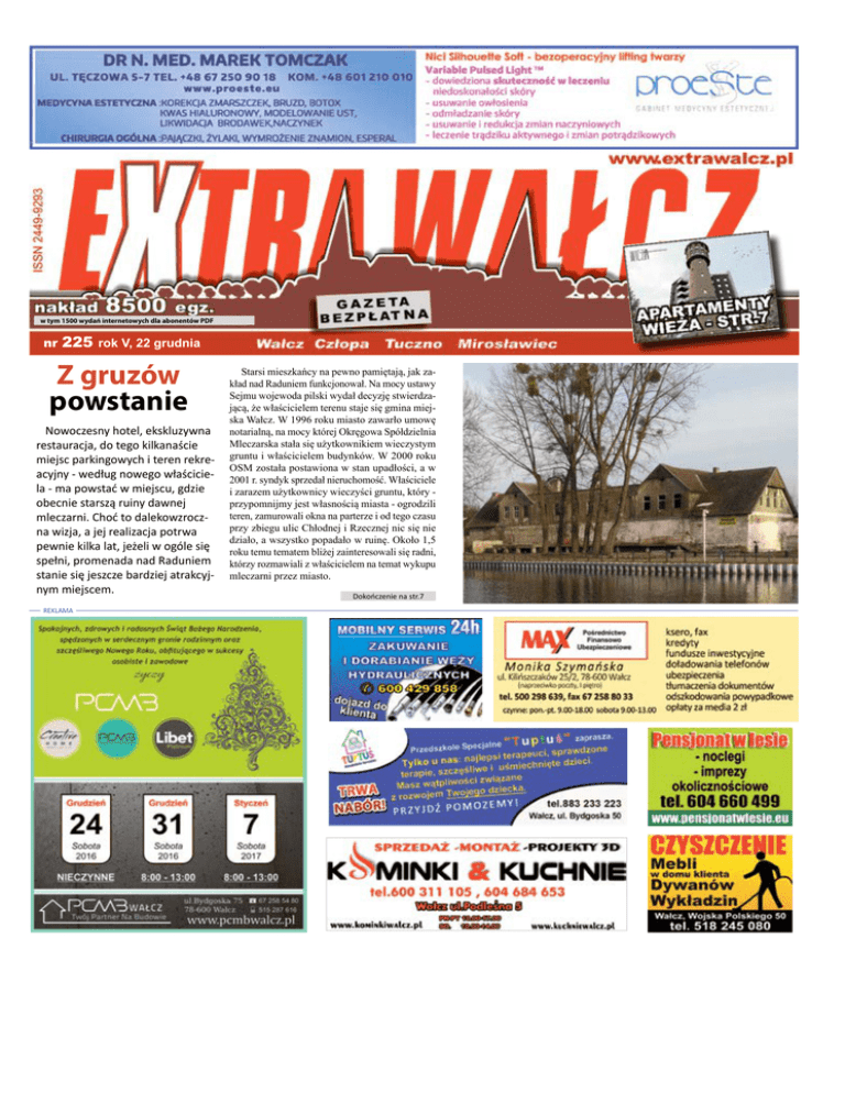 w tym 1500 wydań internetowych dla abonentów PDF nr 225 rok V, 22 grudnia Z gruzów powstanie Nowoczesny hotel, ekskluzywna restauracja, do tego kilkanaście miejsc parkingowych i teren rekreacyjny - według nowego właściciela - ma powstać w miejscu, gdzie obecnie starszą ruiny dawnej mleczarni. Choć to dalekowzroczna wizja, a jej realizacja potrwa pewnie kilka lat, jeżeli w ogóle się spełni, promenada nad Raduniem stanie się jeszcze bardziej atrakcyjnym miejscem. REKLAMA Starsi mieszkańcy na pewno pamiętają, jak zakład nad Raduniem funkcjonował. Na mocy ustawy Sejmu wojewoda pilski wydał decyzję stwierdzającą, że właścicielem terenu staje się gmina miejska Wałcz. W 1996 roku miasto zawarło umowę notarialną, na mocy której Okręgowa Spółdzielnia Mleczarska stała się użytkownikiem wieczystym gruntu i właścicielem budynków. W 2000 roku OSM została postawiona w stan upadłości, a w 2001 r. syndyk sprzedał nieruchomość. Właściciele i zarazem użytkownicy wieczyści gruntu, który przypomnijmy jest własnością miasta - ogrodzili teren, zamurowali okna na parterze i od tego czasu przy zbiegu ulic Chłodnej i Rzecznej nic się nie działo, a wszystko popadało w ruinę. Około 1,5 roku temu tematem bliżej zainteresowali się radni, którzy rozmawiali z właścicielem na temat wykupu mleczarni przez miasto. Dokończenie na str.7 2 EXTRAWAŁCZ nr 225 ŚWIĄTECZNE MARZENIA To ostatnie wydanie w tym roku. Trudno mijający rok zaliczyć do udanych, więc może i dobrze, że się kończy. Pozostaje nadzieja, że przyszły będzie lepszy. Nie, to nie nadzieja. Jestem o tym przekonany. Może nie będę musiał tracić czasu na oglądanie wiadomości w dwóch różnych stacjach, aby wyciągnąć poprawne wnioski, odsiewając od informacji plewy manipulacji. Może w końcu skończą się zamachy terrorystyczne, którymi nie kieruje żaden Bóg, ale ułomność ludzka. Może politycy zrobią krok w tył, jak sugeruje poseł Paweł Suski, i dojdą do mądrych refleksji, bo do czego w końcu doprowadzić mogą zaciekłe ataki jednych na drugich? Może w regionie pojawią się nowe inwestycje i to takie, które zadowolą nawet niezadowolonych? Może dowiem się o co chodzi w reformie oświaty, bo córka zaraz zniechęci się do szkoły tak bardzo, że zacznie chodzić na wagary? Może doczekam się, aby politycy przestali być śmieszni, ale w końcu byli uśmiechnięci? Życzę więc sobie i Wam wszystkim, aby podczas świąt było jak najmniej tej wszędobylskiej polityki. Przynajmniej przez kilka dni. Nawet jak usłyszycie marudzenie starszego domownika, ale nie będzie ono powiązane to z polityką, radujcie się. Jeśli babcia przeklęła stojąc przy patelni, to bądźcie przekonani, że oparzyła się smażąc karpia, a nie dlatego, że dowiedziała się, co chcą zrobić z jej emeryturą. Jeśli zobaczycie w TV niskiego pana z siwym włosem, to bądźcie przekonani, że jest to Mikołaj, nawet jak nie będzie miał czerwonej pelerynki i worka z prezentami. Jeśli nawet te święta nie będą doskonałe, bo będą odbiegać od waszego ideału, a prezenty znowu nie będą trafione, to nie przejmujcie się tym, tylko poszukajcie tych pozytywnych rzeczy, Jest ich naprawdę wiele. Problem w tym, że ostatnio nie szukamy rzeczy, które nas łączą, szczególnie w rodzinie, ale szukamy tego, co nas może dzielić. Jeśli mamy się już dzielić, to tylko opłatkiem. Tego życzę w imieniu swoim i całej redakcji. Z bardziej szczegółowymi życzeniami proponuje się zapoznać w niniejszym wydaniu. Zobaczcie, kto wam dobrze życzy. PS Do zobaczenia w styczniu. Piotr Kurzyna REKLAMA Felieton naczelnego REKLAMA POŻYCZKA Nawet w 24h do 25 000 zł szybko i uczciwie 696 743 554 * www.szczecin.proficredit.pl *koszt połączenia zgodny z taryfą operatora Twoje pieniądze ADRES REDAKCJI ul. Bankowa 2, 78-600 Wałcz REDAKTOR NACZELNY Piotr Kurzyna I ZESPÓŁ REDAGUJĄCY KONTAKT: e-mail: [email protected] www.extrawalcz.pl, tel.: 67 387 42 43 Redakcja czynna od poniedziałku do piątku w godzinach od 9:00 do 15:00 WYDAWCA: Agencja 3 Głowy Prodakszyn PRZYGOTOWANIE GRAFICZNE: mi KloszArt DRUK: Drukarnia AGORA S.A. Redakcja nie ponosi odpowiedzialności za treść zamieszanych reklam i ogłoszeń oraz zastrzega sobie prawo do redagowania i skracania nadesłanych tekstów. Listy nadsyłane do redakcji są wyrazem opinii ich autorów. Redakcja nie zwraca materiałów niezamówionych. Czwartek, 22grudnia 2016 3 4 EXTRAWAŁCZ nr 225 OGŁOSZENIA DROBNE 99 gr za słowo zgłoszenia osobiście w redakcji! Zapraszamy do redakcji Extra Wałcz, ul. Bankowa 2, Wałcz LOKALE, NIERUCHOMOŚCI: 71/6/72] Wynajmę sklep na ul. Kilińszczaków. tel. 67 258 26 84 Sprzedam nowe bezczynszowe mieszkanie, 40 m2, 3150zł/m2 tel. 882 09 36 40 Mieszkanie bezczynszowe przy Al. Zdobywców Wału Pomorskiego, sprzedam, 55,59 m2 . Tel. 515 065 440 Sprzedam nowe mieszkanie w Wałczu, 41,64 m2 , 2- pokojowe. Tel. 515 065 440 Sprzedam garaż z kanałem na Dolnym Mieście. Tel. 662362939 Wynajmę mieszkanie w Wałczu tel: 604 660 499 Sprzedam dwa mieszkania. Jedno bezczynszowe, własnościo- RÓŻNE: we. Drugie bezczynszowe po [80/6/75] Remonty, wykańczaczęściowym remoncie. nie mieszkań. tel. 739 531 694 tel. 67 387 32 17 kom. 608 79 72 24 GOTÓWKA NA DOWOLNY CEL ZADZWOŃ 882 069 266 Wynajmę lokal [85/2/213] Usługi ogólnobutel. 725 929 462 dowlane, remonty mieszkań. tel. 662 332 515 4 osobowe pokoje do wynajecia tel. 790 386 813 , 602 187 624 Ocieplanie budynków, tel. 881 507 760 Sprzedam ziemię rolną 121 ha, [79/10/12] BIURO MATRYMOgmina Człopa. NIALNE „Dana”. tel,.501 871 707 tel. 695 06 20 20 Sprzedam mieszkanie 57m2 w 79/12/11] NIEMIECKI Z SUKCESEM. Nauka, korepetycje, centrum Wałcza. cena 129 tyś niemiecki dla opiekunek, tłuTel.535 883 873. maczenia zwykłe, matura. tel. 726 173 057 Wynajem pokoi tel. 888 108 966 Zatrudnię pracownika budowlanego na stałe Sprzedam mieszkanie 2 pok