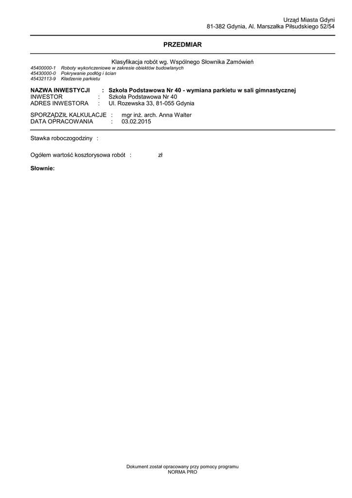 Urząd Miasta Gdyni 81-382 Gdynia, Al. Marszałka Piłsudskiego 52/54 PRZEDMIAR Klasyfikacja robót wg. Wspólnego Słownika Zamówień 45400000-1 45430000-0 45432113-9 Roboty wykończeniowe w zakresie obiektów budowlanych Pokrywanie podłóg i ścian Kładzenie parkietu NAZWA INWESTYCJI INWESTOR ADRES INWESTORA : : : Szkoła Podstawowa Nr 40 - wymiana parkietu w sali gimnastycznej Szkoła Podstawowa Nr 40 Ul. Rozewska 33, 81-055 Gdynia SPORZĄDZIŁ KALKULACJE : DATA OPRACOWANIA : mgr inż. arch. Anna Walter 03.02.2015 Stawka roboczogodziny : Ogółem wartość kosztorysowa robót : zł Słownie: Dokument został opracowany przy pomocy programu NORMA PRO Szkoła Podstawowa Nr 40 PRZEDMIAR Lp. Nr spec.techn. Opis i wyliczenia Zespół Szkól Ogólnokształcących Nr 5 - wymiana parkietu 1 1.1 j.m. Razem Wymiana posadzek - parkiet Roboty rozbiórkowe 1.1.1 m2 m2 Demontaż drzwi 2,80 2,800 1.2 Roboty budowlane 1.2.1 SST 00.01 Przygotowanie podłoża. Oczyszczenie podłoża 29,76*14,97 m2 m2 1.2.2 SST 00.01 Izolacje przeciwwilgociowe z folii PE gr. 20-30mm, żółtej 445,507 m2 m2 1.2.3 SST 00.01 Ułożenie legarów krzyżowo co 80cm w osi belek, wymiary belek 80x65mm, impregnowane grzybobójczo i przeciwwilgotnościowo preparatami stosowanymi w pomieszczeniach 445,507 m2 445,507 445,507 m2 445,507 1.2.4 SST 00.01 Izolacje cieplne i przeciwdźwiękowe z wełny mineralnej gr. 10cm 445,507 m2 m2 1.2.5 SST 00.01 Ułożenie podkładek elastycznych 445,507 m2 m2 1.2.6 SST 00.01 Deskowanie z płyt OSB o podwyższonej wytrzymałości, zaimpregnowane 445,507 m2 m2 1.2.7 SST 00.01 Ułożenie tektury falistej na deskowaniu 445,507 m2 m2 1.2.8 SST 00.01 Posadzki z parkietu - parkiet dębowy gat. I, typu SPORT, układany na gwoździe lub śruby - parkiet nowy 20% 89,10 m2 Posadzki z parkietu - parkiet dębowy gat. I, typu SPORT, układany na gwoździe lub śruby - parkiet z odzysku 80% 356,40 m2 445,507 445,507 445,507 445,507 m2 89,100 1.2.9 SST 00.01 m2 356,400 1.2.10 SST 00.01 Montaż cokołów przyściennych wys 75mm ze szczeliną wentylacyjną - nowe 10mb 10 m m 1.2.11 SST 00.01 Montaż cokołów przyściennych wys 75mm ze szczeliną wentylacyjną - z odzysku (29,76*2+14,97*2)-10 m m 1.2.12 SST 00.01 Mechaniczne cyklinowanie posadzek 445,507 m2 m2 1.2.13 SST 00.01 Lakierowanie posadzek i parkietów - podkład 445,507 m2 m2 1.2.14 SST 00.01 Lakierowanie dwukrotne posadzek z deszczułek. Krotność = 2 445,507 m2 Dwukrotne malowanie farbą olejną lub ftalową linii boiskowych (boisko wielofunkcyjne do 3 dyscyplin) na podłogach drewnianych o szer. do 20cm Krotność = 1,5 300 m 10,000 79,460 445,507 445,507 m2 445,507 1.2.15 SST 00.01 m 300,000 1.2.16 SST 00.01 Malowanie ścian po obwodzie farbą olejną półmatową do wysokości 2,20m 29,76*2*2,20 14,97*2*2,20 m2 m2 m2 1.2.17 SST 00.01 Drzwi dwuskrzydłowe PCV, białe z panelem, z ruchomym słupkiem, bez progu, profil wzmocniony, wymiary drzwi 140x200cm, skrzydło drzwiowe szer. 100cm 2,80 m2 196,812 m2 2,800 -2- Norma PRO Wersja 4.33 Nr seryjny: 23689 Użytkownik: UM w Gdyni