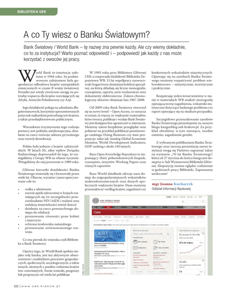 BIBLIOTEKA UEK A co Ty wiesz o Banku Światowym? Bank Światowy / World Bank – tę nazwę zna pewnie każdy. Ale czy wiemy dokładnie, co to za instytucja? Warto poznać odpowiedź i – podpowiedź jak każdy z nas może korzystać z owoców jej pracy. W orld Bank to instytucja założona w 1944 roku. Jej podstawowym założeniem była gospodarcza odbudowa krajów europejskich zniszczonych w czasie II wojny światowej. Ponadto już wtedy zwrócono uwagę na potrzebę wsparcia dla krajów rozwijających się Afryki, Ameryki Południowej czy Azji. W 1993 roku przy Bibliotece Głównej UEK-u rozpoczęła działalność Biblioteka Depozytowa WB. 15 lat współpracy zaowocowało bogactwem dzisiejszej kolekcji specjalnej, na którą składają się liczne monografie, czasopisma, raporty, serie wydawnicze oraz dokumenty elektroniczne. Zakres chronologiczny zbiorów obejmuje lata 1967-2008. Jego działalność polega na udzielaniu długoterminowych, korzystnie oprocentowanych pożyczek najbardziej potrzebującym krajom, a także przedsiębiorstwom publicznym. Od 2009 roku Bank Światowy otworzył się na nowy trend – Open Access, co oznacza ni mniej, ni więcej, że większość materiałów, które tworzy, publikuje i wydaje Bank Światowy jest dostępna bez ograniczeń w internecie. Możemy zatem bezpłatnie przeglądać oraz pobierać na przykład publikacje prestiżowego rankingu Doing Business czy inne propozycje, takie jak: katalog Global Economic Monitor, World Development Indicators, GDP ranking i około 150 innych. Warunkiem trzymywania tego rodzaju pomocy jest polityka antykorupcyjna, działania na rzecz rozwoju sektora prywatnego oraz rozwój demokracji. Polska była jednym z krajów założycielskich. W latach 50., silny wpływ Związku Radzieckiego doprowadził do tego, że wystąpiliśmy z Grupy WB na własne życzenie. Wstąpiliśmy do niej ponownie w 1989 roku. Baza Open Knowledge Repository to imponujący zbiór pełnotekstowych książek, czasopism, zeszytów Working Papers oraz różnych raportów. Główne kierunki działalności Banku Światowego zmieniały się i formowały przez wiele lat. Obecne, wyraźne i jasno sprecyzowane cele to: t t t t t t Baza World dataBank oferuje nam dostęp do najpopularniejszych wskaźników makroekonomicznych oraz danych społecznych większości krajów. Dane możemy przeszukiwać według krajów, zagadnień czy walka z ubóstwem rozwój opieki zdrowotnej w krajach rozwijających się (w szczególności przeciwdziałanie HIV/AIDS i malarii oraz redukcja śmiertelności wśród dzieci) działania na rzecz powszechnego dostępu do edukacji promowanie równości praw kobiet i mężczyzn ochrona środowiska naturalnego promowanie zrównoważonego rozwoju. Oprócz tego, że World Bank spełnia niejako rolę banku, jest też aktywnym obserwatorem i analitykiem procesów gospodarczych, społecznych, socjologicznych, a także innych, istotnych z punktu widzenia krajów tzw. rozwiniętych. Swoje wnioski, prognozy lub propozycje od wielu lat publikuje. 48 | w w w . u e k . k r a k o w . p l Źródło: internet Co ma piernik do wiatraka czyli Biblioteka a Bank Światowy konkretnych wskaźników statystycznych. Opierając się na zasobach Banku Światowego możemy rozpatrywać problem wielowektorowo – statystycznie, teoretycznie i praktycznie. Rozpatrując jeden temat jesteśmy w stanie w materiałach WB znaleźć monografię opisującą teorię zagadnienia, wskaźniki statystyczne dotyczące badanego problemu czy raport opierający się na studium przypadku. Szczegółowe przeszukiwanie zasobów Banku Światowego prezentujemy na naszym blogu kangurblog.uek.krakow.pl. Za przykład obraliśmy w tym miesiącu, modne ostatnio, zagadnienie gender. Z wybranymi publikacjami Banku Światowego oraz szerszą prezentacją samej instytucji mogą się Państwo zapoznać także na wystawie „70 lat Banku Światowego”, która od 27 stycznia do końca lutego jest dostępna w Sali Wystawowej Biblioteki Głównej. Ekspozycję można oglądać codziennie w godzinach pracy Biblioteki. Zapraszamy serdecznie! mgr Joanna Kucharzyk Oddział Informacji Naukowej