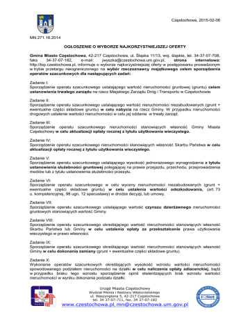 Częstochowa, 2015-02-06 MN.271.16.2014 OGŁOSZENIE O WYBORZE NAJKORZYSTNIEJSZEJ OFERTY Gmina Miasto Częstochowa, 42-217 Częstochowa, ul. Śląska 11/13, woj. śląskie, tel. 34-37-07-708, faks 34-37-07-182, e-mail: [email protected], strona internetowa: http://bip.czestochowa.pl, informuje o wyborze najkorzystniejszej oferty w postępowaniu prowadzonym w trybie przetargu nieograniczonego na wybór rzeczoznawcy majątkowego celem sporządzenia operatów szacunkowych dla następujących zadań: Zadanie I: Sporządzenie operatu szacunkowego ustalającego wartość nieruchomości gruntowej (gruntu) celem ustanowienia trwałego zarządu na rzecz Miejskiego Zarządu Dróg i Transportu w Częstochowie Zadanie II: Sporządzenie operatu szacunkowego ustalającego wartość nieruchomości niezabudowanych (grunt + ewentualne części składowe gruntu) w celu nabycia na rzecz Gminy. W przypadku nieruchomości drogowych ustalenie wartości nieruchomości w celu jej oddania w trwały zarząd. Zadanie III: Sporządzenie operatu szacunkowego nieruchomości stanowiących własność Gminy Miasta Częstochowy w celu aktualizacji opłaty rocznej z tytułu użytkowania wieczystego. Zadanie IV: Sporządzenie operatu szacunkowego nieruchomości stanowiących własność Skarbu Państwa w celu aktualizacji opłaty rocznej z tytułu użytkowania wieczystego. Zadanie V: Sporządzenie operatu szacunkowego ustalającego wysokość jednorazowego wynagrodzenia z tytułu ustanowienia służebności gruntowej polegającej na prawie przejazdu, przechodu, przeprowadzenia mediów lub z tytułu ustanowienia służebności przesyłu. Zadanie VI: Sporządzenie operatu szacunkowego w celu wyceny nieruchomości niezabudowanych (grunt + ewentualne części składowe gruntu) w celu ustalenia wartości odszkodowania, (art. 73 u. kompetencyjnej, 98 ugn, 12 specustawy) w drodze decyzji, lub umowy. Zadanie VII: Sporządzenie operatu szacunkowego ustalającego wartość czynszu dzierżawnego nieruchomości gruntowych stanowiących wartość Gminy. Zadanie VIII: Sporządzenie operatu szacunkowego określającego wartość nieruchomości stanowiących własność Skarbu Państwa lub Gminy w celu ustalenia opłaty za przekształcenie prawa użytkowania wieczystego w prawo własności. Zadanie IX: Sporządzenie operatu szacunkowego określającego wartość nieruchomości stanowiących własność Gminy w celu dokonania zamiany (grunt + ewentualne części składowe gruntu). Zadanie X: Wykonanie operatów szacunkowych określających wysokość wzrostu wartości nieruchomości spowodowanego podziałem nieruchomości na działki w celu naliczenia opłaty adiacenckiej, bądź w przypadku braku tego wzrostu sporządzenie opinii stwierdzających brak wzrostu wartości nieruchomości w wyniku dokonania podziału działki. Urząd Miasta Częstochowy Wydział Mienia i Nadzoru Właścicielskiego ul. Waszyngtona 5, 42-217 Częstochowa tel. 34 37-07-711, fax. 34 37-07-182 www.czestochowa.pl, [email protected] Zadanie XI: Sporządzenie operatu szacunkowego określającego wartość nieruchomości gruntowej w celu naliczenia opłaty planistycznej. Zadanie XII: Sporządzenie operatu szacunkowego określającego wartość nieruchomości: a) stanowiących własność Skarbu Państwa w celu przekazania w trwały zarząd, b) stanowiących własność Skarbu Państwa, Gminy w celu wygaszenia trwałego zarządu, c) stanowiących własność Gminy w celu realizacji roszczeń osób prawnych o oddanie nieruchomości w użytkowanie wieczyste. Zadanie XIII: Wycena nieruchomości Skarbu Państwa podlegających zwrotowi na rzecz byłego właściciela z uwzględnieniem art. 140 ust. 4 ustawy o gospodarce nieruchomościami (wzrostu lub zmniejszenia wartości nieruchomości na skutek działań podjętych na nieruchomości po wywłaszczeniu). Zadanie XIV: Sporządzenie operatu szacunkowego określającego wartość rynkową nieruchomości niezabudowanych w celu : a) sprzedaży w drodze przetargu, b) sprzedaży w drodze bezprzetargowej na poprawę warunków zagospodarowania nieruchomości sąsiedniej. Zadanie XV: Sporządzenie operatu szacunkowego określającego wartość rynkową nieruchomości niezabudowanych w celu : a) sprzedaży w drodze przetargu, b) sprzedaży w drodze bezprzetargowej na poprawę warunków zagospodarowania nieruchomości sąsiedniej. Zadanie XVI: Sporządzenie operatu szacunkowego ustalającego wartość rynkową nieruchomości zabudowanych: a) budowlami lub budynkami o kubaturze do 2 000 m3, b) budowlami lub budynkami o kubaturze powyżej 2 000 m3. Zadanie XVII: Wykonanie 50 szt. operatów szacunkowych na potrzeby ustalenia wartości rynkowej lokali mieszkalnych wraz z pomieszczeniami do nich przynależnymi i udziałem w częściach wspólnych budynku oraz wartości rynkowej ułamkowej części gruntu przypadającego do tych lokali wraz z inwentaryzacją uzyskanie zaświadczenia o samodzielności lokali położonych na terenie Miasta Częstochowy stanowiących własność Gminy Miasto Częstochowa, przeznaczonych do zbycia na rzecz ich najemców. Zadanie XVIII: Wykonanie 50 szt. operatów szacunkowych na potrzeby ustalenia wartości rynkowej lokali mieszkalnych wraz z pomieszczeniami do nich przynależnymi i udziałem w częściach wspólnych budynku oraz wartości rynkowej ułamkowej części gruntu przypadającego do tych lokali wraz z inwentaryzacją uzyskanie zaświadczenia o samodzielności lokali położonych na terenie Miasta Częstochowy stanowiących własność Gminy Miasto Częstochowa, przeznaczonych do zbycia na rzecz ich najemców. Zadanie XIX: Wykonanie 50 szt. operatów szacunkowych na potrzeby ustalenia wartości rynkowej lokali mieszkalnych wraz z pomieszczeniami do nich przynależnymi i udziałem w częściach wspólnych budynku oraz wartości rynkowej ułamkowej części gruntu przypadającego do tych lokali wraz z inwentaryzacją uzyskanie zaświadczenia o samodzielności lokali położonych na terenie Miasta Częstoc