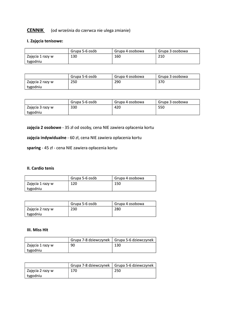 CENNIK (od września do czerwca nie ulega zmianie) I. Zajęcia tenisowe: Zajęcia 1 razy w tygodniu Zajęcia 2 razy w tygodniu Zajęcia 3 razy w tygodniu Grupa 5-6 osób 130 Grupa 4 osobowa 160 Grupa 3 osobowa 210 Grupa 5-6 osób 250 Grupa 4 osobowa 290 Grupa 3 osobowa 370 Grupa 5-6 osób 330 Grupa 4 osobowa 420 Grupa 3 osobowa 550 zajęcia 2 osobowe - 35 zł od osoby, cena NIE zawiera opłacenia kortu zajęcia indywidualne - 60 zł, cena NIE zawiera opłacenia kortu sparing - 45 zł - cena NIE zawiera opłacenia kortu II. Cardio tenis Zajęcia 1 razy w tygodniu Zajęcia 2 razy w tygodniu Grupa 5-6 osób 120 Grupa 4 osobowa 150 Grupa 5-6 osób 230 Grupa 4 osobowa 280 Grupa 7-8 dziewczynek 90 Grupa 5-6 dziewczynek 130 Grupa 7-8 dziewczynek 170 Grupa 5-6 dziewczynek 250 III. Miss Hit Zajęcia 1 razy w tygodniu Zajęcia 2 razy w tygodniu IV. Zajęcia dotyczące przygotowania sprawnościowego tenisistów Cena do ustalenia z trenerem V. Trening mentalny, konsultacje psychologiczne z psychologiem sportu Cena do ustalenia z psychologiem Nr konta 94 1020 1954 0000 7702 0151 8356 PKO Bank Polski. A. K. Skrobisz. Ul. Ks. J. Poniatowskiego 4A/12, 66-400 Gorzów Wlkp.