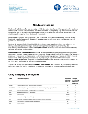 Niedokrwistości Niedokrwistość (anemia) jest chorobą, w której występuje nieprawidłowy poziom lub budowa czerwonych krwinek (erytrocytów), obniżone stężenie hemoglobiny czy też niedobory żelaza lub witaminy B12. Prawidłowe funkcjonowanie erytrocytów jest niezbędne do zachowania właściwego transportu tlenu do tkanek i komórek. Pierwszymi objawami niedokrwistości jest zazwyczaj nadmierne zmęczenie, bladość skóry, kruchość włosów i paznokci. Osłabienie układu odpornościowego prowadzi do nadmiernej podatności na infekcje. Pomimo iż większość niedokrwistości jest wynikiem nieprawidłowej diety czy zaburzeń ze strony przewodu pokarmowego, istnieją liczne genetyczne przyczyny choroby. Do najczęstszych wrodzonych anemii należą talasemie, w których dochodzi do nieprawidłowej syntezy łańcuchów hemoglobiny. Niedokrwistość sierpowatokrwinkowa, w której erytrocyty przyjmują charakterystyczny, sierpowaty kształt, zapewnia pacjentom oporność na zakażenie zarodźcem malarii, co tłumaczy znacząco zwiększone występowanie nosicieli uszkodzonego genu w rejonie Afryki środkowej i zachodniej. W Europie najpowszechniej występującym typem niedokrwistości jest sferocytoza wrodzona, związana z nieprawidłową budową błony erytrocytu i dotykająca ok. 1 na 2000 osób pochodzenia północnoeuropejskiego. Zawarta w niniejszym zestawieniu anemia Fanconiego jest chorobą, w której obserwuje się zwiększone ryzyko zachorowania na nowotwory, szczególnie nowotwory hematologiczne. Geny i zespoły genetyczne Gen Choroba/objawy Sposób Znane dziedzi- warianty czenia chorobotwórcze ABCB7 Anemia, sideroblastic, and spinocerebellar ataxia XL 9 ADAMTS13 Schulman-Upshaw syndrome, Thrombotic thrombocytopenic purpura, familial AR 23 ALAS2 Anemia, sideroblastic, Protoporphyria, erythropoietic XL 27 AMN Megaloblastic anemia-1, Norwegian AR 24 ANK1 Spherocytosis AD/AR 11 ATM Rak piersi, Ataksja-Telangiektazja AD/AR 260 ATR Cutaneous telangiectasia and cancer syndrome, Seckel syndrome AD/AR 6 ATRX Alfa talasemia z upośledzeniem umysłowym XL 38 BLM Zespół Blooma AR 52 Gen Choroba/objawy Sposób Znane dziedzi- warianty czenia chorobotwórcze BRCA2 Rak piersi, Rak jajnika, Rak trzustki, Guz Wilmsa, Anemia Fanconiego, Medulloblastoma, Glejak AD/AR 1244 BRIP1 Anemia Fanconiego, Rak piersi AD/AR 61 C15ORF41 Congenital dyserythropoietic anemia AR 2 CDAN1 Anemia, dyserythropoietic congenital AR 10 CUBN Megaloblastic anemia-1, Finnish AR 31 EPB42 Spherocytosis AR 11 ERCC4 Anemia Fanconiego, Xeroderma pigmentosum AR 10 FANCA Anemia Fanconiego AR 27 FANCB Anemia Fanconiego XL 7 FANCC Anemia Fanconiego AR 26 FANCD2 Anemia Fanconiego AR 6 FANCE Anemia Fanconiego AR 3 FANCF Anemia Fanconiego AR 6 FANCG Anemia Fanconiego AR 11 FANCI Anemia Fanconiego AR 7 FANCL Anemia Fanconiego AR 6 FANCM Anemia Fanconiego AR 2 G6PD Glucose-6-phosphate dehydrogenase deficiency XL 34 GATA1 Anemia, without thrombocytopenia, Thrombocytopenia with beta-thalessemia,, Dyserythropoietic anemia with thrombocytopenia XL 16 GPI Hemolytic anemia, nonspherocytic due to glucose phosphate isomerase deficiency AD 10 GSS Glutathione synthetase deficiency AR 7 HBA1 Alpha-thalassemia (Hemoglobin Bart syndrome), Alpha-thalassemia (Hemoglobin H disease) AR/Digenic 8 HBA2 Alpha-thalassemia (Hemoglobin Bart syndrome), Alpha-thalassemia (Hemoglobin H disease) AR/Digenic 21 HBB Sickle cell disease, Thalassemia-beta, dominant inclusion body, Other Thalassemias/Hemoglobinopathies, Beta-thalassemia AD/AR/Dig enic 166 HFE Hemochromatosis, choroba Alzheimera, postać późna AR/Digenic 7 KLF1 Anemia, dyserythropoietic congenital, Blood group, Lutheran inhibitor AD/BG 16 LPIN2 Majeed syndrome AR 5 MTR Methylmalonic acidemia AR 11 NBN Rak piersi, Zespół Nijmegen AD/AR 45 PALB2 Rak piersi, Rak prostaty, Rak trzustki, Anemia Fanconiego AD/AR 152 PC Pyruvate carboxylase deficiency AR 25 PDHA1 Leigh syndrome, Pyruvate dehydrogenase E1-alpha deficiency XL 36 PDHX Pyruvate dehydrogenase E3-binding protein deficiency AR 12 PKLR Pyruvate kinase deficiency AR 14 Gen Choroba/objawy PUS1 Mitochondrial myopathy and sideroblastic anemia RAD51C Anemia Fanconiego, Rak piersi, Rak jajnika RPL11 Sposób Znane dziedzi- warianty czenia chorobotwórcze AR 5 AD/AR 36 Diamond-Blackfan anemia AD 6 RPL15 Diamond-Blackfan anemia AD 1 RPL35A Diamond-Blackfan anemia AD 3 RPL5 Diamond-Blackfan anemia AD 8 RPS10 Diamond-Blackfan anemia AD 3 RPS17 Diamond-Blackfan anemia AD 4 RPS19 Diamond-Blackfan anemia AD 9 RPS24 Diamond-Blackfan anemia AD 4 RPS26 Diamond-Blackfan anemia AD 8 RPS29 Diamond-Blackfan anemia AD 2 RPS7 Diamond-Blackfan anemia AD 1 SBDS Anemia aplastyczna, Zespół Shwachmana-Diamonda AD/AR 12 SEC23B Anemia, dyserythropoietic congenital AR 12 SLC19A2 Thiamine-responsive megaloblastic anemia syndrome AR 10 SLC4A1 Spherocytosis, Ovalcytosis, Renal tubular acidosis, distal, with hemolytic anemia, Cryohydrocytosis AD/AR/BG 32 SLX4 Anemia Fanconiego AR 7 SPTA1 Spherocytosis, Ellipsocytosis, Pyropoikilocytosis AD/AR 22 SPTB Spherocytosis, Anemia, neonatal hemolytic, Ellipsocytosis AD/AR 16 THBD Nefropatia C3, Atypowy zespół hemolityczno-mocznicowy, Trombofilia związana z niedoborami trombomoduliny AD 5 TMPRSS6 Iron-refractory iron deficiency anemia AR 13 TPI1 Triosephosphate isomerase deficiency AR 8 XRCC2 Rak piersi AD/AR 4 YARS2 Myopathy, lactic acidosis, and sideroblastic anemia AR 15 Metodologia Informacja na temat metody badania: W pierwszej kolejności, z pobranej próbki krwi lub z bloczka parafinowego izolowany jest kwas deoksyrybonukleinowy (DNA), którego jakość i ilość jest określana w analizie spektrofotometrycznej i fluorymetrycznej. Po mechanicznej lub enzymatycznej fragmentacji, DNA jest wykorzystywany do stworzenia biblioteki, umożliwiającej oznaczenie, a następnie zsekwencjonowanie i analizę genów, które zostały wybrane w ramach zleconego panelu. Otrzymana biblioteka jest sekwencjonowana na sekwenatorze nowej 