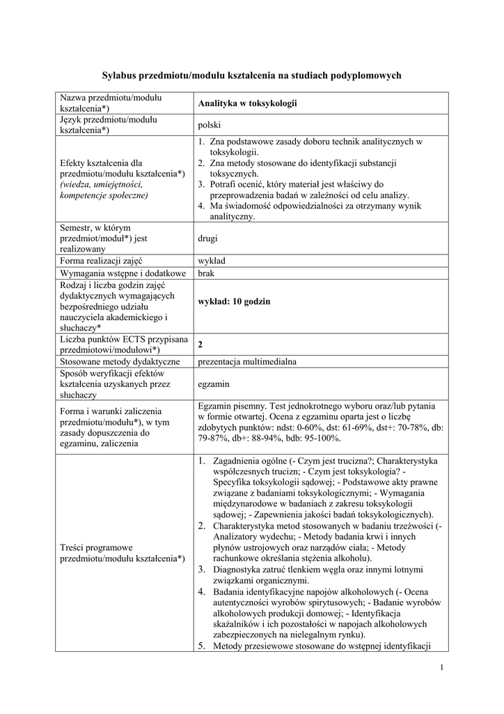 Sylabus przedmiotu/modułu kształcenia na studiach podyplomowych Nazwa przedmiotu/modułu kształcenia*) Język przedmiotu/modułu kształcenia*) Efekty kształcenia dla przedmiotu/modułu kształcenia*) (wiedza, umiejętności, kompetencje społeczne) Semestr, w którym przedmiot/moduł*) jest realizowany Forma realizacji zajęć Wymagania wstępne i dodatkowe Rodzaj i liczba godzin zajęć dydaktycznych wymagających bezpośredniego udziału nauczyciela akademickiego i słuchaczy* Liczba punktów ECTS przypisana przedmiotowi/modułowi*) Stosowane metody dydaktyczne Sposób weryfikacji efektów kształcenia uzyskanych przez słuchaczy Forma i warunki zaliczenia przedmiotu/modułu*), w tym zasady dopuszczenia do egzaminu, zaliczenia Analityka w toksykologii polski 1. Zna podstawowe zasady doboru technik analitycznych w toksykologii. 2. Zna metody stosowane do identyfikacji substancji toksycznych. 3. Potrafi ocenić, który materiał jest właściwy do przeprowadzenia badań w zależności od celu analizy. 4. Ma świadomość odpowiedzialności za otrzymany wynik analityczny. drugi wykład brak wykład: 10 godzin 2 prezentacja multimedialna egzamin Egzamin pisemny. Test jednokrotnego wyboru oraz/lub pytania w formie otwartej. Ocena z egzaminu oparta jest o liczbę zdobytych punktów: ndst: 0-60%, dst: 61-69%, dst+: 70-78%, db: 79-87%, db+: 88-94%, bdb: 95-100%. 1. Zagadnienia ogólne (- Czym jest trucizna?; Charakterystyka 2. Treści programowe przedmiotu/modułu kształcenia*) 3. 4. 5. współczesnych trucizn; - Czym jest toksykologia? Specyfika toksykologii sądowej; - Podstawowe akty prawne związane z badaniami toksykologicznymi; - Wymagania międzynarodowe w badaniach z zakresu toksykologii sądowej; - Zapewnienia jakości badań toksykologicznych). Charakterystyka metod stosowanych w badaniu trzeźwości (Analizatory wydechu; - Metody badania krwi i innych płynów ustrojowych oraz narządów ciała; - Metody rachunkowe określania stężenia alkoholu). Diagnostyka zatruć tlenkiem węgla oraz innymi lotnymi związkami organicznymi. Badania identyfikacyjne napojów alkoholowych (- Ocena autentyczności wyrobów spirytusowych; - Badanie wyrobów alkoholowych produkcji domowej; - Identyfikacja skażalników i ich pozostałości w napojach alkoholowych zabezpieczonych na nielegalnym rynku). Metody przesiewowe stosowane do wstępnej identyfikacji 1 produktów zabezpieczonych na rynku narkotykowym (Testy chemiczne, - Testy mikroskopowe, - Metody spektrometryczne wykorzystywane w przenośnych analizatorach). 6. Charakterystyka badań jakościowych i ilościowych produktów zabezpieczonych na rynku narkotykowym oraz oferowanych przez Internet, w tym „klasycznych” narkotyków, środków zastępczych tzw. dopalaczy oraz zafałszowanych leków. 7. Metody analityczne i statystyczne stosowane w profilowaniu narkotyków. 8. Badania kierowców przy drodze na obecność środków działających podobnie do alkoholu. 9. Identyfikacja i oznaczanie środków działających podobnie do alkoholu w materiale biologicznym metodami laboratoryjnymi. 10. Charakterystyka metod stosowanych do identyfikacji i oznaczania trucizn organicznych. 11. Przykładowe ekspertyzy z zakresu toksykologii sądowej. Wykaz literatury obowiązkowej i uzupełniającej 1. Negrusz A., Cooper G., Clarke's Analytical Forensic Toxicology, Pharmaceutical Press, 2008. 2. Kała M., Analiza toksykologiczna środków uzależniających, Wydawnictwo Instytutu Ekspertyz Sądowych, Kraków 2000. 3. Postępy w naukach sądowych, praca zbiorowa, Wydawnictwo Instytutu Ekspertyz Sądowych, Kraków 2009. 4. Chemia sądowa, praca zbiorowa, Wydawnictwo Instytutu Ekspertyz Sądowych, Kraków 2002. 5. Cole M.D., The analysis of controlled substances, John Wiley & Sons, Ltd, 2003. 6. Kała M., Analiza toksykologiczna mikrośladów, (w:) Analiza śladowa – Zastosowania, Baranowska I. (Red.), Malamut, Warszawa 2013. 7. Metody analizy środków uzależniających, praca zbiorowa, Instytut Psychiatrii i Neurologii, Warszawa 1997. 8. Suder P., Silberring J., Spektometria mas, Wydawnictwo Uniwersytetu Jagiellońskiego, Kraków 2006. 9. Szczepaniak W. Metody instrumentalne w analizie chemicznej, Wydawnictwo Naukowe PWN, Warszawa 2005. 10. Zadora G., Zuba D., Gas Chromatography in Forensic Science. Encyclopedia of Analytical Chemistry, John Wiley & Sons, Ltd, 2006. 11. Gubała W., Toksykologia alkoholu. Wybrane zagadnienia, Wydawnictwo Instytutu Ekspertyz Sądowych, Kraków 1997. *) moduł kształcenia to szeroko rozumiany przedmiot lub grupa przedmiotów. 2