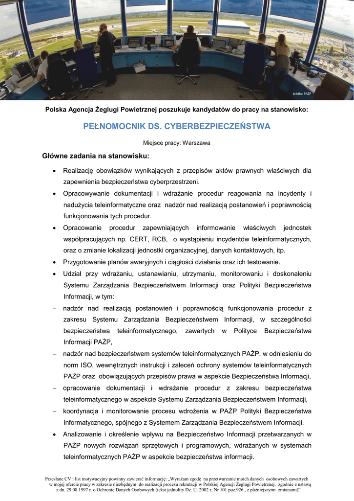 źródło: PAŻP Polska Agencja Żeglugi Powietrznej poszukuje kandydatów do pracy na stanowisko: PEŁNOMOCNIK DS. CYBERBEZPIECZEŃSTWA Miejsce pracy: Warszawa Główne zadania na stanowisku: Realizację obowiązków wynikających z przepisów aktów prawnych właściwych dla zapewnienia bezpieczeństwa cyberprzestrzeni. Opracowywanie dokumentacji i wdrażanie procedur reagowania na incydenty i nadużycia teleinformatyczne oraz nadzór nad realizacją postanowień i poprawnością funkcjonowania tych procedur. Opracowanie procedur zapewniających informowanie właściwych jednostek współpracujących np. CERT, RCB, o wystąpieniu incydentów teleinformatycznych, oraz o zmianie lokalizacji jednostki organizacyjnej, danych kontaktowych, itp. Przygotowanie planów awaryjnych i ciągłości działania oraz ich testowanie. Udział przy wdrażaniu, ustanawianiu, utrzymaniu, monitorowaniu i doskonaleniu Systemu Zarządzania Bezpieczeństwem Informacji oraz Polityki Bezpieczeństwa Informacji, w tym: nadzór nad realizacją postanowień i poprawnością funkcjonowania procedur z zakresu Systemu Zarządzania Bezpieczeństwem Informacji, w szczególności bezpieczeństwa teleinformatycznego, zawartych w Polityce Bezpieczeństwa Informacji PAŻP, nadzór nad bezpieczeństwem systemów teleinformatycznych PAŻP, w odniesieniu do norm ISO, wewnętrznych instrukcji i zaleceń ochrony systemów teleinformatycznych PAŻP oraz obowiązujących przepisów prawa w aspekcie Bezpieczeństwa Informacji, opracowanie dokumentacji i wdrażanie procedur z zakresu bezpieczeństwa teleinformatycznego w aspekcie Systemu Zarządzania Bezpieczeństwem Informacji, koordynacja i monitorowanie procesu wdrożenia w PAŻP Polityki Bezpieczeństwa Informatycznego, spójnego z Systemem Zarządzania Bezpieczeństwem Informacji. Analizowanie i określenie wpływu na Bezpieczeństwo Informacji przetwarzanych w PAŻP nowych rozwiązań sprzętowych i programowych, wdrażanych w systemach teleinformatycznych PAŻP w aspekcie bezpieczeństwa informacji. Przesłane CV i list motywacyjny powinny zawierać informację: „Wyrażam zgodę na przetwarzanie moich danych osobowych zawartych w mojej ofercie pracy w zakresie niezbędnym do realizacji procesu rekrutacji w Polskiej Agencji Żeglugi Powietrznej, zgodnie z ustawą z dn. 29.08.1997 r. o Ochronie Danych Osobowych (tekst jednolity Dz. U. 2002 r. Nr 101 poz.926 , z późniejszymi zmianami)”. Analiza zdarzeń związanych z bezpieczeństwem teleinformatycznym przy użyciu proceduralnych, technicznych i osobowych zasobów PAŻP. Opiniowanie spraw związanych z bezpieczeństwem systemów teleinformatycznych. Wyjaśnianie spraw związanych z naruszeniami bezpieczeństwa informacji. Kontrola zgodności funkcjonowania systemów teleinformatycznych z Systemem Zarządzania Bezpieczeństwem Informacji oraz przestrzegania procedur z zakresu bezpieczeństwa teleinformatycznego. Informowanie i zwiększanie świadomości użytkowników – prowadzenie/organizowanie szkoleń z zakresu bezpieczeństwa informatycznego oraz ochrony informacji w systemach teleinformatycznych. Wymagania wobec kandydatów: Wykształcenie wyższe informatyczne, mile widziane studia podyplomowe z zakresu bezpieczeństwa, 8 lat stażu pracy, w tym minimum 5 lat stażu pracy przy administrowaniu systemami informatycznymi, Minimum 3-letnie doświadczenie zawodowe w obszarze bezpieczeństwa informatycznego, reakcji na incydenty bezpieczeństwa oraz ich monitorowania, Wiedza z zakresu tematyki zarządzania ryzykiem, bezpieczeństwa informacji, bezpieczeństwa systemów i sieci teleinformatycznych, naruszeń i nadużyć oraz informatyki śledczej, Znajomość przepisów prawa i norm w zakresie bezpieczeństwa, w szczególności bezpieczeństwa informacji i bezpieczeństwa teleinformatycznego, Umiejętność tworzenia i testowania planów ciągłości działania, wdrażania i monitorowania systemów bezpieczeństwa, analiz zdarzeń naruszeniowych, powłamaniowych, raportowania, proponowania i implementowania rozwiązań w tym zakresie, Znajomośc narzędzi z obszaru bezpieczeństwa teleinformatycznego np. SIEM, DLP Dobra znajomość co najmniej jednego z następujących systemów: UNIX / Linux, Windows, Oracle, MS SQL oraz zagadnień dotyczących konfiguracji urządzeń sieciowych i protokołów, Przesłane CV i list motywacyjny powinny zawierać informację: „Wyrażam zgodę na przetwarzanie moich danych osobowych zawartych w mojej ofercie pracy w zakresie niezbędnym do realizacji procesu rekrutacji w Polskiej Agencji Żeglugi Powietrznej, zgodnie z ustawą z dn. 29.08.1997 r. o Ochronie Danych Osobowych (tekst jednolity Dz. U. 2002 r. Nr 101 poz.926 , z późniejszymi zmianami)”. Mile widziane zrealizowane szkolenia i doświadczenie w ramach wdrażania norm ISO 27001, ISO 27002/17799, ISO 22301:2012, Znajomość rynku IT, Znajomość języka angielskiego na poziomie min. B2 (w tym znajomość słownictwa branżowego), Nastawienie na osiąganie rezultatów, Samodzielność i konsekwencja w działaniu, Umiejętność współpracy z innymi. Oferujemy: Zatrudnienie w oparciu o umowę o pracę, Pakiet benefitów (ubezpieczenie medyczne, bogaty pakiet świadczeń socjalnych). Zainteresowane osoby prosimy o przesłanie do dnia 08.08.2016 aplikacji zawierającej: CV i list motywacyjny na adres: [email protected] z dopiskiem w tytule: APC Za wszystkie aplikacje dziękujemy. Informujemy, iż skontaktujemy się jedynie z wybranymi kandydatami. Przesłane CV i list motywacyjny powinny zawierać informację: „Wyrażam zgodę na przetwarzanie moich danych osobowych zawartych w mojej ofercie pracy w zakresie niezbędnym do realizacji procesu rekrutacji w Polskiej Agencji Żeglugi Powietrznej, zgodnie z ustawą z dn. 29.08.1997 r. o Ochronie Danych Osobowych (tekst jednolity Dz. U. 2002 r. Nr 101 poz.926 , z późniejszymi zmianami)”.