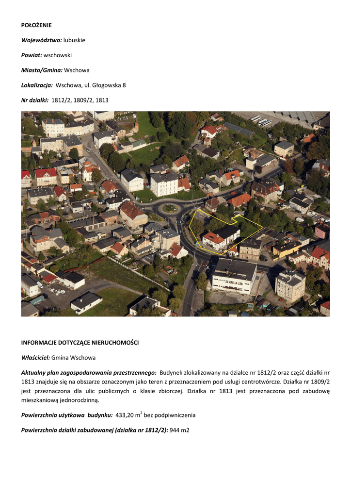 POŁOŻENIE Województwo: lubuskie Powiat: wschowski Miasto/Gmina: Wschowa Lokalizacja: Wschowa, ul. Głogowska 8 Nr działki: 1812/2, 1809/2, 1813 INFORMACJE DOTYCZĄCE NIERUCHOMOŚCI Właściciel: Gmina Wschowa Aktualny plan zagospodarowania przestrzennego: Budynek zlokalizowany na działce nr 1812/2 oraz część działki nr 1813 znajduje się na obszarze oznaczonym jako teren z przeznaczeniem pod usługi centrotwórcze. Działka nr 1809/2 jest przeznaczona dla ulic publicznych o klasie zbiorczej. Działka nr 1813 jest przeznaczona pod zabudowę mieszkaniową jednorodzinną. Powierzchnia użytkowa budynku: 433,20 m2 bez podpiwniczenia Powierzchnia działki zabudowanej (działka nr 1812/2): 944 m2 Powierzchnia całej nieruchomości: 1990 m2 ZDJĘCIA OBIEKTU: CHARAKTERYSTYKA BUDYNKU Stan obecny: Budynek po byłym kinie Hel, składa się na parterze z sali widowiskowej na 200 osób oraz z części związanej z obsługą klientów kina. Na I piętrze pomieszczenia biurowe z zapleczem technicznym kina. Obecnie pustostan. Pozostałe nieruchomości gruntowe – nieużytek. Stan techniczny i charakterystyka budynku: Budynek dwukondygnacyjny z użytkowym poddaszem, wykonany w technologii tradycyjnej, częściowo podpiwniczony. Budynek nie użytkowany od kilku lat. Fundamenty: ławy i stopy. Ściany fundamentowe murowane. Ściany nadzienia murowane z cegieł ceramicznych pełnych. Stropy nad salą widowiskową drewniane, ocieplone. W części technicznej drewniane z podbitką. Ścianki działowe; cegła ceramiczna pełna i dziurawka. Dach nad salą widowiskową z dźwigarów drewnianych, pokrycie z desek i papy bitumicznej. Dach nad częścią techniczną czterospadowy z więźbą dachową drewnianą kryty dachówkami ceramicznymi. Drzwi główne wejściowe metalowo-szklane. Drzwi boczne wejściowe drewniane. Drzwi wewnętrzne drewniane. Stolarka okienna drewniana skrzynkowa, stara i zużyta. Na Sali widowiskowej posadzki cementowe, na niej wykładzina PCV. W części technicznej na parterze lastriko. Tynki zwykłe wykonane ręczne. Ogrzewanie CO gazowe miejscowe. Instalacja elektryczna: rozdzielnia prądu, instalacja oświetleniowa, instalacja siły. Instalacje sanitarne: Instalacja wodno – kanalizacyjna. Instalacja gazowa. DODATKOWE INFORMACJE: Osoby przygotowujące ofertę: Imię i nazwisko: Katarzyna Lorych Funkcja: inspektor ds. nieruchomości Kontakt: 655408619, [email protected] Imię i nazwisko: Agnieszka Kokocińska Funkcja: inspektor Kontakt: 655408620, [email protected] Osoby do kontaktu: Imię i nazwisko: Marzanna Gałecka Funkcja: Naczelnik Wydziału Gospodarki Lokalowej i Nieruchomości Kontakt: 655408647, [email protected] STRONA WWW EWENTUALNEGO PRZETARGU www.nieruchomosci.wschowa.pl