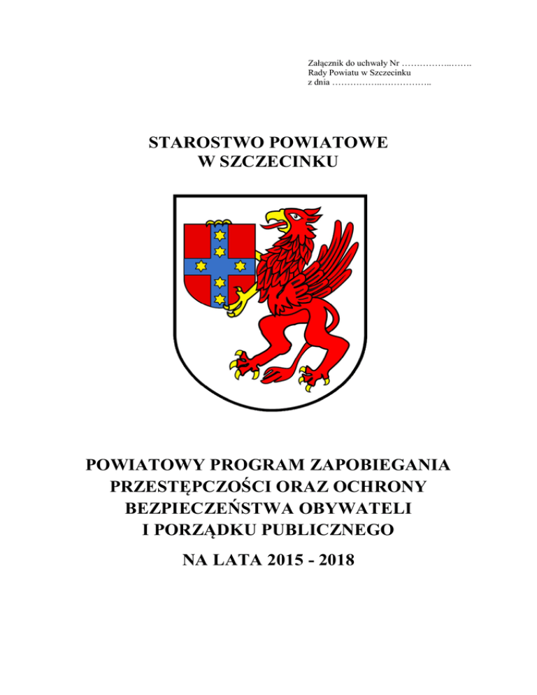 Załącznik do uchwały Nr ……………..……. Rady Powiatu w Szczecinku z dnia ……………..…………….. STAROSTWO POWIATOWE W SZCZECINKU POWIATOWY PROGRAM ZAPOBIEGANIA PRZESTĘPCZOŚCI ORAZ OCHRONY BEZPIECZEŃSTWA OBYWATELI I PORZĄDKU PUBLICZNEGO NA LATA 2015 - 2018 SPIS TREŚCI 1. 2. 3. 4. 5. 6. WSTĘP CELE I ZAŁOŻENIA PROGRAMU PODMIOTY UCZESTNICZĄCE W REALIZACJI PROGRAMU ZAGROŻENIA MOGĄCE WYSTĄPIĆ NA TERENIE POWIATU ZAKOŃCZENIE HARMONOGRAM REALIZACJI PROGRAMU NA LATA 2015 - 2018 2 1. WSTĘP Zgodnie ustawą o samorządzie powiatowym z dnia 5 czerwca 1998 r. art. 12 pkt. 9b do wyłącznej właściwości rady powiatu należy uchwalenie powiatowego programu zapobiegania przestępczości oraz ochrony bezpieczeństwa obywateli i porządku publicznego. Ochrona bezpieczeństwa i porządku publicznego należy do zasadniczych zadań państwa, gdyż poczucie bezpieczeństwa – lub jego brak – przesądza o jakości życia i rozwoju społeczeństwa. Policja i inne formacje ochrony bezpieczeństwa i porządku publicznego nie powinny być zastępowane przez obywateli, czy organizacje społeczne. Dlatego wymaga to od Policji zwiększenia skuteczności, jak również zapewnienie mechanizmów stałej współpracy Policji, administracji samorządowej, organizacji społecznych, ludzi aktywnych. Program ma przyczynić się do ograniczenia skali zjawisk i zachowań, które budzą powszechny sprzeciw i poczucie zagrożenia. Istotą Programu jest koordynacja wysiłku społecznego dla realizacji celu nadrzędnego, jakim jest poprawa bezpieczeństwa obywateli na terenie powiatu szczecineckiego. Program opisuje poszczególne działania w celu ograniczenia zjawisk i zachowań, które budzą powszechny sprzeciw i poczucie zagrożenia. Jest to, zatem program pracy zespołowej na rzecz polepszenia jakości życia pod względem bezpieczeństwa i zwiększenia dostępu do dobra publicznego, jakim jest bezpieczeństwo. Funkcjonowanie każdej społeczności uwarunkowane jest wieloma czynnikami mającymi wpływ na jej rozwój. Nie można mówić o stabilnym funkcjonowaniu społeczeństwa bez odpowiednio zagwarantowanego poziomu bezpieczeństwa socjalnego, zdrowotnego, pożarowego, czy wreszcie bezpieczeństwa i porządku publicznego. W oczach pojedynczego obywatela bezpieczeństwo własne, jego rodziny i najbliższego otoczenia staje się rzeczą najważniejszą. W tych warunkach działania zmierzające do poprawy stanu bezpieczeństwa publicznego widziane w dłuższej perspektywie czasu muszą mieć charakter kompleksowy, łączący działalność różnych instytucji, organizacji, stowarzyszeń i innych podmiotów w skoordynowane przedsięwzięcia profilaktyczne. Takie działania przyczynią się do poprawy stopnia społecznego poczucia bezpieczeństwa. Władze administracyjno-samorządowe, organizacje i instytucje, Policja i inni uczestnicy Programu staną się, zatem partnerami w trosce o dobro wspólne, jakim jest szeroko rozumiane poczucie społecznego bezpieczeństwa. 2. CELE I ZAŁOŻENIA PROGRAMU Program ma za zadanie poszukiwanie i wdrażanie skutecznych form i metod profilaktycznych w kierunku zapobiegania przestępczości, wzrostu poczucia bezpieczeństwa mieszkańców powiatu szczecineckiego, przełamania bariery strachu, a w konsekwencji stworzeniu bezpiecznych miast, gmin i wsi na terenie powiatu. Głównym celami Programu są m.in: a) ograniczenie przestępczości, b) ochrona dzieci i młodzieży, 3 c) ograniczanie zjawisk chuligaństwa i wandalizmu, d) przeciwdziałanie patologiom społecznym tj. alkoholizmowi, narkomanii i przemocy domowej, e) poprawa bezpieczeństwa w ruchu drogowym, f) otoczenie opieką osób, rodzin i środowisk, które padły ofiarą przemocy, bądź znalazły się w sytuacji kryzysowej, g) wspólne i skoordynowane działanie Policji, inspekcji, straży, szkół i placówek oświatowych oraz administracji powiatowej z innymi organizacjami i samorządami z terenu powiatu w zakresie zapewnienia bezpieczeństwa, h) współdziałanie ze środkami masowego przekazu na rzecz kształtowania rzetelnej polityki informacyjnej w mediach promującej kwestie bezpieczeństwa i porządku publicznego. W celu właściwej i skutecznej realizacji Programu konieczna jest zmiana postawy społecznej i zdecydowane reagowanie na wszelkie przejawy zła, kształtowanie poszanowania dla istniejących norm prawnych dzięki prowadzeniu właściwej polityki informacyjnej, edukacyjnej i represyjnej. Główne założenia programu: Założeniem Nr 1 Programu jest to, iż realizacja przyjętych w programie celów powinna przynieść korzyści mieszkańcom powiatu szczecineckiego poprzez ograniczenie przestępczości, zjawisk patologicznych oraz obniżenie związanych z tym szkód społecznych. Założeniem Nr 2 Programu jest to, iż realizacja Programu umożliwi mieszkańcom powiatu aktywniejsze uczestnictwo w życiu społecznym w tym reagowanie na zło i działanie w kierunku poprawy bezpieczeństwa nas wszystkich. Założeniem Nr 3 Programu jest to, iż mieszkańcy powiatu szczecineckiego podejmą współpracę w ramach realizacji Programu, a podstawowym warunkiem jego powodzenia w pierwszym rzędzie będzie skuteczność działań np.: szybka reakcja na wezwanie, gotowość niesienia pomocy i konsekwencja w wykonywaniu postawionych w programie zadań. Założeniem Nr 4 Programu jest to, iż główne działania skierowane zostaną na realizację zadań z zakresu problematyki: prewencji wychowawczej, bezpieczeństwa społecznego, przeciwdziałania przestępczości, komunikacyjnej, porządku publicznego oraz ochrony środowiska. 3. PODMIOTY UCZESTNICZĄCE I WSPIERAJĄCE REALIZACJĘ PROGRAMU. Zgodnie z zapisem ustawowym, starosta sprawując zwierzchnictwo w stosunku do powiatowych służb, inspekcji i straży uzgadnia ich współdziałanie m.in. w zakresie zapobiegania zagrożeniom życia, zdrowia lub mienia oraz zagrożenia środowiska, utrzymania bezpieczeństwa i porządku publicznego, o