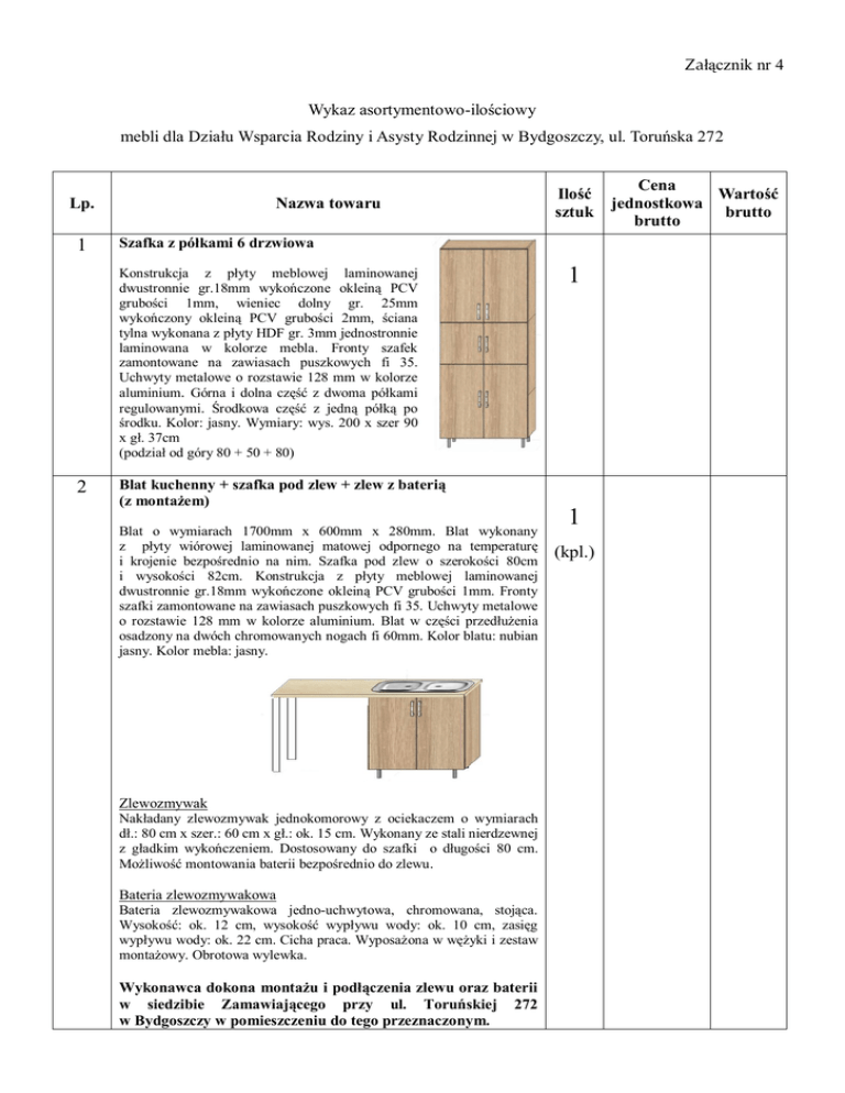 Załącznik nr 4 Wykaz asortymentowo-ilościowy mebli dla Działu Wsparcia Rodziny i Asysty Rodzinnej w Bydgoszczy, ul. Toruńska 272 Lp. 1 Nazwa towaru Szafka z półkami 6 drzwiowa Konstrukcja z płyty meblowej laminowanej dwustronnie gr.18mm wykończone okleiną PCV grubości 1mm, wieniec dolny gr. 25mm wykończony okleiną PCV grubości 2mm, ściana tylna wykonana z płyty HDF gr. 3mm jednostronnie laminowana w kolorze mebla. Fronty szafek zamontowane na zawiasach puszkowych fi 35. Uchwyty metalowe o rozstawie 128 mm w kolorze aluminium. Górna i dolna część z dwoma półkami regulowanymi. Środkowa część z jedną półką po środku. Kolor: jasny. Wymiary: wys. 200 x szer 90 x gł. 37cm (podział od góry 80 + 50 + 80) 2 Ilość sztuk Blat kuchenny + szafka pod zlew + zlew z baterią (z montażem) Blat o wymiarach 1700mm x 600mm x 280mm. Blat wykonany z płyty wiórowej laminowanej matowej odpornego na temperaturę i krojenie bezpośrednio na nim. Szafka pod zlew o szerokości 80cm i wysokości 82cm. Konstrukcja z płyty meblowej laminowanej dwustronnie gr.18mm wykończone okleiną PCV grubości 1mm. Fronty szafki zamontowane na zawiasach puszkowych fi 35. Uchwyty metalowe o rozstawie 128 mm w kolorze aluminium. Blat w części przedłużenia osadzony na dwóch chromowanych nogach fi 60mm. Kolor blatu: nubian jasny. Kolor mebla: jasny. Zlewozmywak Nakładany zlewozmywak jednokomorowy z ociekaczem o wymiarach dł.: 80 cm x szer.: 60 cm x gł.: ok. 15 cm. Wykonany ze stali nierdzewnej z gładkim wykończeniem. Dostosowany do szafki o długości 80 cm. Możliwość montowania baterii bezpośrednio do zlewu . Bateria zlewozmywakowa Bateria zlewozmywakowa jedno-uchwytowa, chromowana, stojąca. Wysokość: ok. 12 cm, wysokość wypływu wody: ok. 10 cm, zasięg wypływu wody: ok. 22 cm. Cicha praca. Wyposażona w wężyki i zestaw montażowy. Obrotowa wylewka. Wykonawca dokona montażu i podłączenia zlewu oraz baterii w siedzibie Zamawiającego przy ul. Toruńskiej 272 w Bydgoszczy w pomieszczeniu do tego przeznaczonym. 1 1 (kpl.) Cena Wartość jednostkowa brutto brutto 3 Stół kuchenny Blat z płyty meblowej laminowanej dwustronnie gr. 25mm wykończony okleiną PCV grubości 2mm o wymiarach 80 x 80 cm, wysokość: 76 cm. Stelaż chromowany. Kolor: jasny. 4 1 Krzesło kuchenne Chromowany stelaż, siedzisko tapicerowane ze skayu. Wymiary: wysokość całkowita 86 cm, średnica siedziska 41 cm, wysokość do siedziska 44 cm. Kolor do uzgodnienia. 2 RAZEM: Zamawiający przed podpisaniem umowy dokona ostatecznego wyboru koloru mebli i obicia na podstawie przedstawionych przez Wykonawcę próbek kolorów. Meble należy wykonać i skompletować wg przedstawionych rysunków, opisów i wzorów. Wewnątrz mebli półki osadzone na podpórkach metalowych z regulacją ustawienia wysokości. Wykonawca dokona montażu i podłączenia zlewu oraz baterii w siedzibie Zamawiającego przy ul. Toruńskiej 272 w Bydgoszczy w pomieszczeniu do tego przeznaczonym. ………………………………………… (podpis osoby upoważnionej)
