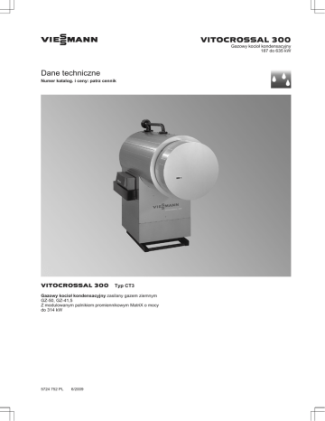VIESMANN VITOCROSSAL 300 Gazowy kocioł kondensacyjny 187 do 635 kW Dane techniczne Numer katalog. i ceny: patrz cennik VITOCROSSAL 300 Typ CT3 Gazowy kocioł kondensacyjny zasilany gazem ziemnym GZ-50, GZ-41,5 Z modulowanym palnikiem promiennikowym MatriX o mocy do 314 kW 5724 752 PL 6/2009 Zalety w skrócie ■ Z palnikiem promiennikowym MatriX (do 314 kW) do szczególnie ekonomicznej i ekologicznej eksploatacji o zakresie modulacji od 30% do 100%. ■ W wersji Unit (od 400 do 653 kW) z gazowym palnikiem wentylatorowym ELCO lub Weishaupt. ■ Dwa króćce wody powrotnej zapewniają optymalne pod względem kondensacji połączenie hydrauliczne. A Dwa ułożone jeden nad drugim króćce wody powrotnej B Powierzchnie grzewcze Inox-Crossal ze szlachetnej stali nierdzewnej C Chłodzona wodą komora spalania ze stali nierdzewnej D Wysoce skuteczna izolacja cieplna E Modulowany palnik promiennikowy MatriX 5724 752 PL ■ Sprawność znormalizowana: do 98% (Hs)/109% (Hi). ■ Duża trwałość i wysokie bezpieczeństwo eksploatacji dzięki odpornym na korozję powierzchniom grzewczym Inox-Crossal wykonanym ze stali nierdzewnej. ■ Bardzo skuteczne przekazywanie ciepła i wysoki stopień kondensacji dzięki powierzchni grzewczej Inox-Crossal. ■ Efekt samooczyszczania dzięki gładkim powierzchniom ze stali nierdzewnej. ■ Spalanie z niską emisją zanieczyszczeń dzięki niskiemu obciążeniu i przelotowej formie komory spalania. 2 VIESMANN VITOCROSSAL 300 Dane techniczne kotła grzewczego Dane techniczne Znamionowa moc cieplna TV/TR = 40/30°C TV/TR = 80/60°C Znamionowe obciążenie cieplne Nr ident. produktu Dop. temperatura robocza Dop. temperatura na zasilaniu (= temp. progowa) Dop. ciśnienie robocze Opór przepływu spalin Wymiary korpusu kotła Długość c +d (bez drzwi kotła) Szerokość s Szerokość v Wysokość n (z króćcami) Wymiary całkowite Długość całkowita b Długość całkowita a (z palnikiem MatriX) Szerokość całkowita q Wysokość całkowita p Szerokość r (z izolacją cieplną) Szerokość w (z izolacją cieplną) Fundament Długość Szerokość Wysokość Masa – Korpus kotła – Zdejmowana komora spalania bez drzwi kotła Masa całkowita Kocioł grzewczy z izolacją cieplną i regulatorem obiegu kotła Pojemność wodna kotła Przyłącza kotła grzewczego Zasilanie z kotła Powrót do kotła 1*1 Powrót do kotła 2*1 Przyłącze zabezpieczające (zawór bezpieczeństwa) Spust Odpływ kondensatu Parametry spalin*2 Temperatura (przy temp. wody na powrocie wynoszącej 30°C) – przy znamionowej mocy cieplnej – przy obciążeniu częściowym Temperatura (przy temp. wody na powrocie wynoszącej 60°C) Masowe natężenie przepływu (przy zast. gazu ziemnego) – przy znamionowej mocy cieplnej – przy obciążeniu częściowym Dyspozycyjne ciśnienie tłoczenia Przy króćcu spalin Przyłącze spalin Sprawność znormalizowana przy temp. systemu grzewczego 40/30°C przy temp. systemu grzewczego 75/60°C Strata dyżurna qB,70 5724 752 PL *1 *2 kW kW kW 187 170 177 248 225 234,5 508 460 479 635 575 599 °C °C 100 110 100 110 100 110 100 110 bar Pa mbar 4 100 1,0 4 140 1,4 4 160 1,6 5,5 200 2,0 5,5 220 2,2 5,5 270 2,7 mm mm mm mm 1566 684 682 1744 1644 684 682 1794 1723 684 682 1794 1800 800 796 2013 1878 800 796 2013 2034 800 796 2013 mm mm mm mm mm mm 1636 1840 1012 1959 876 800 1714 1915 1012 2009 876 800 1795 1995 1012 2032 876 800 1871 — 1128 2290 992 916 1949 — 1128 2290 992 916 2105 — 1128 2290 992 916 mm mm mm 1000 800 100 1100 800 100 1200 800 100 1250 900 100 1300 900 100 1500 900 100 kg kg 459 90 505 90 545 90 758 115 798 115 905 115 kg 557 613 660 890 936 1053 l 270 296 330 490 533 570 PN 6 DN PN 6 DN PN 6 DN PN 6 DN 65 65 50 32 65 65 50 32 80 80 50 50 100 100 80 50 100 100 80 50 100 100 80 50 R R 1 ½ 1 ½ 1 ½ 1 ½ 1 ½ 1 ½ °C °C °C 45 40 75 45 40 75 45 40 75 45 40 75 45 40 75 45 40 75 269 81 70 0,7 200 357 107 70 0,7 200 452 136 70 0,7 200 586 176 80 0,8 250 727 218 80 0,8 250 909 272 80 0,8 250 do 98 (Hs)/109 (Hi) do 95 (Hs)/106 (Hi) 0,30 0,30 0,28 0,25 kg/h kg/h Pa mbar 7 mm % % % 0,40 0,30 314 408 285 370 297 385,5 CE-0085 AQ 0257 100 100 110 110 W przypadku przyłączania 2 obiegów grzewczych należy do powrotu kotła 1 przyłączyć obieg grzewczy o najniższym poziomie temperatury. Wartości obliczeniowe do projektowania instalacji spalinowej wg normy EN 13384 w odniesieniu do 10% CO2 przy zastosowaniu gazu ziemnego. Temperatury spalin jako zmierzone wartości brutto przy temperaturze powietrza do spalania wynoszącej 20°C. Dane obciążenia częściowego odnoszą się do mocy wynoszącej 30% znamionowej mocy cieplnej. Przy obciążeniu częściowym odbiegającym od podanych wartości (zależnie od sposobu eksploatacji palnika) należy odpowiednio obliczyć przepływ masowy spalin. VITOCROSSAL 300 VIESMANN 3 Dane techniczne kotła grzewczego (ciąg dalszy) Wskazówka Dyspozycyjne ciśnienie tłoczenia na króćcu spalin można osiągnąć przy zastosowaniu objętych programem sprzedaży palników promiennikowych MatriX (do 314 kW), gazowych palników wentylatorowych (produkt firmy Weishaupt i Elco) jak i wielu innych gazowych palników wentylatorowych. Jeżeli dysponowane ciśnienie tłoczenia odbiega od podanych wartości, należy skonsultować się z dostawcą palnika. Przy zastosowaniu kotła Vitocrossal 300 w instalacjach z kominem niewrażliwym na wilgoć ciśnienie tłoczenia może wynosić maks. 0 Pa. e DB WB a b c q d r KV RG KTS x SCH SA p s m n o KTÜ ≥ 140A f KR2 KR1 E AGA g i k l R KOA A AGA DB E KOA KR 1 KR 2 KTS W celu zapewnienia prawidłowego funkcjonowania należy przestrzegać wymaganej minimalnej długości rury palnika. Wylot spalin Mufa R ½ do ogranicznika ciśnienia Spust Odpływ kondensatu Powrót do kotła 1 Powrót do kotła 2 Czujnik temperatury wody w kotle Tabela wymiarów Znamionowa moc cieplna a b c d e f g h (długość szyn wsporczych) i k l m n o p q r s t u v w x 4 160 VIESMANN kW mm mm