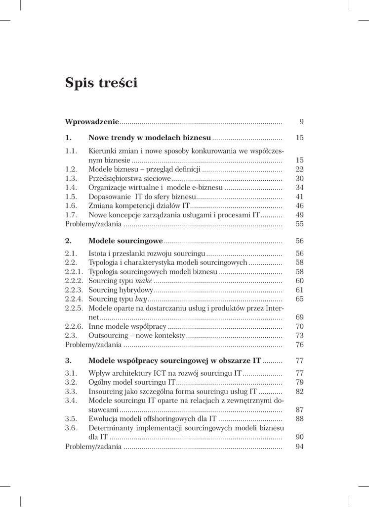 Spis treści Wprowadzenie.................................................................................. 9 1. Nowe trendy w modelach biznesu.................................... 15 Kierunki zmian i nowe sposoby konkurowania we współczesnym biznesie............................................................................ 1.2. Modele biznesu – przegląd definicji......................................... 1.3. Przedsiębiorstwa sieciowe........................................................ 1.4. Organizacje wirtualne i modele e-biznesu.............................. 1.5. Dopasowanie IT do sfery biznesu........................................... 1.6. Zmiana kompetencji działów IT............................................... 1.7. Nowe koncepcje zarządzania usługami i procesami IT............ Problemy/zadania................................................................................ 15 22 30 34 41 46 49 55 2. Modele sourcingowe............................................................ 56 Istota i przesłanki rozwoju sourcingu....................................... Typologia i charakterystyka modeli sourcingowych.................. Typologia sourcingowych modeli biznesu................................. Sourcing typu make................................................................. Sourcing hybrydowy................................................................. Sourcing typu buy.................................................................... Modele oparte na dostarczaniu usług i produktów przez Internet............................................................................................ 2.2.6. Inne modele współpracy.......................................................... 2.3. Outsourcing – nowe konteksty................................................. Problemy/zadania................................................................................ 56 58 58 60 61 65 3. Modele współpracy sourcingowej w obszarze IT........... 77 Wpływ architektury ICT na rozwój sourcingu IT..................... Ogólny model sourcingu IT...................................................... Insourcing jako szczególna forma sourcingu usług IT............. Modele sourcingu IT oparte na relacjach z zewnętrznymi dostawcami.................................................................................. 3.5. Ewolucja modeli offshoringowych dla IT................................. 3.6. Determinanty implementacji sourcingowych modeli biznesu dla IT....................................................................................... Problemy/zadania................................................................................ 77 79 82 1.1. 2.1. 2.2. 2.2.1. 2.2.2. 2.2.3. 2.2.4. 2.2.5. 3.1. 3.2. 3.3. 3.4. 69 70 73 76 87 88 90 94 6 Spis treści 4. Wpływ rozwoju technologii na powstanie koncepcji cloud computingu................................................................ 95 4.1. Geneza koncepcji chmury........................................................ 95 4.2. Rodzaje chmur obliczeniowych................................................ 98 4.3. Zasady doboru dostawcy cloud computingu............................. 102 Problemy/zadania................................................................................ 103 5. Podejmowanie decyzji sourcingowych............................. 104 5.1. Uwarunkowania społeczne i skutki działań sourcingowych w obszarze IT........................................................................... 5.2. Analiza potencjału klienta i dostawcy usług IT........................ 5.3. Analiza kosztów sourcingu IT.................................................. 5.4. Narzędzia wspierające decyzje sourcingowe w obszarze IT..... Problemy/zadania................................................................................ 6. Bezpieczeństwo informacji i wiedzy w sourcingu IT..... 126 6.1. Ryzyko przedsięwzięć sieciowych............................................. 6.2. Zagrożenia związane z wirtualizacją i cloud computingiem..... 6.3. Nowe wyzwania dla zarządzania bezpieczeństwem IT............. 6.4. Zarys problematyki bezpieczeństwa informacyjnego................ 6.5. Zasady bezpieczeństwa w kontekście sourcingu IT................. Problemy/zadania................................................................................ 7. 104 107 112 116 125 126 131 134 138 140 148 Zarządzanie relacją sourcingową w obszarze IT........... 150 7.1. 7.2. Etapy procesu sourcingu IT..................................................... Problemy zarządzania przedsięwzięciami sourcingowymi w obszarze IT........................................................................... 7.3. Rola zaufania w relacjach sourcingowych................................ 7.4. Prawne aspekty współpracy z zewnętrznymi dostawcami........ 7.5. Rola umów SLA w zarządzaniu usługami IT........................... 7.6. Czynniki sukcesu współpracy sourcingowej............................. Problemy/zadania................................................................................ 150 152 155 157 164 167 169 8. Innowacyjna kooperacja oparta na wiedzy..................... 170 8.1. 8.2. 8.3. 8.4. Istota innowacyjnej kooperacji................................................. Zarządzanie kooperacją dla innowacji...................................... Zarządzanie wiedzą w sourcingu IT......................................... Dojrzałość sourcingowa organizacji.......................................... 170 176 181 187 7 Spis treści 8.4.1. Model dojrzałości outsourcingowej Solli-Saethera i Gottschalka. 8.4.2. Model dojrzałości outsourcingu IT Adelakuna......................... 8.4.3. Autorski model dojrzałości sourcingowej.................................. 8.4.4. Możliwe kierunki badań w zakresie dojrzałości sourcingowej.... 8.5. Sourcing IT w poszukiwaniu przewagi konkurencyjnej........... Problemy/zadania............................