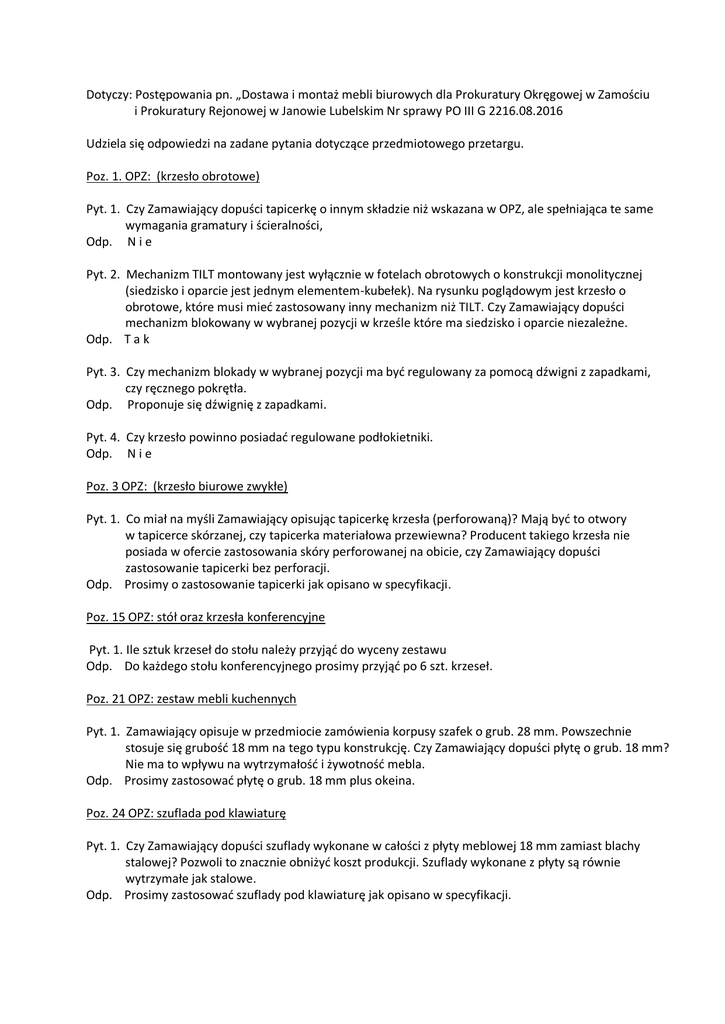 Dotyczy: Postępowania pn. „Dostawa i montaż mebli biurowych dla Prokuratury Okręgowej w Zamościu i Prokuratury Rejonowej w Janowie Lubelskim Nr sprawy PO III G 2216.08.2016 Udziela się odpowiedzi na zadane pytania dotyczące przedmiotowego przetargu. Poz. 1. OPZ: (krzesło obrotowe) Pyt. 1. Czy Zamawiający dopuści tapicerkę o innym składzie niż wskazana w OPZ, ale spełniająca te same wymagania gramatury i ścieralności, Odp. N i e Pyt. 2. Mechanizm TILT montowany jest wyłącznie w fotelach obrotowych o konstrukcji monolitycznej (siedzisko i oparcie jest jednym elementem-kubełek). Na rysunku poglądowym jest krzesło o obrotowe, które musi mieć zastosowany inny mechanizm niż TILT. Czy Zamawiający dopuści mechanizm blokowany w wybranej pozycji w krześle które ma siedzisko i oparcie niezależne. Odp. T a k Pyt. 3. Czy mechanizm blokady w wybranej pozycji ma być regulowany za pomocą dźwigni z zapadkami, czy ręcznego pokrętła. Odp. Proponuje się dźwignię z zapadkami. Pyt. 4. Czy krzesło powinno posiadać regulowane podłokietniki. Odp. N i e Poz. 3 OPZ: (krzesło biurowe zwykłe) Pyt. 1. Co miał na myśli Zamawiający opisując tapicerkę krzesła (perforowaną)? Mają być to otwory w tapicerce skórzanej, czy tapicerka materiałowa przewiewna? Producent takiego krzesła nie posiada w ofercie zastosowania skóry perforowanej na obicie, czy Zamawiający dopuści zastosowanie tapicerki bez perforacji. Odp. Prosimy o zastosowanie tapicerki jak opisano w specyfikacji. Poz. 15 OPZ: stół oraz krzesła konferencyjne Pyt. 1. Ile sztuk krzeseł do stołu należy przyjąć do wyceny zestawu Odp. Do każdego stołu konferencyjnego prosimy przyjąć po 6 szt. krzeseł. Poz. 21 OPZ: zestaw mebli kuchennych Pyt. 1. Zamawiający opisuje w przedmiocie zamówienia korpusy szafek o grub. 28 mm. Powszechnie stosuje się grubość 18 mm na tego typu konstrukcję. Czy Zamawiający dopuści płytę o grub. 18 mm? Nie ma to wpływu na wytrzymałość i żywotność mebla. Odp. Prosimy zastosować płytę o grub. 18 mm plus okeina. Poz. 24 OPZ: szuflada pod klawiaturę Pyt. 1. Czy Zamawiający dopuści szuflady wykonane w całości z płyty meblowej 18 mm zamiast blachy stalowej? Pozwoli to znacznie obniżyć koszt produkcji. Szuflady wykonane z płyty są równie wytrzymałe jak stalowe. Odp. Prosimy zastosować szuflady pod klawiaturę jak opisano w specyfikacji. Dotyczy ogólnych wymagań technicznych wykonania mebli. Pyt. 1. Zamawiający opisuje zawiasy i okucia systemu „push to open” oraz w poz. 23 OPZ rodzaj uchwytów jakie maja być zastosowane w meblach. Sposób otwierania typu „push” oraz tradycyjny nie mogą zostać użyte jednocześnie. W jednym przypadku celem otworzenia należy nacisnąć front, w drugim przypadku pociągnąć za uchwyt. Proszę o doprecyzowanie. Odp. Uchwyty należy zastosować do szaf, podstawek i nastawek.