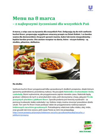 Menu na 8 marca – z najlepszymi życzeniami dla wszystkich Pań 8 marca, a więc czas na życzenia dla wszystkich Pań. Dołączają się do nich szefowie kuchni Knorr, proponując wyjątkowo smaczny przepis na Dzień Kobiet. I co bardzo ważne dla domowników chcących sprawić mamie, babci lub żonie niespodziankę – będzie bardzo prosto. Oto zestaw receptur na dania, które - niczym kobiety - są słodkie, pikantne, delikatne. Na słodko Szefowie kuchni Knorr przygotowali kilka sprawdzonych słodkich przepisów, dzięki którym sprawimy podniebieniu prawdziwą rozkosz. Na początek Naleśniki z truskawkami i białą czekoladą. Brzmi wykwintnie, ale przygotowanie zajmie niewiele czasu. Naleśniki będą grubsze i zbliżone do tych w amerykańskim stylu, jeśli skorzystamy z bazy, jaką jest Fix do puszystych placków z jabłkami Knorr. Sposób podania jest kwestią wyobraźni - za pomocą truskawek, białej czekolady i np. listków mięty można stworzyć prawdziwe dzieło sztuki. Ten sam Fix Knorr może posłużyć także do przygotowania nadzwyczajnych Imbirowych racuchów gruszkowych. Potrzebujemy właściwie tylko mleko, olej, imbir, oraz gruszki lub inne owoce, jeśli nasze Panie za nimi nie przepadają: http://www.przepisy.pl/przepis/imbirowe-racuchy-gruszkowe#szukaj/racuchy z jabłkami/przepisy Jeśli Pani, dla której przygotowujemy świąteczny posiłek, uwielbia słodkie sałatki, podarujmy jej prezent w postaci Sałatki arbuzowej z serem feta. Oprócz tytułowych arbuza i sera feta kompozycja zawiera także orzeszki pistacjowe i listki mięty - pyszności! Pikantnie Aby nie było za słodko, wprowadźmy w tym dniu do kuchni odrobinę pikanterii. Kuchnia na ostro ma liczne wielbicielki. Kucharze Knorr proponują prawdziwe rarytasy. Pierwszym z nich jest Makaron z pikantnym sosem „arrabbiata”. Rządzą tu papryczka chili, czosnek oraz czarne oliwki. Dokładny przepis poniżej: http://www.przepisy.pl/przepis/makaron-z-pikantnym-sosemarrabbiata#szukaj/pikantny/przepisy Świetnie będą też smakowały Kotleciki z indyka z pikantnym sosem czekoladowym, które zrobią wielkie wrażenie kompozycją smaków: mięsa, suszonej śliwki oraz gorzkiej czekolady. Na przekąskę warto zaserwować Pikantne wafle z ziołowym mascarpone. Ser mascarpone zmieszany z aromatycznymi przyprawami i ziołami, pomidorkami cherry oraz wędzonym boczkiem - palce lizać! Delikatnie Kobieta to także delikatność i lekkość. Dlatego kucharze Knorr proponują przepisy pozwalające Paniom odpocząć od potraw mięsnych, które przygotowują regularnie dla swoich rodzin. 8 marca podajmy więc pysznie skomponowane dania warzywne. Może to być Sałatka na ciepło z brokułami i serem feta, która pachnie czosnkiem i oregano, lub Sałatka kolorowa na sposób francuski, która nie tylko świetnie smakuje, ale na dodatek pięknie wygląda. http://www.przepisy.pl/przepis/salatka-kolorowa-na-sposobfrancuski#szukaj/francuski/przepisy Ulubione warzywa możemy też zapiec w tarcie. Szefowie kuchni Knorr polecają np. Włoską tartę z pomidorami i mozzarellą. Gotowa pachnąca tarta przyozdobiona bazylią przeniesie nas w gorące włoskie klimaty. Świetnym pomysłem może okazać się też Francuska zupa pomidorowa, której sekretem są pomidory pelatti oraz grzanki zapieczone z serem żółtym. http://www.przepisy.pl/przepis/wloska-tarta-z-pomidorami-imozzarella#szukaj/tarta/przepisy Przepisy na wszystkie dania znajdziemy na portalu www.przepisy.pl. A jeszcze więcej przepisów specjalnie dla Pań znajduje się: • na profilu na portalu Facebook www.facebook.com/przepisypl • na kanale „Przepisy.pl” na You Tube www.youtube.com/user/codzisnaobiad • w aplikacji mobilnej Przepisy.pl dostępnej po zeskanowaniu kodu QR. Kontakt prasowy: Joanna Szałasz specjalista public relations e-mail: [email protected] tel.: +48 536 410 824 Katarzyna Tomczak specjalista public relations e-mail: [email protected] tel.: +48 606 151 818