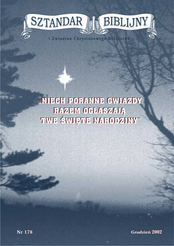 i Zwiastun Chrystusowego Królestwa „NIECH „NIECH PORANNE PORANNE GWIAZDY GWIAZDY RAZEM RAZEM OGŁASZAJĄ OGŁASZAJĄ TWE TWE ŚWIĘTE ŚWIĘTE NARODZINY” NARODZINY” Nr 178 Grudzień 2002 MAŁE MIASTO BETLEJEM „Nadzieje i obawy wszystkich lat, tej nocy spotkały się w Tobie” ARUNKI, w których urodził się nasz Pan były bardzo skromne, a otoczenie miejsca Jego narodzin wiązało się ze wspomnieniem ciężkiej pracy i trudności. Mimo to, tej nocy wydawało się, że Niebiosa promieniowały w ogłaszaniu dobrych wieści o wielkiej radości, która we właściwym czasie obejmie całą ludzką rodzinę. W Czujni pasterze doglądali swoich stad na polach, gdzie Ruta, praprababka Zbawiciela, zbierała pokłosie i gdzie Dawid, pasterski chłopiec, pasł dorosłe owce razem z młodymi. Będąc przejęci i przestraszeni wizytą specjalnego posłańca Najwyższego, poruszeni do głębi swej istoty, gdy niebiański chór aniołów chwalił Boga, ci pokorni mężczyźni byli pierwszymi osobami oglądającymi oblicze Tego, który miał być Zbawicielem świata. Chociaż w pełni wierzyli w to, co usłyszeli i ujrzeli, na pewno byli zdumieni sposobem Jego przyjścia. Obiecany Mesjasz miał być Wyzwolicielem ich narodu. Tron Dawida prawnie się Jemu należał i On miał być uznany jako „Bóg mocny, Ojciec wieczności, Książę pokoju.” Jego celem miało być ustanowienie sprawiedliwego rządu, który będzie trwał przez całą wieczność – „dobre wieści o wielkiej radości” dla wszystkich ludzi (Izaj. 9:6,7; Łuk. 2:10). Jednak przyszedł nierozpoznany ani przyjęty przez ogół, objawiony jedynie kilku uprzywilejowanym. nie było skierowane do otaczającego świata ani nawet do oczekującego Izraela, lecz Syna Króla Niebios odnaleźli pasterze, leżącego w żłobie, czyli miejscu na pokarm dla zwierząt, w oborze skromnego przydrożnego zajazdu. Tutaj pasterze odczuli ulgę, kiedy opowiedzieli Marii i Józefowi o ich niezwykłym przeżyciu, a wizyta tych wiernych mężów z pewnością była błogosławieństwem dla świętej rodziny tamtej nocy – następnym błogosławieństwem, które Maria szczególnie zachowywała w sercu, bez wątpienia po to, aby później opowiedzieć o nim swemu pierworodnemu Synowi. „Niech poranne gwiazdy razem ogłaszają Twe święte narodziny” Biblijny zapis nie wspomina o imieniu anioła, który odwiedził pasterzy tamtej nocy. Jest bardzo prawdopodobne, że to był Gabriel, już zaangażowany w ten doniosły zarys Boskiego Planu, ponieważ to on został wysłany, aby powiadomić Marię o zbliżających się narodzinach „Syna Najwyższego.” „Jak cicho, jak spokojnie cudowny dar jest udzielany!” Anioł wysokiej rangi wśród szczególnych Boskich posłańców, z pewnością charakteryzujący się wspaniałym wyglądem, najpierw pojawił się sam, aby przekazać pasterzom chwalebne wieści o zbawieniu. I nagle – prawdopodobnie na jego rozkaz – przybyło również „mnóstwo wojsk niebieskich,” wznosząc swe głosy w wychwalaniu Boga. To wyglądało, jak gdyby z samego nieba rozlegał się spontaniczny hymn radości i chwały, zawstydzając obojętny i niegodny świat takim Darem od miłującego i miłosiernego Niebiańskiego Ojca. Książęta przychodzą na świat w królewskich pałacach, wśród przejawów bogactwa i ziemskich zaszczytów. Ogłoszenie narodzin Księcia Pokoju Pod koniec ziemskiej służby Jezusa, kiedy rzesze Jego zwolenników naprawdę wołały i radowały się witając Go w Jeruzalem jako swego Króla, „P O D N I E Ś C I E S Z T A N D A R DO N A R O D Ó W „ – Izaj. 62:10 Spis Treści Grudzień 2002 Małe miasto Betlejem – 134 Abakuk 2:2 – dokończenienie – 139 Pytania Biblijne – 142 Cud narodzin Jezusa i jego zdumiewające znaczenie tworzą wspaniałą historię, której opowiadanie nigdy się nie zestarzeje. Ostatni artykuł z naszej całorocznej serii na temat Boskiego Planu Wieków. * Kto ma ducha świętego? * Kazn. Sal. 1:18 Sztandar Biblijny i Zwiastun Chrystusowego Królestwa (PL ISSN 1230-1086) Miesięcznik – Wydawany przez Świecki Ruch Misyjny „Epifania” w Nowym Dworze Mazowieckim. Redaktor: Bernard Hedman Chester Springs, Pa. 19425, USA, Redaktor odpowiedzialny w Polsce: Piotr Woźnicki, ul. Zdobywców Kosmosu 17, 05-100 Nowy Dwór Mazowiecki. Witryna internetowa: http://epifania.pl Cena: pojedynczego numeru – 1,50 zł; prenumerata roczna (12 numerów) – 18 zł. Faryzeusze prosili, aby ich skarcił. A On odpowiedział: „Powiadam wam, jeśliby ci milczeli, wnet kamienie wołać będą” (Łuk. 19:40). To był czas, w którym wielka radość nie mogła być utrzymana w milczeniu. „Gdyż Chrystus narodził się z Marii, ... nasz Pan Emanuel” Pasterze, o których mówimy, rozgłaszali wszędzie wieść o narodzinach Mesjasza. Najwidoczniej byli to mężowie Boży, trwający w oczekiwaniu na obiecane „nasienie” Abrahama, które sprowadzi błogosławieństwa na wszystkie rodziny ziemi. Oni wierzyli w tę Ewangelię. Tak więc radosne wieści rozchodziły się na wszystkie strony i wszyscy, którzy je słyszeli, byli zdumieni dziwnymi wydarzeniami, które miały miejsce tamtej nocy w Betlejem. Podczas tygodni i miesięcy następujących po tym wydarzeniu kilka innych osób zostało uprzywilejowanych szczególnym zrozumieniem. W zgodzie z Zakonem, ósmego dnia dziecię zostało obrzezane i otrzymało imię Jezus. Kiedy 40 dni oczyszczenia Marii dobiegło końca, ona i Józef zabrali Jezusa do świątyni w Jeruzalem, gdzie prorok Symeon wziął niemowlę na ręce i chwalił Boga, mówiąc: „Panie ... oczy moje oglądały zbawienie twoje, któreś zgotował przed obliczem wszystkich ludzi; światłość ku objawieniu poganom, a chwałę ludu Twego izraelskiego” (Łuk. 2:21-32). Anna, podeszła wiekiem prorokini, także dziękowała Bogu za Zbawiciela, a potem świadczyła o Nim wszystkim oczekującym odkupienia w Izraelu (Łuk. 2:38). „Mędrcy” – być