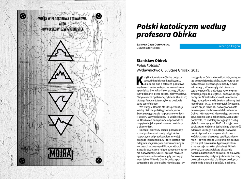 Polski katolicyzm według profesora Obirka Barbara Ober-Domagalska Uniwersytet Łódzki recenzja książki Stanisław Obirek Polak katolik? Wydawnictwo CiS, Stare Groszki 2015 czy.sciec.pl K siążka Stanisława Obirka dotyczy specyfiki polskiego katolicyzmu. Składa się ona z czterech podstawowych rozdziałów, wstępu, wprowadzenia, apendyksu literacko-historycznego, literatury polecanej przez autora, glosy Wacława Chryniewicza opatrzonej tytułem: O inności, dialogu i cnocie tolerancji oraz posłowia Jana Woleńskiego. We wstępie Ronald Mordas prezentuje krótką historię polskiego katolicyzmu. Swoją uwagę skupia na postanowieniach II Soboru Watykańskiego. To właśnie książka Obirka ma nam pomóc odpowiedzieć na pytanie, jak są realizowane postulaty o ekumenizm. Rozdział pierwszy książki poświęcony został problemowi istoty religii. Autor rozpoczyna od przedstawienia swojej drogi do jej poznania, w której istotną rolę odegrała socjalizacja w domu rodzinnym, w czasach wczesnego PRL-u, w których z zasady zwalczano religię, czego sam autor nie doświadczył. Obirek opisuje również epizod okresu dorastania, gdy pod wpływem lektur Witolda Gombrowicza postrzegał siebie jako osobę niewierzącą, by następnie wrócić na łono Kościoła, wstępując do nowicjatu jezuitów. Autor wraca do tych czasów, prezentując epizody z życia zakonnego, które mogły dać pierwsze sygnały specyfiki polskiego katolicyzmu – zmuszającego do uległości, pozbawionego namysłu. Obirek zdecydował (a może za niego zdecydowano?), że stan zakonny jest jego drogą i w 1978 roku przyjął święcenia. Dalsza część rozdziału poświęcona została rozwojowi duchowo-intelektualnemu Obirka, który powoli kierował go w stronę opuszczenia stanu zakonnego. Sam autor podkreśla, że w dalszym ciągu jest osobą głęboko wierzącą; od 2005 roku żyje poza strukturami Kościoła, jednak jego obecność odczuwa każdego dnia. Dzięki doświadczeniu życia duchowego w strukturach Kościoła autor dostrzega upolitycznienie religii i równoczesne ureligijnienie polityki (co nie jest zjawiskiem typowo polskim, a ma raczej charakter globalny). Obirek twierdzi, że coraz większa ekspansja Kościoła katolickiego sprawiła, że dla wielu Polaków rola tej instytucji stała się bardziej dokuczliwa, również dla Niego, co doprowadziło do decyzji o odejściu z zakonu. Recenyja książki „Polak katolik?” Rozdział pierwszy zawiera również informacje na temat dalszych losów profesora, już po opuszczeniu stanu duchownego. Rozdział pierwszy kończy przywołanie definicji religii zaproponowanej przez Clifforda Geertza. Określił on religię jako system kulturowy, charakteryzujący się formułowaniem koncepcji ogólnego ładu istnienia przy pomocy określonych systemów symboli; idzie za tym tworzenie aury faktyczności, tak by towarzyszące ludziom mocne i trwałe motywy oraz nastroje wydawały się niezwykle rzeczywiste. Definicja ta pomaga zaprezentować tezę mówiącą o tym, że od czasów gdy PiS po raz pierwszy doszedł do władzy, debata publiczna nabrała charakteru religijnego. Autor uważa, że stało się to dzięki aktywnemu wsparciu Kościoła katolickiego i nie służy dobrze tej instytucji. Obirek prezentuje dwa symbole polskiego katolicyzmu. Z jednej strony otwarty, zwłaszcza na żydów symbolizowany przez Stanisława Musiała. Drugi – dominujący, będący symbolem zamknięcia i jawnego upolitycznienia, uosabiający sukces masowy, medialny i finansowy, reprezentowany przez zakon redemptorystów, a w szczególności przez ojca Rydzyka. Już w rozdziale pierwszym pojawia się krytyka Jana Pawła II. Zdaniem autora w polskim dyskursie brakuje krytycznej refleksji nad religijnymi, kulturowymi i politycznymi implikacjami Jego pontyfikatu. Autor twierdzi, że to właśnie papiestwo, a w szczególności styl jego uprawiania, sparaliżował polski katolicyzm. Profesor Obirek obserwował tego skutki przez lata, a co ważniejsze sam był częścią struktury Kościoła. Proces niszczenia Kościoła rozpoczął się jeszcze przed wyborem Polaka na tron Piotrowy. To Paweł VI zamroził teologiczną debatę, ogłaszając szereg kontrowersyjnych 181 dokumentów, w tym szczególnie szkodliwą, zdaniem Obirka, encyklikę Humanae Vitae z 1968 r., która stała się symbolem zamknięcia katolicyzmu na współczesność. Jednak to wybór Karola Wojtyły na papieża spowodował, że kler zrobił się dumny, a proces upadku Kościoła przyspieszył. To właśnie do encykliki Humanae Vitae szczególnie chętnie odwoływał się Jan Paweł II. Jego pontyfikat określany jest przez Obirka jako restauracyjny i konserwatywny, czego przejawem było otaczanie się ludźmi Opus Dei, niechęć do jezuitów i traktowanie religii jako narzędzia do celów politycznych. Rozdział drugi to przybliżenie czytelnikom historii chrześcijaństwa, w szczególności tych wydarzeń, które autor uznaje za szkodzące tej religii. By to unaocznić Obirek przybliża schemat zaproponowany przez Karla Rahnera, który podzielił historię chrześcijaństwa na trzy etapy: (1) pierwsze trzy wieki chrześcijaństwa, w których chrześcijaństwo kształtuje swoją tożsamość w opozycji do judaizmu, w dialogu z kulturą greko-romańską; (2) czasy od ogłoszenia edyktu Konstantyna do połowy XX wieku; (3) chrześcijaństwo, w tym Kościół katolicki na Soborze Watykańskim II uznaje istnienie innych religii za fakt pozytywny. W tekście Obirka wybrzmiewa żal, że chrześcijaństwo tak bardzo odczuwało potrzebę zaznaczenia swojej odrębności religijnej i wykazania jej wyższości nad judaizmem zamiast koncentrować się na rzeczywistym nauczaniu Jezusa z Nazaretu. Kolejne wieki Kościół słowami Ojców Kościoła legitymizował wrogi stosunek do żydów i innych wyznań (poza Kościołem nie ma zbawienia). Odwołując się do słów Daniela Boyana Obirek pisze, że: Jeśli jest coś co chrześcijanie wi