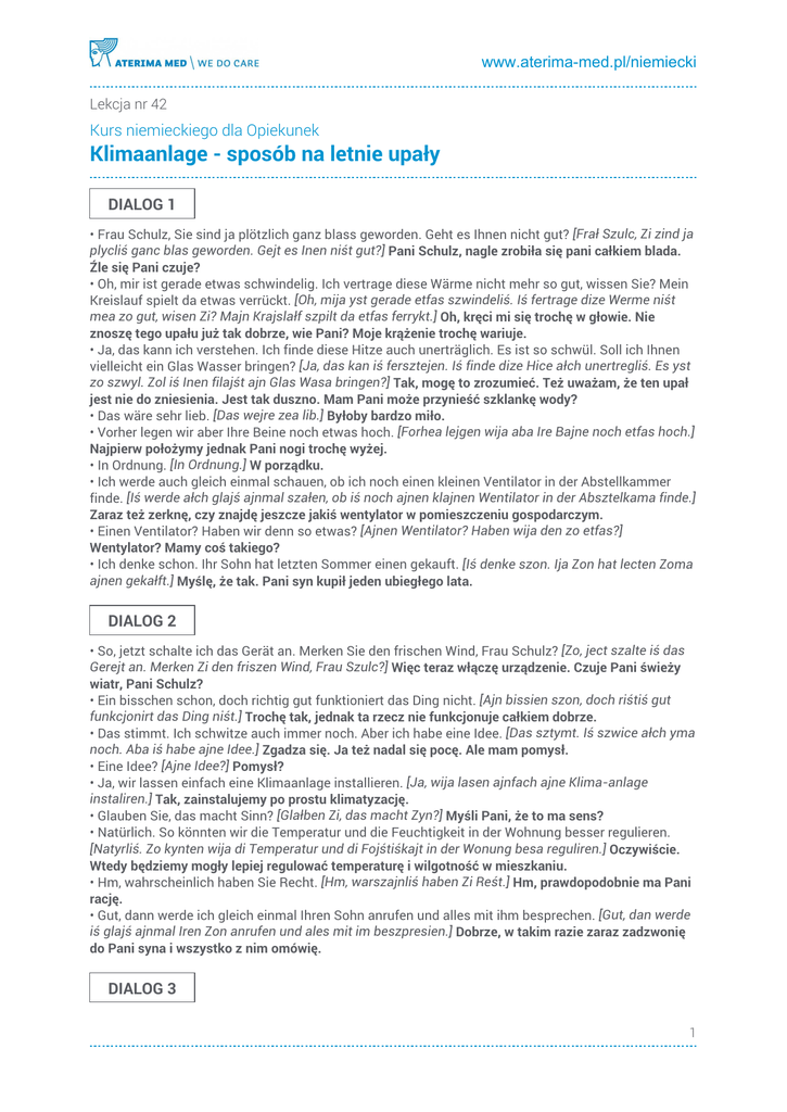 www.aterima-med.pl/niemiecki Lekcja nr 42 Kurs niemieckiego dla Opiekunek Klimaanlage - sposób na letnie upały DIALOG 1 • Frau Schulz, Sie sind ja plötzlich ganz blass geworden. Geht es Ihnen nicht gut? [Frał Szulc, Zi zind ja plycliś ganc blas geworden. Gejt es Inen niśt gut?] Pani Schulz, nagle zrobiła się pani całkiem blada. Źle się Pani czuje? • Oh, mir ist gerade etwas schwindelig. Ich vertrage diese Wärme nicht mehr so gut, wissen Sie? Mein Kreislauf spielt da etwas verrückt. [Oh, mija yst gerade etfas szwindeliś. Iś fertrage dize Werme niśt mea zo gut, wisen Zi? Majn Krajslałf szpilt da etfas ferrykt.] Oh, kręci mi się trochę w głowie. Nie znoszę tego upału już tak dobrze, wie Pani? Moje krążenie trochę wariuje. • Ja, das kann ich verstehen. Ich finde diese Hitze auch unerträglich. Es ist so schwül. Soll ich Ihnen vielleicht ein Glas Wasser bringen? [Ja, das kan iś fersztejen. Iś finde dize Hice ałch unertregliś. Es yst zo szwyl. Zol iś Inen filajśt ajn Glas Wasa bringen?] Tak, mogę to zrozumieć. Też uważam, że ten upał jest nie do zniesienia. Jest tak duszno. Mam Pani może przynieść szklankę wody? • Das wäre sehr lieb. [Das wejre zea lib.] Byłoby bardzo miło. • Vorher legen wir aber Ihre Beine noch etwas hoch. [Forhea lejgen wija aba Ire Bajne noch etfas hoch.] Najpierw położymy jednak Pani nogi trochę wyżej. • In Ordnung. [In Ordnung.] W porządku. • Ich werde auch gleich einmal schauen, ob ich noch einen kleinen Ventilator in der Abstellkammer finde. [Iś werde ałch glajś ajnmal szałen, ob iś noch ajnen klajnen Wentilator in der Absztelkama finde.] Zaraz też zerknę, czy znajdę jeszcze jakiś wentylator w pomieszczeniu gospodarczym. • Einen Ventilator? Haben wir denn so etwas? [Ajnen Wentilator? Haben wija den zo etfas?] Wentylator? Mamy coś takiego? • Ich denke schon. Ihr Sohn hat letzten Sommer einen gekauft. [Iś denke szon. Ija Zon hat lecten Zoma ajnen gekałft.] Myślę, że tak. Pani syn kupił jeden ubiegłego lata. DIALOG 2 • So, jetzt schalte ich das Gerät an. Merken Sie den frischen Wind, Frau Schulz? [Zo, ject szalte iś das Gerejt an. Merken Zi den friszen Wind, Frau Szulc?] Więc teraz włączę urządzenie. Czuje Pani świeży wiatr, Pani Schulz? • Ein bisschen schon, doch richtig gut funktioniert das Ding nicht. [Ajn bissien szon, doch riśtiś gut funkcjonirt das Ding niśt.] Trochę tak, jednak ta rzecz nie funkcjonuje całkiem dobrze. • Das stimmt. Ich schwitze auch immer noch. Aber ich habe eine Idee. [Das sztymt. Iś szwice ałch yma noch. Aba iś habe ajne Idee.] Zgadza się. Ja też nadal się pocę. Ale mam pomysł. • Eine Idee? [Ajne Idee?] Pomysł? • Ja, wir lassen einfach eine Klimaanlage installieren. [Ja, wija lasen ajnfach ajne Klima-anlage instaliren.] Tak, zainstalujemy po prostu klimatyzację. • Glauben Sie, das macht Sinn? [Glałben Zi, das macht Zyn?] Myśli Pani, że to ma sens? • Natürlich. So könnten wir die Temperatur und die Feuchtigkeit in der Wohnung besser regulieren. [Natyrliś. Zo kynten wija di Temperatur und di Fojśtiśkajt in der Wonung besa reguliren.] Oczywiście. Wtedy będziemy mogły lepiej regulować temperaturę i wilgotność w mieszkaniu. • Hm, wahrscheinlich haben Sie Recht. [Hm, warszajnliś haben Zi Reśt.] Hm, prawdopodobnie ma Pani rację. • Gut, dann werde ich gleich einmal Ihren Sohn anrufen und alles mit ihm besprechen. [Gut, dan werde iś glajś ajnmal Iren Zon anrufen und ales mit im beszpresien.] Dobrze, w takim razie zaraz zadzwonię do Pani syna i wszystko z nim omówię. DIALOG 3 1 www.aterima-med.pl/niemiecki • Hallo Herr Schulz, hier ist Barbara Oleksy. [Halo Her Szulc, hija yst Barbara Oleksy.] Witam Panie Schulz, tutaj Barbara Oleksy. • Guten Tag, wie geht es Ihnen? [Guten Tag, wi gejt es Inen?] Dzień dobry, co u Pani? • Im Prinzip gut, aber es ist schrecklich heiß hier im Haus. Die Wärme ist vor allem für Ihre Mutter eine Belastung. [Im Princip gut, aba es yst szrekliś hajs hija im Hałs. Di Werme yst for alem fyr Ire Muta ajne Belastung.] W zasadzie dobrze, ale jest strasznie gorąco tutaj w domu. Upał jest obciążeniem przede wszystkim dla Pana mamy. • Das kann ich mir denken. Was können wir denn da machen? [Das kan iś mija denken. Was kynen wija den da machen?] Mogę to sobie wyobrazić. Co możemy z tym zrobić? • Ich habe überlegt, ob man nicht eine Klimaanlage einbauen lassen könnte. [Iś habe ybalegt, ob man niśt ajne Klima-anlage ajnbałen lasen kynte.] Zastanawiałam się, czy nie można by zainstalować klimatyzację. • Frau Oleksy, das ist ein super Vorschlag. [Frał Oleksy, das yst ajn zupa Forszlag.] Pani Oleksy, to jest świetna propozycja. • Können Sie sich darum kümmern? [Kynen Zi ziś darum kymern?] Czy może się Pan o to zatroszczyć? • Natürlich. Ich werde gleich einmal meinen alten Kumpel Hans bitten, den Job zu übernehmen. Hans arbeitet für einen Klimaanlagen-Service. Er kennt sich mit dem Einbau, der Reparatur und der Wartung solcher Geräte bestens aus. [Natyrliś. Iś werde glajś ajnmal majnen alten Kumpel Hans byten, den Dżob cu ybanejmen. Hans arbajtet fyr ajnen Klima-anlagen-Zerwis. Er kent ziś mit dem Ajnbał, der Reparatur und der Wartung zolsia Gerejte bestens ałs.] Oczywiście. Zaraz poproszę mojego starego znajomego Hansa, żeby zajął się tą pracą. Hans pracuje w serwisie klimatyzacji. Zna się na instalacji, naprawie i konserwacji takich urządzeń. • Schön. Ich werde es gleich Ihrer Mutter erzählen. [Szyn. Iś werde es glajś Ira Muta ercejlen.] Świetnie. Zaraz powiem to Pana mamie. DIALOG 4 • Na, Frau Schulz, wie geht es Ihnen jetzt? Ist Ihnen immer noch zu heiß? [Na, Frał Szulc, wi gejt es Inen ject? Yst Inen yma noch cu hajs?] No więc Pani Schulz, jak się Pani ma teraz? Czy w dalszym ciągu jest pani za gorąco? • Nein, überhaupt nicht. Ich finde es toll, dass wir die Temperatur nun ganz allein einstellen können