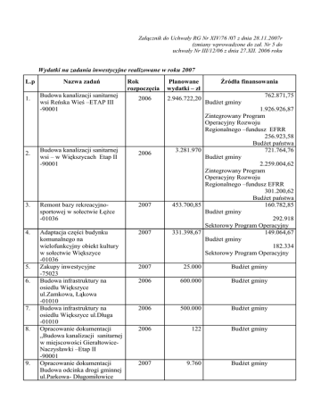 Załącznik do Uchwały RG Nr XIV/76 /07 z dnia 28.11.2007r (zmiany wprowadzone do zał. Nr 5 do uchwały Nr III/12/06 z dnia 27.XII. 2006 roku Wydatki na zadania inwestycyjne realizowane w roku 2007 L.p Rok rozpoczęcia Planowane wydatki – zł Budowa kanalizacji sanitarnej wsi Reńska Wieś –ETAP III -90001 2006 2.946.722,20 2. Budowa kanalizacji sanitarnej wsi – w Większycach Etap II -90001 2006 3. Remont bazy rekreacyjnosportowej w sołectwie Łężce -01036 2007 4. Adaptacja części budynku komunalnego na wielofunkcyjny obiekt kultury w sołectwie Większyce -01036 Zakupy inwestycyjne -75023 Budowa infrastruktury na osiedlu Większyce ul.Zamkowa, Łąkowa -01010 Budowa infrastruktury na osiedlu Większyce ul.Długa -01010 Opracowanie dokumentacji „Budowa kanalizacji sanitarnej w miejscowości GierałtowiceNaczysławki –Etap II -90001 Opracowanie dokumentacji Budowa odcinka drogi gminnej ul.Parkowa- Długomiłowice 2007 1. 5. 6. 7. 8. 9. Nazwa zadań Źródła finansowania 762.871,75 Budżet gminy 1.926.926,87 Zintegrowany Program Operacyjny Rozwoju Regionalnego –fundusz EFRR 256.923,58 Budżet państwa 3.281.970 721.764,76 Budżet gminy 2.259.004,62 Zintegrowany Program Operacyjny Rozwoju Regionalnego –fundusz EFRR 301.200,62 Budżet państwa 453.700,85 160.782,85 Budżet gminy 292.918 Sektorowy Program Operacyjny 331.398,67 149.064,67 Budżet gminy 182.334 Sektorowy Program Operacyjny 2007 25.000 Budżet gminy 2006 600.000 Budżet gminy 2006 500.000 Budżet gminy 2006 122 Budżet gminy 2007 9.760 Budżet gminy -60016 10. Budowa drogi gminnej – ul.Polna w Mechnicy 2007 170.000 Budżet gminy 2007 276.000 Budżet gminy 2007 6.100 Budżet gminy 2007 125.000 Budżet gminy 2007 113.678 Budżet gminy 2007 50.000 Budżet gminy 2007 137.151 Budżet gminy 2007 12.200 Budżet gminy 2007 15.100 Budżet gminy 2007 8.000 Budżet gminy 2007 4.000 Budżet gminy 2007 17.000 Budżet gminy 2007 27.791 Budżet gminy 2007 91.700 Budżet gminy 2007 34.000 Budżet gminy -60016 11. Zagospodarowanie terenu przy Publicznej Szkole Podstawowej w Długomiłowicach –etap II – 80101 12. Modernizacja oświetlenia ulicznego - 90015 13. Budowa odcinka sieci wodociągowej ul.TarnowskaDługomiłowice - 01010 14. Przebudowa ul.Tarnowskiej w Długomiłowicach - 60016 15. Budowa dróg transportu rolnego – opracowanie dokumentacji. - 60017 16. Kompleksowe uzbrojenie i rewitalizacja terenu byłego poligonu wojskowego w Pokrzywnicy- etap II - 60016 17. Budowa odcinka sieci wodociągowej ul.Tarnowska Długomiłowice – opracowanie dokumentacji -01010 18. Przebudowa ul.Fabrycznej w Reńskiej Wsi – opracowanie dokumentacji - 60016 19. Zakupy inwestycyjne - 80101 20. Zakupy inwestycyjne - 80110 21. Zakupy inwestycyjne - 60016 22. Opracowanie dokumentacjiOsiedle Większyce ul.Długaetap II- 60016 23. Wymiana pokrycia dachuBudynek szkoły Większyce - 80101 24. Wymiana pokrycia dachu-Sala gimnastyczna Długomiłowice- - 80101 25. Wymiana pokrycia dachu i wykonanie elewacji budynku komunalnego ul.Fabryczna – Reńska Wieś- 2007 143.850 Budżet gminy 2007 84.968 Budżet gminy 2007 1.977 Budżet gminy 2007 8.000 Budżet gminy 2007 13.000 Budżet gminy 2007 5.000 Budżet gminy 2007 8.379,48 Budżet gminy 2007 73.000 Budżet gminy 2007 60.000 Budżet gminy 2007 26.627 Budżet gminy 2007 17.051,70 Budżet gminy 2007 39.300 Budżet gminy 2007 38.900 Budżet Gminy - 70005 26. Wymiana pokrycia dachu budynku komunalnego ul.Strażaków –Gierałtowice - 70005 27. Opracowanie dokumentacji – „Miejsce spotkań-Mechnica” - 70005 28. Opracowanie dokumentacji „Oświetlenie ul.Przyjaciół, ul.Leśnej –Mechnica” - 90015 29. Renowacja figury św.Jana Nepomucena - 92195 30. „Budowa kanalizacji sanitarnej w miejscowości Gierałtowice-Naczysławki – Etap II-zakup gruntu pod przepompownię -90001 31. 32. 33. 34. Zakup wiaty przystankowej dla miejscowości Komorno -60016 Odtworzenie odcinka kanalizacji deszczowej – ul. Reński Koniec Reńska Wieś -90001 Odtworzenie odcinka kanalizacji deszczowej – Większyce -90001 Zakupy inwestycyjne - 85154 35. Zakupy inwestycyjne - 75412 36. Odtworzenie odcinka kanalizacji burzowej w Łężcach -90001 37. Opracowanie dokumentacjisala gimnastyczna z zapleczem socjalnym w Mechnicy -80101 Ogółem środki na zadania inwestycyjne 9.756.446,90 w tym: - 4.185.931,49 zł środki z Europejskiego Funduszu Rozwoju Regionalnego - 475.252 zł z Sektorowego Programu Operacyjnego - 558.124,20 zł budżet państwa - 4.537.139,21 zł środki budżetu gminy