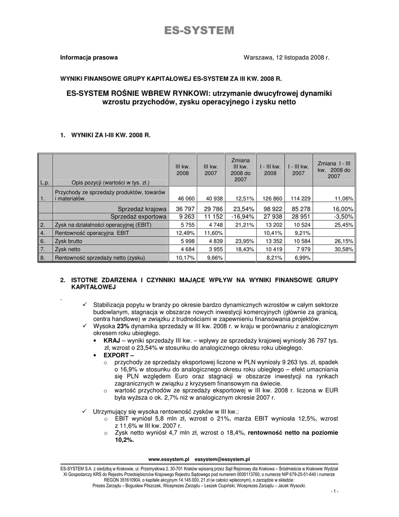 ES-SYSTEM Informacja prasowa Warszawa, 12 listopada 2008 r. WYNIKI FINANSOWE GRUPY KAPITAŁOWEJ ES-SYSTEM ZA III KW. 2008 R. ES-SYSTEM ROŚNIE WBREW RYNKOWI: utrzymanie dwucyfrowej dynamiki wzrostu przychodów, zysku operacyjnego i zysku netto 1. WYNIKI ZA I-III KW. 2008 R. III kw. 2008 L.p. 1. III kw. 2007 Opis pozycji (wartości w tys. zł.) Zmiana III kw. 2008 do 2007 I - III kw. 2008 I - III kw. 2007 Zmiana I - III kw. 2008 do 2007 Przychody ze sprzedaży produktów, towarów i materiałów. 46 060 40 938 12,51% 126 860 114 229 11,06% Sprzedaż krajowa Sprzedaż exportowa 36 797 9 263 29 786 11 152 23,54% -16,94% 98 922 27 938 85 278 28 951 16,00% -3,50% 21,21% 13 202 10,41% 13 352 10 419 10 524 9,21% 10 584 7 979 25,45% 8,21% 6,99% 2. 4. 6. 7. Zysk na działalności operacyjnej (EBIT) Rentowność operacyjna EBIT Zysk brutto Zysk netto 5 755 12,49% 5 998 4 684 4 748 11,60% 4 839 3 955 8. Rentowność sprzedaży netto (zysku) 10,17% 9,66% 23,95% 18,43% 26,15% 30,58% 2. ISTOTNE ZDARZENIA I CZYNNIKI MAJĄCE WPŁYW NA WYNIKI FINANSOWE GRUPY KAPITAŁOWEJ . Stabilizacja popytu w branży po okresie bardzo dynamicznych wzrostów w całym sektorze budowlanym, stagnacja w obszarze nowych inwestycji komercyjnych (głównie za granicą, centra handlowe) w związku z trudnościami w zapewnieniu finansowania projektów. Wysoka 23% dynamika sprzedaży w III kw. 2008 r. w kraju w porównaniu z analogicznym okresem roku ubiegłego. • KRAJ – wyniki sprzedaży III kw. – wpływy ze sprzedaży krajowej wyniosły 36 797 tys. zł, wzrost o 23,54% w stosunku do analogicznego okresu roku ubiegłego. • EXPORT – o przychody ze sprzedaży eksportowej liczone w PLN wyniosły 9 263 tys. zł, spadek o 16,9% w stosunku do analogicznego okresu roku ubiegłego – efekt umacniania się PLN względem Euro oraz stagnacji w obszarze inwestycji na rynkach zagranicznych w związku z kryzysem finansowym na świecie. o wartość przychodów ze sprzedaży eksportowej w III kw. 2008 r. liczona w EUR była wyższa o ok. 2,7% niż w analogicznym okresie 2007 r. Utrzymujący się wysoka rentowność zysków w III kw.: o EBIT wyniósł 5,8 mln zł, wzrost o 21%, marża EBIT wyniosła 12,5%, wzrost z 11,6% w III kw. 2007 r. o Zysk netto wyniósł 4,7 mln zł, wzrost o 18,4%, rentowność netto na poziomie 10,2%. www.essystem.pl [email protected] ES-SYSTEM S.A. z siedzibą w Krakowie, ul. Przemysłowa 2, 30-701 Kraków wpisaną przez Sąd Rejonowy dla Krakowa – Śródmieścia w Krakowie Wydział XI Gospodarczy KRS do Rejestru Przedsiębiorców Krajowego Rejestru Sądowego pod numerem 0000113760, o numerze NIP 679-25-51-640 i numerze REGON 351610904, o kapitale akcyjnym 14.145.000, 21 zł (w całości wpłaconym), o zarządzie w składzie: Prezes Zarządu – Bogusław Pilszczek, Wiceprezes Zarządu – Leszek Ciupiński, Wiceprezes Zarządu – Jacek Wysocki. -1- ES-SYSTEM Dywersyfikacja rynków zbytu za granicą: ożywiony rozwój sprzedaży na rynkach regionu Zatoki Perskiej, Ameryki Południowej i Azji zrównoważy mniejsze tempo wzrostu sprzedaży na rynkach będących pod wpływem kryzysu finansowego, tj. UE i Ameryki Północnej. Dalszy konsekwentny rozwój energooszczędnej oferty produktowej w obliczu zmian regulacyjnych UE. 3. NAJWAŻNIEJSZE REALIZACJE W III KW. 2008 R. ES-SYSTEM umacnia pozycję lidera na rynku profesjonalnej techniki oświetleniowej w segmencie budownictwa ogólnego: 23% wzrost wartości sprzedaży oświetlenia przemysłowego. 34% wzrost wartości sprzedaży oświetlenia zewnętrznego. ES-SYSTEM liderem w zakresie promocji i sprzedaży innowacyjnych urządzeń oświetleniowych: Ponad 30% wzrost wartości sprzedaży opraw systemu COSMO stosowanych w pomieszczeniach o najwyższych wymaganiach oświetleniowych i eksploatacyjnych. Ponad 76% wzrost wartości sprzedaży oświetlenia awaryjnego. o Utrzymana ponad 200% dynamika wzrostu wartości sprzedaży produktów najbardziej zaawansowanych technologicznie, pracujących w systemie centralnego nadzoru. Ważniejsze realizacje spółki ES-SYSTEM w III kw. 2008 r., przykłady: • • • • • • • • • • • • • • • • • • • Centrum Handlowe MARINO - Wrocław (Z) SEA TOWERS - Gdynia (T) Muzeum Sztuki Współczesnej - Kraków (Z) Zakład Radioterapii w Centrum Onkologii - Kraków (Z) Galeria Wisła - Płock (T) Hala magazynowa wysokiego składowania w Mokrzcu - Pilzno (Z) Betoniarnia Betard - Długołęka (T) Michael Huber – mieszalnia farb - Wrocław (Z) Osiedle Leśne Etap V - Warszawa (Z) Galeria Wisła - Płock (Z) Sieć banków Allianz - cały kraj (T) Państwowa Wytwórnia Papierów Wartościowych - Warszawa (T) Kino Maxfilm - Płock (Z) Budynek Polskiej Akademii Nauk - Warszawa (T) Procter & Gamble Fabryka Kosmetyków - Aleksandrów Łódzki (Z/T) Lotnisko Budynek Strażnicy - Ławica k/Poznania (Z) Elektrownia Bełchatów Blok 858MW (T) Hortex Zakład Skierniewice (Z) Biurowiec Green Point - Poznań (Z/T) (Z) – zrealizowany (T) – w trakcie realizacji 4. SPRZEDAŻ EKSPORTOWA W sprzedaży eksportowej w III kw. 2008 r. nadal dominują kraje europejskie. Nie mniej jednak liczba krajów spoza UE, do których sprzedawaliśmy nasze produkty w III kwartale 2008 wzrosła do 20 z 18 w III kwartale 2007 roku. Warte odnotowania jest pojawienie się Bułgarii i Kuwejtu w pierwszej dziesiątce największych importerów produktów ES-SYSTEM. Duży wzrost sprzedaży nastąpił w Rosji w związku z dostawami sprzętu dla nowego biurowca Aerofłotu w Moskwie. W lipcu spółka odnotowała pierwszą sprzedaż do Kostaryki a we wrześniu do Indii. Międzynarodowy kryzys finansowy i postępujące w ślad za nim ograniczenia inwestycyjne potwierdziły słuszność strategii dywersyfikacji rynków zbytu. Globalne spowolnienie gospodarcze ma różny wymiar www.essystem.pl [email protected] ES-SYSTEM S.A. z siedzibą w Krakowie, ul. Przemysłowa 2, 30-701 Kraków wpisaną przez Sąd Rejonowy dla Krakowa – Śródmieścia w Krakowie Wyd