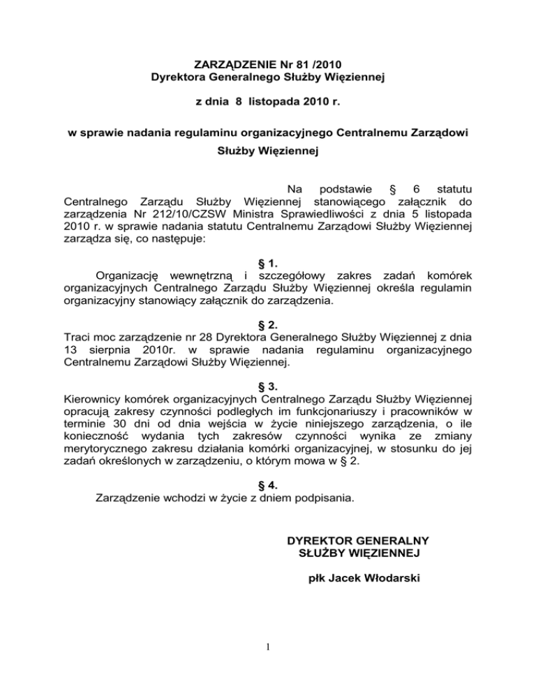 ZARZĄDZENIE Nr 81 /2010 Dyrektora Generalnego Służby Więziennej z dnia 8 listopada 2010 r. w sprawie nadania regulaminu organizacyjnego Centralnemu Zarządowi Służby Więziennej Na podstawie § 6 statutu Centralnego Zarządu Służby Więziennej stanowiącego załącznik do zarządzenia Nr 212/10/CZSW Ministra Sprawiedliwości z dnia 5 listopada 2010 r. w sprawie nadania statutu Centralnemu Zarządowi Służby Więziennej zarządza się, co następuje: § 1. Organizację wewnętrzną i szczegółowy zakres zadań komórek organizacyjnych Centralnego Zarządu Służby Więziennej określa regulamin organizacyjny stanowiący załącznik do zarządzenia. § 2. Traci moc zarządzenie nr 28 Dyrektora Generalnego Służby Więziennej z dnia 13 sierpnia 2010r. w sprawie nadania regulaminu organizacyjnego Centralnemu Zarządowi Służby Więziennej. § 3. Kierownicy komórek organizacyjnych Centralnego Zarządu Służby Więziennej opracują zakresy czynności podległych im funkcjonariuszy i pracowników w terminie 30 dni od dnia wejścia w życie niniejszego zarządzenia, o ile konieczność wydania tych zakresów czynności wynika ze zmiany merytorycznego zakresu działania komórki organizacyjnej, w stosunku do jej zadań określonych w zarządzeniu, o którym mowa w § 2. § 4. Zarządzenie wchodzi w życie z dniem podpisania. DYREKTOR GENERALNY SŁUŻBY WIĘZIENNEJ płk Jacek Włodarski 1 Załącznik do zarządzenia nr 81 /2010 Dyrektora Generalnego Służby Więziennej z dnia 8 listopada 2010 r. Regulamin organizacyjny Centralnego Zarządu Służby Więziennej Rozdział 1 Struktura organizacyjna Centralnego Zarządu Służby Więziennej § 1. 1. Strukturę organizacyjną Centralnego Zarządu Służby Więziennej, zwanego dalej „Centralnym Zarządem”, tworzą: 1) Kierownictwo: a) Dyrektor Generalny Służby Więziennej, b) zastępcy Dyrektora Generalnego Służby Więziennej; 2) Biuro Dyrektora Generalnego Służby Więziennej, w którego skład wchodzą: a) Zespół Kontroli i Inspekcji, b) Zespół Organizacji Współpracy Zewnętrznej, c) Zespół Redakcji „Przeglądu Więziennictwa Polskiego” i „Forum Penitencjarnego”; 3) Biuro Dozoru Elektronicznego w skład którego wchodzi Zespół Obsługi Centrali Monitorowania; 4) Biuro Kadr i Szkolenia, w skład którego wchodzi Zespół Służby Medycyny Pracy i Bezpieczeństwa i Higieny Pracy; 5) Biuro Penitencjarne w skład którego wchodzi Zespół Funduszy Europejskich; 6) Biuro Ochrony i Spraw Obronnych; 7) Biuro Prawne, w skład którego wchodzi Zespół do spraw Skarg Osób Pozbawionych Wolności; 8) Biuro Kwatermistrzowsko-Inwestycyjne, w skład którego wchodzą: a) Zespół Zamówień Publicznych, b) Inspekcja Gospodarki Energetycznej Służby Więziennej; 9) Biuro Budżetu, w skład którego wchodzą: a) Zespół Kontroli Zarządczej, b) Zespół Rozliczeń Projektów Realizowanych z Funduszy Europejskich; 10) Biuro Informacji i Statystyki, w skład którego wchodzą: a) Zespół Informacji, b) Zespół Operatorów Bazy Danych; 11) Biuro Służby Zdrowia; 12) Biuro Informatyki i Łączności; 13) Zespół Ochrony Informacji Niejawnych; 2 14) Zespół Audytu Wewnętrznego. 2. W skład Centralnego Zarządu, oprócz komórek organizacyjnych, o których mowa w ust.1, wchodzi Rada Duszpasterstwa Więziennego. 3. Przy Centralnym Zarządzie działa Biuro Emerytalne Służby Więziennej, zwane dalej „Biurem Emerytalnym”; obsługę kadrową, finansową i kwatermistrzowską oraz realizację uprawnień funkcjonariuszy i pracowników Biura Emerytalnego sprawują właściwe merytorycznie komórki Centralnego Zarządu. 4. Wykaz stanowisk w Centralnym Zarządzie oraz liczbę i strukturę etatów w komórkach organizacyjnych oraz w Biurze Emerytalnym, określa Dyrektor Generalny Służby Więziennej, zwany dalej „Dyrektorem Generalnym”, w odrębnych przepisach. Rozdział 2 Tryb kierowania w Centralnym Zarządzie 1. 2. 3. 4. § 2. Centralnym Zarządem kieruje Dyrektor Generalny przy pomocy zastępców Dyrektora Generalnego oraz kierowników komórek organizacyjnych, o których mowa w § 1 ust. 1 pkt 2-14. Szczegółowy podział kompetencji między członkami Kierownictwa Centralnego Zarządu, o których mowa w § 1 ust. 1 pkt 1, określa odrębne zarządzenie Dyrektora Generalnego. Dyrektor Generalny może upoważnić poszczególnych funkcjonariuszy lub pracowników Centralnego Zarządu do wydawania w jego imieniu decyzji w określonych sprawach. Dyrektor Generalny może powoływać kolegialne organy doradcze lub opiniodawcze oraz tworzyć zespoły o charakterze stałym lub do wykonywania określonych zadań. § 3. Wydawanie jednostkom organizacyjnym Służby Więziennej, zwanym dalej „jednostkami organizacyjnymi”, poleceń i wytycznych, należy do wyłącznej kompetencji Dyrektora Generalnego. Wydawanie poleceń i wytycznych przez zastępców Dyrektora Generalnego może następować w zakresie ich właściwości i upoważnień udzielonych przez Dyrektora Generalnego. § 4. 1. Biurem kieruje dyrektor biura, wydziałem naczelnik wydziału, a zespołem kierownik zespołu, z zastrzeżeniem § 6 ust. 3. 2. Na wniosek dyrektora biura może być powołany zastępca dyrektora biura. 3. Kierowanie zespołem może być powierzone zastępcy dyrektora biura, o ile zespół wchodzi w skład biura. § 5. 3 1. Dyrektor biura, naczelnik wydziału oraz kierownik zespołu, zwani dalej „kierownikami komórek”, wykonują zadania w zakresie przypisanej właściwości rzeczowej, wynikającej z zadań Dyrektora Generalnego. 2. Kierownicy komórek mogą powoływać nieetatowe zespoły realizujące określone przez nich zadania oraz wyznaczać podległych funkcjonariuszy lub pracowników do kierowania tymi zespołami. W szczególnie uzasadnionych przypadkach, na wniosek dyrektora biura lub naczelnika wydziału, Dyrektor Generalny może powołać etatowy zespół w ramach biura lub wydziału, realizujący określone zadania; kierownik zespo