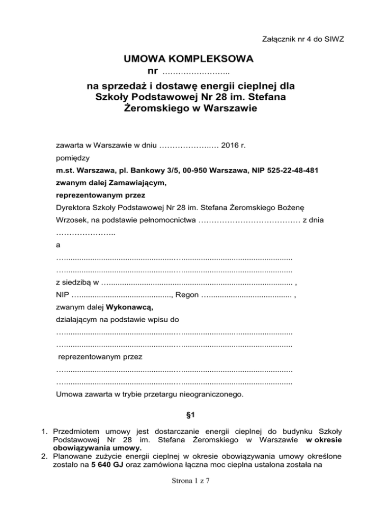 Załącznik nr 4 do SIWZ UMOWA KOMPLEKSOWA nr …………………….. na sprzedaż i dostawę energii cieplnej dla Szkoły Podstawowej Nr 28 im. Stefana Żeromskiego w Warszawie zawarta w Warszawie w dniu ………………..… 2016 r. pomiędzy m.st. Warszawa, pl. Bankowy 3/5, 00-950 Warszawa, NIP 525-22-48-481 zwanym dalej Zamawiającym, reprezentowanym przez Dyrektora Szkoły Podstawowej Nr 28 im. Stefana Żeromskiego Bożenę Wrzosek, na podstawie pełnomocnictwa ………………………………… z dnia ………………….. a …..................................................…................................................... …..................................................…................................................... z siedzibą w ….................................................................................... , NIP ….........................................., Regon …...................................... , zwanym dalej Wykonawcą, działającym na podstawie wpisu do …..................................................…................................................... …..................................................…................................................... reprezentowanym przez …..................................................…................................................... …..................................................…................................................... Umowa zawarta w trybie przetargu nieograniczonego. §1 1. Przedmiotem umowy jest dostarczanie energii cieplnej do budynku Szkoły Podstawowej Nr 28 im. Stefana Żeromskiego w Warszawie w okresie obowiązywania umowy. 2. Planowane zużycie energii cieplnej w okresie obowiązywania umowy określone zostało na 5 640 GJ oraz zamówiona łączna moc cieplna ustalona została na Strona 1 z 7 0,3528 MW. W przypadku skorzystania przez Zamawiającego z prawa opcji planowane zużycie energii cieplnej zwiększone zostanie o 1 600 GJ. 3. Ilość planowanego zużycia ciepła określona w ust. 2 ma charakter szacunkowy i nie stanowi ze strony Zamawiającego zobowiązania do zakupu. Wykonawcy nie będzie przysługiwało jakiekolwiek roszczenie z tytułu nie pobrania przez Zamawiającego przewidywanej ilości energii, poza rozliczeniem należności za faktycznie zużytą ilość energii, wg cen określonych przez Wykonawcę w niniejszej umowie. 4. Ciepło będzie dostarczane za pośrednictwem nośnika ciepła – gorącej wody, przy pomocy sieci ciepłowniczej należącej do dystrybutora sieci. Wykonawca niebędący dystrybutorem sieci oświadcza ponadto, że zawarł umowę z dystrybutorem sieci, w ramach której dystrybutor zapewnia Wykonawcy świadczenie usług dystrybucji na rzecz Zamawiającego. Temperatura wody zostanie ustalona w tabeli regulacyjnej wody sieciowej, a zmiana wartości zawartych w tabeli nie będzie stanowiła zmiany umowy. §2 Umowa kompleksowa dostarczania ciepła zostanie zawarta na czas określony: od 01.01.2017r. do 31.12.2019r. lub wcześniejszego wyczerpania środków finansowych określonych w umowie określonych w par. 3 ust. 3, wynikających z budżetu zamawiającego przeznaczonych na ten cel. §3 1. Ustalenie wysokości wynagrodzenia należnego Wykonawcy z tytułu dostarczania energii cieplnej dokonywane będzie odpowiednio według cen, stawek opłat oraz zasad rozliczeń określonych w aktualnej Taryfie dla grupy taryfowej o symbolu ..…………. (podanej w ofercie Wykonawcy) w okresach miesięcznych. 2. W przypadku zmiany cen, stawek opłat i zasad ich stosowania, zatwierdzonych przez Prezesa Urzędu Regulacji Energetyki w taryfie wskazanej w par. 3 ust. 1 Wykonawca powiadomi pisemnie Zamawiającego. Zmiana taka nie wymaga formy aneksu. 3. Zaoferowana cena brutto za zamówienie podstawowe stanowić będzie maksymalną wartość wynagrodzenia wykonawcy z tytułu umowy, po wyczerpaniu której umowa wygasa i wynosi …………………………….. zł brutto, chyba że Zamawiający skorzysta z prawa opcji; w takim przypadku umowa wygasa po wyczerpaniu łącznej ceny brutto za zamówienie podstawowe i objęte prawem opcji i wynosi ……………………………………………… zł brutto. 4. Zapłata będzie dokonana przelewem bankowym na konto wskazane przez Wykonawcę na fakturze, w terminie 21 dni od daty wystawienia faktury VAT, jednak nie krótszym niż 7 dni od daty dostarczenia Zamawiającemu prawidłowo wystawionej faktury. 5. Za datę dokonania zapłaty Strony uznają datę obciążenia rachunku Zamawiającego. 6. Wystawiane przez Wykonawcę faktury powinny wskazywać jako podatnika – nabywcę Miasto Stołeczne Warszawa, Pl. Bankowy 3/5, 00-950 Warszawa, NIP 525-22-48-481, a jako odbiorcę i płatnika Szkołę Podstawową nr 28 im. Stefana Żeromskiego w Warszawie. 7. Faktury dostarczane powinny być na adres:ul. Gościeradowska 18/20, 03-535 Warszawa. Strona 2 z 7 §4 1. W ramach umowy Wykonawca zobowiązany będzie w szczególności do: 1) przesyłania, dystrybucji i sprzedaży ciepła Zamawiającemu; 2) dotrzymywania parametrów jakościowych nośnika ciepła oraz i standardów jakościowych obsługi odbiorców, co najmniej odpowiadających parametrom i standardom wskazanym w rozporządzeniu Ministra Gospodarki z dnia 15 stycznia 2007 r. w sprawie szczegółowych warunków funkcjonowania systemów ciepłowniczych (Dz. U. Nr 16, poz. 92); 3) umożliwienia Zamawiającemu dostępu do układu pomiaroworozliczeniowego oraz kontroli prawidłowości wskazań tego układu. 4) zapewnienia standardów jakościowych obsługi odbiorców, w szczególności: a. przyjmowania zgłoszeń i reklamacji Zamawiającego, b. nieodpłatnego udzielania informacji w sprawie rozliczeń oraz aktualnej taryfy; c. rozpatrywania wniosków lub reklamacji Zamawiającego w sprawie rozliczeń i udzielania odpowiedzi nie później niż w terminie 14 dni od dnia złożenia wniosku lub zgłoszenia reklamacji. 2. Wykonawca będz