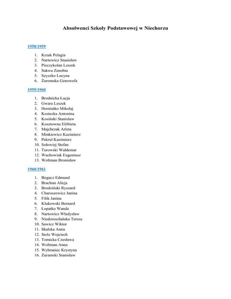 Absolwenci Szkoły Podstawowej w Niechorzu 1958/1959 1. 2. 3. 4. 5. 6. Krzak Pelagia Nartowicz Stanisław Pieczykolan Leszek Sakwa Zenobia Szyszko Lucyna Żuromska Genowefa 1959/1960 1. 2. 3. 4. 5. 6. 7. 8. 9. 10. 11. 12. 13. Brodnicka Łucja Gwara Leszek Horniatko Mikołaj Kostecka Antonina Kosiński Stanisław Kosztowna Elżbieta Majchrzak Arleta Minkiewicz Kazimierz Pekrul Kazimierz Sołowiej Stefan Turowski Waldemar Wachowiak Eugeniusz Woltman Bronisław 1960/1961 1. 2. 3. 4. 5. 6. 7. 8. 9. 10. 11. 12. 13. 14. 15. 16. Bogacz Edmund Brachun Alicja Brodziński Ryszard Charoszewicz Janina Filik Janina Klukowski Bernard Łopatko Wanda Nartowicz Władysław Niedoroszlańska Teresa Sawicz Wiktor Skalska Anna Stolz Wojciech Tomicka Czesława Woltman Anna Wybraniec Krystyna Żuramski Stanisław 1961/1962 1. 2. 3. 4. 5. 6. 7. 8. 9. 10. 11. 12. 13. 14. 15. 16. 17. 18. 19. 20. 21. 22. 23. 24. 25. Bancewicz Zygmunt Barańska Jadwiga Igras Anna Igras Łucja Janiak Zbigniew Kleszyk Bolesław Klukowski Zbigniew Kłapa Stanisław Kostecka Kazimiera Kubicki Piotr Lebioda Bożena Lubińska Stanisława Łowczynowska Wanda Murzyn Waldemar Palmowski Jerzy Rafalska Barbara Sakwa Ignacy Sołowiej Józef Szyszko Roman Turek Józefa Wachowiak Bogdan Wybraniec Piotr Zaremba Krystyna Żawaronek Krystyna Żawaronek Romuald 1962/1963 1. 2. 3. 4. 5. 6. 7. 8. 9. 10. 11. 12. 13. 14. 15. Brodziński Tadeusz Kalinkiewicz Danuta Kosińska Halina Kosińska Rozalia Kosztowny Mieczysław Kubicki Józef Łowczynowski Czesław Niedoroszlański Bogusław Prawicki Józef Sokołowska Lucyna Stolz Sławomir Szymul Bożena Tomicka Krystyna Tubilewicz Henryk Tymicz Edward 1963/1964 1. Bancewicz Wojciech 2. 3. 4. 5. 6. 7. 8. 9. 10. 11. 12. 13. 14. 15. 16. 17. 18. 19. 20. 21. 22. 23. 24. Brodzińska Halina Daniel Krystyna Dobek Stanisław Dudo Jadwiga Frąckowiak Kazimierz Frąckowiak Stanisława Gwara Urszula Kalankiewicz Helena Kosiński Ryszard Lentowicz Elwira Łowczynowska Genowefa Łowczynowski Ryszard Minkiewicz Lesław Parafianowicz Alina Pieczykolan Teresa Sacharuk Stefan Skalska Krystyna Tubilewicz Jan Wachowiak Anna Wal Ryszard Woltman Danuta Zawal Waldemar Żarów Irena 1964/1965 1. 2. 3. 4. 5. 6. 7. 8. 9. 10. 11. 12. 13. 14. 15. 16. 17. 18. 19. 20. 21. 22. Bancewicz Bogdan Barańska Regina Brodnicki Zenon Daniel Elżbieta Dutka Wiesława Ejsmont Jarosław Filik Helena Gmiter Jerzy Gwara Elżbieta Hryniewicz Jan Igras Anna Kalinowska Teresa Kostecka Łucja Kleszyk Danuta Klukowski Ryszard Kurmiel Józef Lopatko Jadwiga Nowak Jerzy Pieczykolan Gabriel Radziewicz Danuta Rafalska Jolanta Sacharuk Regina 23. 24. 25. 26. 27. 28. 29. 30. Sierociński Jan Spuła Jerzy Stoma Józef Wal Jan Wesołowska Teresa Wójcik Elżbieta Wybraniec Andrzej Zawal Karol 1965/1966 1. 2. 3. 4. 5. 6. 7. 8. 9. 10. 11. 12. 13. 14. Brodziński Józef Gmiter Henryk Gmiter Zbigniew Kalinkiewicz Edward Kozłowski Zbigniew Kurmiel Józef Moskalonek Czesław Niedźwiecki Andrzej Płuciennik Ryszard Prawicki Zdzisław Sierociński Bogdan Stolz Leon Stoma Kazimierz Wesołowski Tadeusz 1966/1967 1. 2. 3. 4. 5. 6. 7. 8. 9. 10. 11. Barański Eugeniusz Klukowska Janina Kosińska Kazimiera Kuzicki Mieczysław Lebioda Elżbieta Lubiński Kazimierz Palmowska Izabela Sienkiewicz Jadwiga Szymul Marek Tubilewicz Irena Zienkiewicz Mirosława 1967/1968 1. 2. 3. 4. 5. 6. Bancewicz Krzysztof Bogacz Marian Zbigniew Brodziński Marian Czaplińska Elżbieta Filipionek Teresa Gmiter Zdzisław 7. 8. 9. 10. 11. 12. 13. 14. 15. 16. 17. 18. 19. 20. 21. 22. Januszewski Mirosław Kaczmarek Danuta Klukowska Stanisława Konieczka Danuta Kozłowski Antoni Kozłowska Maria Lasota Tadeusz Łopatko Janina Majchrzak Krzysztof Mićko Andrzej Niedźwiecka Zofia Nowak Jolanta Oświęcimski Andrzej Pekrul Edward Skalska Stanisława Wójcik Zbigniew 1968 /1969 1. 2. 3. 4. 5. 6. 7. 8. 9. 10. 11. 12. 13. 14. 15. 16. 17. 18. 19. 20. Bajorek Teresa Buczyńska Wanda Daniel Halina Gwara Mirosława Hryniewicz Henryk Jaworski Roman Kotoński Zdzisław Kubicka Barbara Kuzicki Stanisław Lebioda Krzysztof Łowczynowski Zbigniew Makowska Urszula Paluch Zofia Palmowska Mirosława Sienkiewicz Anna Sierocińska Cecylia Stukan Halina Tubilewicz Zofia Zaręba Jadwiga Żarów Jerzy 1960/1970 1. 2. 3. 4. 5. 6. 7. Augustyniak Władysława Bancewicz Barbara Brodnicka Danuta Czaplińska Barbara Dobek Grażyna Gmiter Teresa Januszewska Ewa 8. 9. 10. 11. 12. 13. 14. 15. 16. 17. 18. 19. 20. 21. 22. 23. 24. 25. 26. 27. 28. Jaskólska Teresa Kalankiewicz Roman Kalinowska Barbara Kawka Teresa Kosiński Józef Kulińska Irena Kutora Bożena Kwiatkowski Jerzy Kwiatkowski Kazimierz Lentowczyk Władysława Lowczynowska Ewa Nowakowska Agnieszka Oświęcimska Zofia Piątkiewicz Jolanta Rydzyńska Mirosława Ryndak Bronisław Skalska Teresa Stachowiak Elżbieta Stachowski Janusz Wal Stefania Zawal Mieczysława 1970/1971 1. 2. 3. 4. 5. 6. 7. 8. 9. 10. 11. 12. 13. 14. 15. 16. 17. 18. 19. 20. 21. 22. 23. 24. Augustyniak Krzysztof Bajorek Małgorzata Barański Jan Brodnicka Teresa Czaplińska Ewa Czeronko Józef Daniel Teresa Ejsmont Małgorzata Filipionek Janina Iskra Piotr Jankowiak Jolanta Jaworska Grażyna Klukowski Michał Kordzikowska Natalia Kostecka Jadwiga Kosiński Jan Kosztowna Bożena Kurmiel Bronisława Mackiewicz Małgorzata Nowak Małgorzata Ogonowska Danuta Pastewska Barbara Pastewska Krystyna Radoman Renata 25. Wohlert Marian 1971/1972 1. 2. 3. 4. 5. 6. 7. 8. 9. 10. 11. 12. 13. 14. 15. 16. 17. 18. Bajorek Bożena Brodzińska Danuta Dobraszak Stanisław Filipionek Lucyna Frąckowiak Grażyna Gospodarek Danuta Gospodarek Janusz Kmieciak Waldemar Konieczka Maria Kosiński Jerzy Lentowczyk Franciszek Leśniak Danuta Malinowska Zofia Wierzbicki Krzysztof Wojciechowicz Jadwiga Wójcik Małgorzata Zienkiewicz Piotr Żarów Ryszard 1972/1973 1. 2. 3. 4. 5. 6. 7. 8. 9. 10. 11. 12. 13. 14. 15. 16. 17. 18. 19. 20. 21. 22. 23. Baran Adam Barański Zygmunt Bartkowski Andrzej Bureta Leszek Czeronko Jan Dobek Zygmunt Górajc