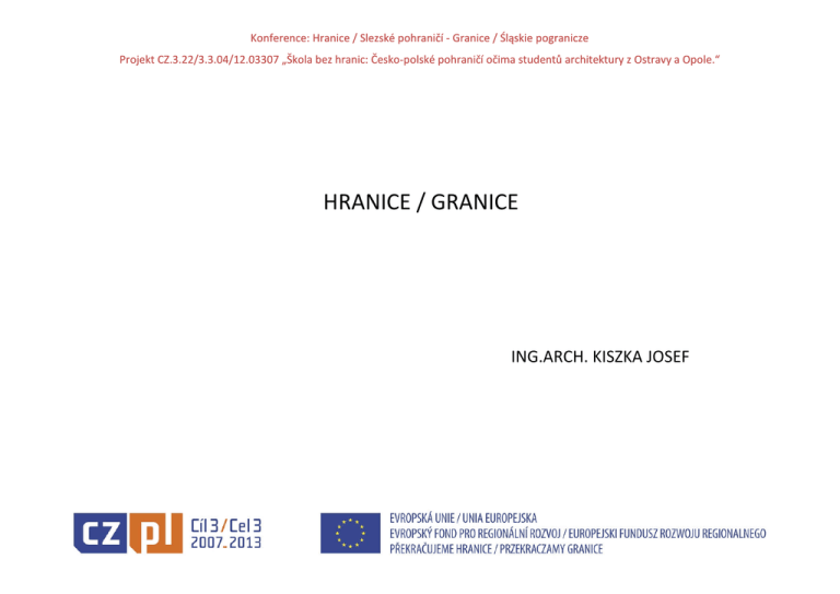 Konference: Hranice / Slezské pohraničí - Granice / Śląskie pogranicze Projekt CZ.3.22/3.3.04/12.03307 „Škola bez hranic: Česko-polské pohraničí očima studentů architektury z Ostravy a Opole.“ HRANICE / GRANICE ING.ARCH. KISZKA JOSEF HRANICE Workshopy proběhlé 2009/12: Žacléř; Broumov – Křinice; Osoblaha – Bohušov, Prudnik , Prajzsko – Opava připravované 2013/14: Ostrava – Poodří, Czechowice /Orlová – Design pro město výhled: Knížectví Těšínské, Zatorské, Opavské, Krnovské, Svidnické, Kladsko Výzkum proběhlé: probíhající: v přípravě Brownfieldy Hranice Pentagram – speciální mapa Industriál Natura – kultura Výstavy proběhlé: výhled 2014 VŠB Nová aula Ostrava Důl Michal Ostrava Publikace v přípravě: výhled 2014 (Blue) Notes 1 (Accendo Ostrava) (Blues) Notes 2 Partneři a spolupráce: Katedra Architektury, Wydział Budownictwa, Politechnika Opolska, Opole, Polsko Wydział Architektury, Politechnika Sląska, Gliwice, Polsko Akademia Sztuk Pięknych, Katowice, Polsko HRANICE PODĚKOVÁNÍ Euroregionu SILESIA VŠB TU Ostrava a FAST VŠB TU Ostrava Partnerovi projektu PO Opole a WB PO Opole Expertům, autorům Pedagogům, pracovníkům, tutorům, studentům SPŠS Opava, Accendo Martinovi Nedvědovi Josef Kiszka HRANICE dr hab. Anna Śliz, prof. UO Socjolog, profesor nadzwyczajny w Instytucie Socjologii Uniwersytetu Opolskiego. Główne pola naukowego zainteresowania to socjologia teoretyczna, socjologia konfliktów społecznych i etnicznych, socjologia grup etnicznych, zmiana i rozwój społeczny, zjawisko wielokulturowości we współczesnym świecie. Jest autorką i współautorką ponad 100 prac naukowych. prof. zw. dr hab. Marek S. Szczepański Socjolog, profesor zwyczajny w Instytucie Socjologii Uniwersytetu Śląskiego w Katowicach i Uniwersytetu Opolskiego. Główne pola naukowego zainteresowania to socjologia teoretyczna, socjologia regionu i społeczności lokalnych, miasta i przestrzeni, zmiany i rozwoju społecznego oraz socjologia konfliktów społecznych i etnicznych. Jest autorem bądź współautorem ponad 300 prac naukowych. dr Monika Choroś Adiunkt w Państwowym Instytucie Naukowym – Instytucie Śląskim w Opolu. Zainteresowania naukowe, nazewnictwo geograficzne Śląska, polsko-niemieckie kontakty językowe i ich odzwierciedlenie w toponimii. Autorka i współautorka publikacji z zakresu nazewnictwa geograficznego i historii języka na Śląsku, dialektów śląskich oraz dwujęzycznych nazw miejscowości. Współautorka „Słownika etymologicznego nazw geograficznych Śląska”. dr inż. arch. Ryszard Nakonieczny Doktor inżynier architekt, adiunkt na Wydziale Architektury Politechniki Śląskiej w Gliwicach, autor pracy doktorskiej "Wielkomiejska architektura mieszkaniowa Katowic w okresie międzywojennym (1922-1939)", w latach 2004-2011 redaktor naczelny ogólnopolskiego kwartalnika "Archivolta", redaktor i współautor książki "Słynne wille Polski" (Foibos, Praha 2013), zajmuje się historią architektury współczesnej HRANICE prof. Ing. arch. Mojmír Kyselka, CSc. Nar. 1933 v Brně, vystudoval Fakultu architektury a pozemního stavitelství VŠSt v Brně (1957), specializace urbanismus a krajina. Realizační projekty od zemědělských staveb po krajinné plánování. Učil zahradní a krajinnou architekturu v Lednici, od roku 1990 na Fakultě architektury v Brně, v roce 1995 jmenován profesorem. Působil v Bratislavě, přednášel v USA, byl vedoucím Katedry architektury Fakulty stavební VŠB-TU v Ostravě. prof. RNDr. Tadeusz Siwek, CSc. Geograf, absolwent Uniwersytetu Komenskiego w Bratysławie, doktorat i habilitację uzyskał na Uniwersytecie Karola w Pradze. Obecnie jest docentem w Katedrze Geografii Społecznej i Rozwoju Regionalnego Wydziału Nauk Przyrodniczych Uniwersytetu Ostrawskiego. Zajmuje się teoretycznymi zagadnieniami geografii behawioralnej, w tym przede wszystkim percepcją przestrzeni geograficznej oraz kwestiami narodowościowymi i tożsamościowymi, koncentrując się na problematyce mniejszości polskiej w Republice Czeskiej, do której sam należy. doc. Ing. arch. Jiří Löw (Praha, 1948) Zabývá se územním plánováním, ochranou přírody a krajiny. Je jedním z autorů teorie územních systémů ekologické stability pro zabezpečení přírodních složek v krajině. Pracuje jako projektant ve vlastní společnosti v Brně a externě vyučuje na Fakultě architektury VUT v Brně. Je spoluautorem publikace Krajinný ráz (2003), Rukověť projektanta územních systémů ekologické stability (1995) a učebních textů: Aplikovaná ekologie, Krajina, krajinná a sídelní kompozice, krajinný ráz, Katalog znaků krajiny pro architekty (2011-2012). RNDr. Pavel Ptáček, Ph.D.Nar. 1972, je absolventem magisterského a doktorského studia na Katedře sociální geografie a regionálního rozvoje Přírodovědecké fakulty Univerzity Karlovy v Praze. Ve svých výzkumech se zaměřuje na problematiku vývoje sídelních systémů a institucionálních přístupů v ekonomické geografii. Mgr. Pavel Roubínek Nar. 1985, je absolventem magisterského studia učitelství geografie-historie na UP v Olomouci. V současnosti studuje doktorský obor politická a kulturní geografie na PřF OU v Ostravě. Věnuje se problematice vývoje sídelních systémů. Mgr. Petr Kladivo, Ph.D. Nar. 1981, je absolventem magisterského studia učitelství geografie-matematika na PřF UP v Olomouci a doktorského studia oboru regionální geografie a regionální rozvoj PřF MU v Brně. Ve svých výzkumech se zabývá urbánní geografií a kvantitativními metodami. Mgr. Martin Strakoš (Ostrava, 1972) Zabývá se teorií a historií architektury, mimo jiné péčí o památky moderní architektury a vztahem nové architektury a historického prostředí. Pracuje jako památkář v ostravském územním pracovišti Národního památkového ústavu. Je autorem publika