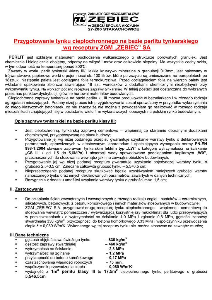 Przygotowanie tynku ciepłochronnego na bazie perlitu tynkarskiego wg receptury ZGM „ZĘBIEC” SA PERLIT jest szklistym materiałem pochodzenia wulkanicznego o strukturze porowatych granulek. Jest chemicznie i biologicznie obojętny, odporny na wilgoć i mróz oraz całkowicie niepalny. Ma wszystkie cechy szkła, w tym odporność na temperaturę ponad 800°C. Zawarty w worku perlit tynkarski /klasy III/, lekkie kruszywo mineralne o granulacji 0÷3mm, jest pakowany w trójwarstwowe, papierowe worki o pojemności ok. 100 litrów, które po zszyciu są umieszczane na europaletach po 18sztuk. Następnie paleta jest obciągana folia termokurczliwą. Przed obciągnięciem folią na wierzch palety jest wkładane opakowanie zbiorcze zawierające 18 szt. woreczków z dodatkami chemicznymi niezbędnymi przy wykonywaniu tynku. Na workach podano recepturę zaprawy tynkarskiej. W takiej postaci jest dostarczana do wybranych przez nas punktów dystrybucji, głównie hurtowni materiałów budowlanych. Ciepłochronne zaprawy tynkarskie na bazie perlitu kl. III moŜna produkować w betoniarkach i w róŜnego rodzaju agregatach mieszających. Podany niŜej proces ich przygotowywania został sprawdzony w przypadku wykorzystania do niego klasycznych betoniarek, co nie znaczy Ŝe nie moŜna z powodzeniem go realizować w róŜnego rodzaju mieszalnikach znajdujących się w posiadaniu wielu firm wykonawczych obecnych na polskim rynku budowlanym. Opis zaprawy tynkarskiej na bazie perlitu klasy III: Jest ciepłochronną, tynkarską zaprawą cementowo – wapienną ze starannie dobranymi dodatkami chemicznymi, przygotowywaną na placu budowy; Przygotowanie jej wg niŜej podanego przepisu gwarantuje uzyskanie warstwy tynku o deklarowanych parametrach, sprawdzonych w atestowanym laboratorium i spełniających wymagania normy PN-EN 998-1:2004 stawiane zaprawom tynkarskim lekkim typ „LW” o kategorii wytrzymałości na ściskanie „CS II” ( od 1,5 do 5,0MPa) i absorpcji wody spowodowane podciąganiem kapilarnym „W0”, przeznaczonych do stosowania wewnątrz jak i na zewnątrz obiektów budowlanych; Przygotowanie jej wg niŜej podanej receptury gwarantuje uzyskanie pojedynczej warstwy tynku o grubości 2,5÷3,5 cm. Zalecana całkowita grubość tynku – 5,5÷6,5 cm; Nieprzestrzeganie podanej receptury skutkować będzie uzyskiwaniem mniejszych grubości warstw nanoszonego tynku oraz innych deklarowanych parametrów, zawartych w danych technicznych; Rezygnacja z dodatku umoŜliwi uzyskanie warstwy tynku o grubości max. 1,5 cm; II. Zastosowanie Do ocieplania ścian zewnętrznych i wewnętrznych z róŜnego rodzaju cegieł i pustaków – ceramicznych, silikatowych, betonowych, z betonu komórkowego i innych materiałów stosowanych w budownictwie; ZGM „ZĘBIEC” S.A. przygotował drugą recepturę tynku ciepłochronnego – wapienno - cementową do stosowania wewnątrz pomieszczeń / wytwarzającą korzystniejszy mikroklimat dla ludzi przebywających w pomieszczeniach / o wytrzymałości na ściskanie 1,0 MPa i zginanie 0,6 MPa, gęstości zaprawy stwardniałej 330 kg/m3, przyczepności do betonu komórkowego 0,33 MPa i współczynniku przewodzenia ciepła λ = 0,089 W/m°K. Wykonanego wg tej receptury tynku nie moŜna stosować na zewnątrz murów; III. Dane techniczne gęstość objętościowa świeŜego tynku – 830 kg/m3 gęstość zaprawy stwardniałej – 460 kg/m3 wytrzymałość na ściskanie – 2,8 MPa wytrzymałość na zginanie – 1,2 MPa przyczepność do betonu komórkowego – 0,17 MPa czas zachowania własności roboczych – 75 min. współczynnik przewodzenia ciepła – 0,089 W/m°K wydajność z 1m3 perlitu klasy III to 17,5m2 ciepłochronnego tynku perlitowego o grubości 5,5÷6,5cm IV. Przygotowanie tynku Receptura tynku jest oparta na zasadzie objętościowego mieszania podstawowych składników dostępnych w handlu w papierowych workach: na jeden stulitrowy worek perlitu dajemy 2/5 worka cementu CEM I 32,5 R (10kg) oraz 1/6 worka wapna hydratyzowanego (5,0kg). Do tego pojedynczy woreczek dodatków chemicznych; wodę w ilości 40 ÷ 50 litrów dodajemy stopniowo i tyle, aby zachować właściwą „tłustą” konsystencję zaprawy umoŜliwiającą narzucenie na mur tynku o Ŝądanej grubości; V. Przygotowanie do tynkowania Przed rozpoczęciem tynkowania powierzchnie przeznaczone do nanoszenia na nie zaprawy muszą zostać oczyszczone z pozostałości zaschniętej zaprawy, betonu i innych nierówności większych niŜ 1 cm; Mur naleŜy polać wodą w ilościach odpowiednich do danego podłoŜa tak, aby przed rozpoczęciem tynkowania był właściwie zwilŜony; Na zwilŜoną powierzchnie muru nanosimy rzadką cementową obrzutkę (szpryc) w ilości 2÷3 mm. Przygotowuje się ją z cementu i piasku w proporcji wagowej 1 część cementu na 2 do 3 części piasku. Do tego dodaje się taką ilość wody, aby otrzymać konsystencję umoŜliwiającą narzucenie jej na zwilŜony wcześniej mur; Nanoszenie pierwszej warstwy tynku perlitowego moŜna rozpocząć po co najmniej 12 godz. od połoŜenia obrzutki. Obrzutka musi być szorstka i całkowicie stwardniała; VI. Tynkowanie Prace wykonywać przy temperaturze otoczenia od +5°C do +30°C; Przygotowanie zaprawy tynkarskiej: do wolnoobrotowej betoniarki wsypujemy odpowiednie ilości wapna z cementem i mieszamy ok. 1 min dodając w połowie tego okresu dodatki chemiczne; następnie wsypujemy odpowiednią ilość perlitu i mieszamy 1 do 2 min; w końcu wlewamy w trzech ratach wodę umoŜliwiającą uzyskanie właściwej konsystencji; łączny czas mieszania zawartości betoniarki z wodą nie moŜe być dłuŜszy niŜ 5 min; Przed przygotowaniem tynku naniesioną wcześniej obrzutkę intensywnie zwilŜamy wodą, zwłaszcza w okresie wysokich temperatur w ciągu dnia; Przygotowaną zaprawę nanosimy na mur poprzez mocny rzut z kielni. Grubość jednokrotnie nakładanej warstwy winna wynieść 3,0÷3,5cm. Wyrównujemy ją przy pomocy łat