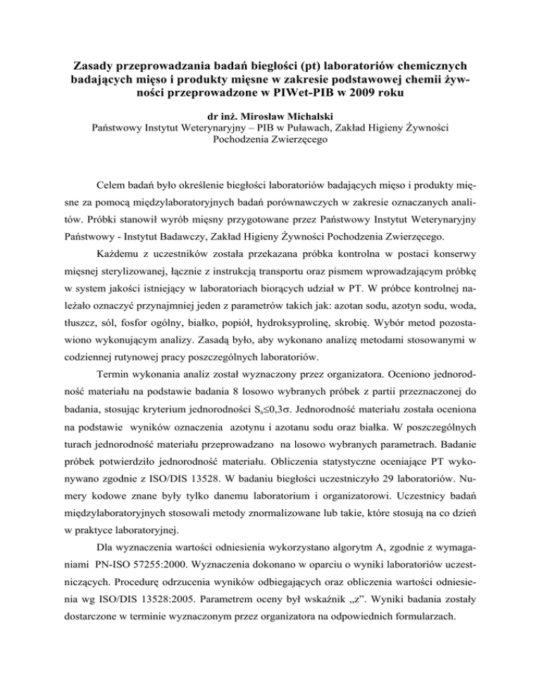 Zasady przeprowadzania badań biegłości (pt) laboratoriów chemicznych badających mięso i produkty mięsne w zakresie podstawowej chemii żywności przeprowadzone w PIWet-PIB w 2009 roku dr inż. Mirosław Michalski Państwowy Instytut Weterynaryjny – PIB w Puławach, Zakład Higieny Żywności Pochodzenia Zwierzęcego Celem badań było określenie biegłości laboratoriów badających mięso i produkty mięsne za pomocą międzylaboratoryjnych badań porównawczych w zakresie oznaczanych analitów. Próbki stanowił wyrób mięsny przygotowane przez Państwowy Instytut Weterynaryjny Państwowy - Instytut Badawczy, Zakład Higieny Żywności Pochodzenia Zwierzęcego. Każdemu z uczestników została przekazana próbka kontrolna w postaci konserwy mięsnej sterylizowanej, łącznie z instrukcją transportu oraz pismem wprowadzającym próbkę w system jakości istniejący w laboratoriach biorących udział w PT. W próbce kontrolnej należało oznaczyć przynajmniej jeden z parametrów takich jak: azotan sodu, azotyn sodu, woda, tłuszcz, sól, fosfor ogólny, białko, popiół, hydroksyprolinę, skrobię. Wybór metod pozostawiono wykonującym analizy. Zasadą było, aby wykonano analizę metodami stosowanymi w codziennej rutynowej pracy poszczególnych laboratoriów. Termin wykonania analiz został wyznaczony przez organizatora. Oceniono jednorodność materiału na podstawie badania 8 losowo wybranych próbek z partii przeznaczonej do badania, stosując kryterium jednorodności Ss≤0,3σ. Jednorodność materiału została oceniona na podstawie wyników oznaczenia azotynu i azotanu sodu oraz białka. W poszczególnych turach jednorodność materiału przeprowadzano na losowo wybranych parametrach. Badanie próbek potwierdziło jednorodność materiału. Obliczenia statystyczne oceniające PT wykonywano zgodnie z ISO/DIS 13528. W badaniu biegłości uczestniczyło 29 laboratoriów. Numery kodowe znane były tylko danemu laboratorium i organizatorowi. Uczestnicy badań międzylaboratoryjnych stosowali metody znormalizowane lub takie, które stosują na co dzień w praktyce laboratoryjnej. Dla wyznaczenia wartości odniesienia wykorzystano algorytm A, zgodnie z wymaganiami PN-ISO 57255:2000. Wyznaczenia dokonano w oparciu o wyniki laboratoriów uczestniczących. Procedurę odrzucenia wyników odbiegających oraz obliczenia wartości odniesienia wg ISO/DIS 13528:2005. Parametrem oceny był wskaźnik „z”. Wyniki badania zostały dostarczone w terminie wyznaczonym przez organizatora na odpowiednich formularzach. Osiągnięte rezultaty oceniono na podstawie wskaźnika „z”. Ponieważ rezultat otrzymany przez laboratorium może być większy lub mniejszy od „wartości odniesienia”, wartość wskaźnika „z” może przybierać wartości dodatnie lub ujemne. Ujemna wartość świadczy, że laboratorium wykryło mniejszy poziom analitu niż wynosi „wartość prawdziwa”. Wartość dodatnia wskaźnika „z” wskazuje, że laboratorium oznaczyło wyższy poziom analitu niż wynosi „wartość odniesienia”. Przyjęto następujące kryteria oceny laboratoriów na podstawie badań biegłości. | z| ≤ 2 = „zadawalający” 2 < | z| < 3 = „ wątpliwy” | z| ≥ 3 = „ niezadowalający” W przypadku uzyskania wyniku wątpliwego laboratorium powinno wdrożyć działania zapobiegawcze polegające na prześledzeniu toku analitycznego, przeglądu zapisów, stanu odczynników czy też rozmowy z analitykiem wykonującym analizy celem wykrycia i wyeliminowania niedociągnięć analitycznych. Uzyskanie z-score powyżej I3I skutkuje niezgodnością oraz wprowadzeniem procedury działań korygujących zgodnych z odpowiednimi normami i systemem jakości istniejącym w danym laboratorium. Po wprowadzeniu i zrealizowaniu działań zapobiegawczych lub korygujących zaleca się ponowne poddanie się badaniom PT aby potwierdzić w ten sposób „praktyczną” skuteczność tych działań.